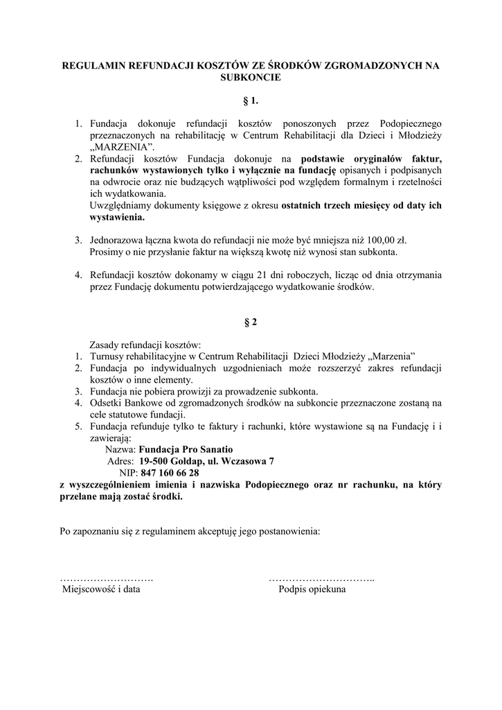 REGULAMIN REFUNDACJI KOSZTÓW ZE ŚRODKÓW ZGROMADZONYCH NA SUBKONCIE § 1. 1. Fundacja dokonuje refundacji kosztów ponoszonych przez Podopiecznego przeznaczonych na rehabilitację w Centrum Rehabilitacji dla Dzieci i Młodzieży „MARZENIA”. 2. Refundacji kosztów Fundacja dokonuje na podstawie oryginałów faktur, rachunków wystawionych tylko i wyłącznie na fundację opisanych i podpisanych na odwrocie oraz nie budzących wątpliwości pod względem formalnym i rzetelności ich wydatkowania. Uwzględniamy dokumenty księgowe z okresu ostatnich trzech miesięcy od daty ich wystawienia. 3. Jednorazowa łączna kwota do refundacji nie może być mniejsza niż 100,00 zł. Prosimy o nie przysłanie faktur na większą kwotę niż wynosi stan subkonta. 4. Refundacji kosztów dokonamy w ciągu 21 dni roboczych, licząc od dnia otrzymania przez Fundację dokumentu potwierdzającego wydatkowanie środków. §2 Zasady refundacji kosztów: 1. Turnusy rehabilitacyjne w Centrum Rehabilitacji Dzieci Młodzieży „Marzenia” 2. Fundacja po indywidualnych uzgodnieniach może rozszerzyć zakres refundacji kosztów o inne elementy. 3. Fundacja nie pobiera prowizji za prowadzenie subkonta. 4. Odsetki Bankowe od zgromadzonych środków na subkoncie przeznaczone zostaną na cele statutowe fundacji. 5. Fundacja refunduje tylko te faktury i rachunki, które wystawione są na Fundację i i zawierają: Nazwa: Fundacja Pro Sanatio Adres: 19-500 Gołdap, ul. Wczasowa 7 NIP: 847 160 66 28 z wyszczególnieniem imienia i nazwiska Podopiecznego oraz nr rachunku, na który przelane mają zostać środki. Po zapoznaniu się z regulaminem akceptuję jego postanowienia: ………………………. Miejscowość i data ………………………….. Podpis opiekuna