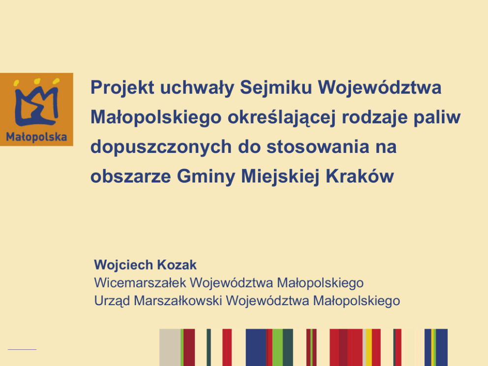 Projekt uchwały Sejmiku Województwa Małopolskiego określającej rodzaje paliw dopuszczonych do stosowania na obszarze Gminy Miejskiej Kraków Wojciech Kozak Wicemarszałek Województwa Małopolskiego Urząd Marszałkowski Województwa Małopolskiego I. Dlaczego wprowadzać w Krakowie ograniczenia stosowanych paliw? Bardzo wysokie zanieczyszczenie powietrza na tle Polski i Europy, Główna przyczyna zanieczyszczenia to “niska emisja”, Narażenie dużej liczby ludności, Negatywne oddziaływanie na zdrowie, Wysokie koszty pośrednie złej jakości powietrza, Potencjał techniczny sieci ciepłowniczej i gazowej, Oddziaływanie zanieczyszczeń na zabytki, Doświadczenia innych miast na świecie. Kraków jest najbardziej zanieczyszczonym miastem w Polsce Stężenie średnioroczne pyłu PM10 i PM2,5 co roku 2-krotnie przekracza poziom dopuszczalny, Liczba dni z przekroczeniami poziomu średniodobowego pyłu PM10 jest 5 do 7 razy większa niż dopuszczalne 35 dni w roku, Stężenie średnioroczne benzo(a)pirenu 10-krotnie przekracza poziom docelowy, Normy dla pyłu PM2,5 do roku 2020 zostaną zaostrzone z obecnych 27 µg/m³ do 20 µg/m³. Kraków numerem 3 najbardziej zanieczyszczonych miast Europy Obszar przekroczeń poziomu dopuszczalnego pyłu PM10 w Krakowie Obszar przekroczeń poziomu dopuszczalnego pyłu PM2,5 w Krakowie Niska emisja jest głównym powodem wysokich stężeń pyłu PM10 w Krakowie Narażenie dużej liczby ludności W Krakowie mieszka ¼ ludności Małopolski, niektóre szacunki wskazują nawet, że ok. 1 mln mieszkańców, ok. 90% mieszkańców Krakowa narażonych jest na przekroczenia poziomu średniodobowego PM10 i średniorocznego PM2,5, 100% mieszkańców Krakowa narażonych jest na przekroczenia poziomu docelowego benzo(a)pirenu. Wpływ zanieczyszczenia na zdrowie Skutki długotrwałego narażenia na pyły zawieszone obejmują: • • • • • przedwczesne zgony, w szczególności związane z chorobami układu krążenia, powikłania sercowo-naczyniowe, w tym zawał serca i udar mózgu, gorszy rozwój płuc oraz rozwój przewlekłych chorób układu oddechowego jak np. astma u dzieci, nowotwory, negatywny wpływ okołoporodowy, np. w postaci zwiększonej umieralności noworodków i niskiej masy urodzeniowej. Z powodu zanieczyszczenia powietrza pyłem w Krakowie umiera rocznie kilkaset osób. Redukcja poziomu pyłu PM2,5 do 25 μg/m³ zmniejszyłaby liczbę zgonów średnio o 232, a do poziomu 20 μg/m³ o 362. Negatywny wpływ zanieczyszczeń na dzieci Badania kobiet w ciąży i dzieci prowadzone przez Collegium Medicum UJ wykazały: mniejszą wagę urodzeniową, wzrost i obwód główki noworodków, słabszy rozwój intelektualny dzieci (strata średnio 3.8 pkt. w skali IQ), słabszą odporność dzieci w wieku późniejszym (m. in. zwiększone ryzyko występowania astmy i infekcji dróg oddechowych). Koszty złej jakości powietrza wydatki na opiekę zdrowotną, ponoszone bezpośrednio przez ludzi chorujących, wydatki w ramach państwowego systemu opieki zdrowotnej, koszty wynikające z mniejszej produktywności, w tym absencji w pracy, koszty związane z przedwczesną umieralnością, straty materialne wynikające z przyspieszonej degradacji zabytków, zmniejszony ruch turystyczny, mniejsza atrakcyjność Krakowa wśród potencjalnych inwestorów. Koszty złej jakości powietrza koszty zdrowotne zwiazane z emisją pyłu PM2,5 dla Krakowa szacuje się na 740 mln zł rocznie, nakłady na działania inwestycyjne w zakresie wymiany źródeł ogrzewania w Krakowie oszacowano na 435 mln zł do poniesienia w ciągu 5 lat. Infrastruktura ciepłownicza i gazowa 70% budynków w Krakowie podłączonych jest do sieci ciepłowniczej, prawie 100% pozostałych budynków jest podłączonych do sieci gazowej (łącznie 250 tys. odbiorców gazu w gospodarstwach domowych), na nielicznych pozostałych obszarach możliwe będzie zastosowanie ogrzewania elektrycznego, kotłów olejowych, zbiorników z gazem lub odnawialnych źródeł energii (np. pomp ciepła). Ochrona zabytków Krakowa Kraków od 1978 r. znajduje się na Liście Światowego Dziedzictwa UNESCO; posiada łącznie 1169 zabytków nieruchomych, Stężenia pyłów w okresie zimowym w komnatach Zamku Królewskiego na Wawelu są około 3-krotnie wyższe niż w lecie (badania AGH i Uniwersytetu w Antwerpii z 2006 r.), Cząstki te powodują brudzenie obiektów, ich mikro rysowanie, katalizowanie reakcji i zagrożenie mikrobiologiczne, Zmusza to do bardziej intensywnego sprzątania i oczyszczania obiektów, a w konsekwencji ich nadmiernego „stresu konserwatorskiego”, Obecność cząsteczek siarki i sadzy może powodować utratę koloru malowideł i koloru powierzchni dzieł sztuki. Przykłady innych miast Londyn od 1956 r. – zakaz stosowania paliw stałych obowiązuje również w wielu miastach Wlk. Brytanii (wyjątki dla paliw bezdymnych i autoryzowanych urządzeń), Dublin od 1990 r., w 2013 r. zakaz stosowania paliw stałych objął kolejne 7 miast w Irlandii, Christchurch (Nowa Zelandia) od 2008 r. obowiązuje zakaz używania kotłów starszych niż 15 lat, W 47 dużych miastach w Chinach w 2012 r. wprowadzono zakaz stosowania węgla, natomiast od 2015 r. zakaz ma objąć 113 miast, W Sacramento (USA) w 2007 r. wprowadzono zakaz stosowania drewna w zależności od prognozy stężenia pyłu PM2,5 (pow. 35µg/m³ można używać tylko autoryzowane kotły a pow. 40µg/m³ całkowity zakaz). II. Sposób wprowadzenia ograniczeń stosowania paliw stałych Podstawa prawna, Rodzaje paliw dopuszczonych do stosowania, Wyjątek dla instalacji przemysłowych, Kontrola realizacji uchwały, Termin wejścia w życie. Podstawa prawna Art. 96 ustawy Prawo ochrony środowiska: Sejmik województwa może, w drodze uchwały, w celu zapobieżenia negatywnemu oddziaływaniu na środowisko lub na zabytki określić dla terenu województwa bądź jego części rodzaje lub jakość paliw dopuszczonych do stosowania, a także sposó