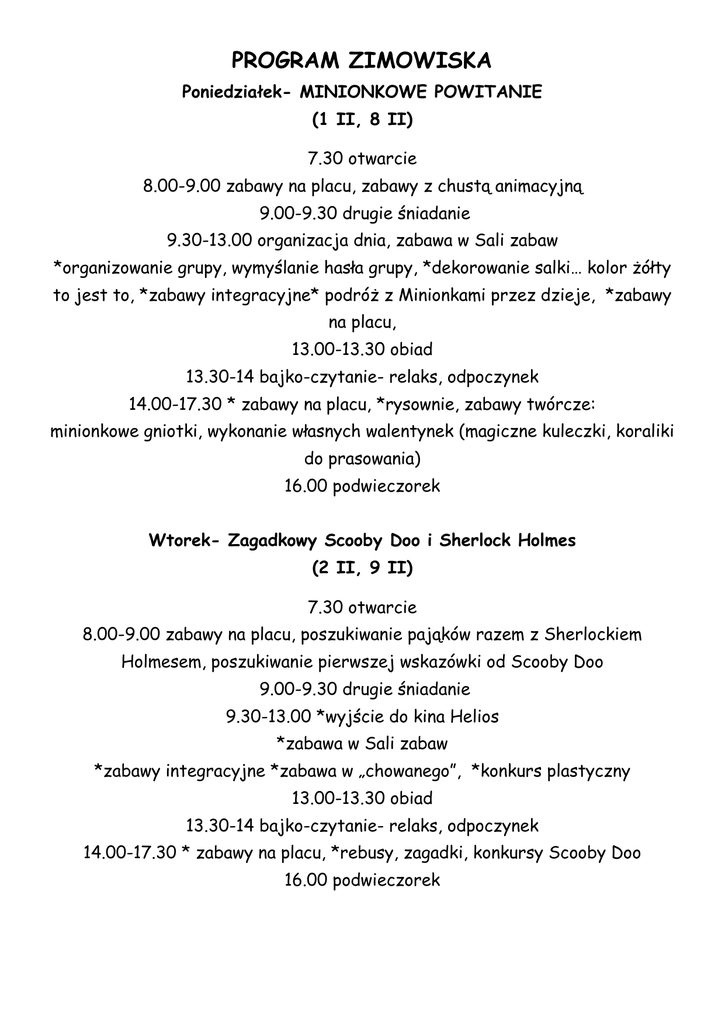 PROGRAM ZIMOWISKA Poniedziałek- MINIONKOWE POWITANIE (1 II, 8 II) 7.30 otwarcie 8.00-9.00 zabawy na placu, zabawy z chustą animacyjną 9.00-9.30 drugie śniadanie 9.30-13.00 organizacja dnia, zabawa w Sali zabaw *organizowanie grupy, wymyślanie hasła grupy, *dekorowanie salki… kolor żółty to jest to, *zabawy integracyjne* podróż z Minionkami przez dzieje, *zabawy na placu, 13.00-13.30 obiad 13.30-14 bajko-czytanie- relaks, odpoczynek 14.00-17.30 * zabawy na placu, *rysownie, zabawy twórcze: minionkowe gniotki, wykonanie własnych walentynek (magiczne kuleczki, koraliki do prasowania) 16.00 podwieczorek Wtorek- Zagadkowy Scooby Doo i Sherlock Holmes (2 II, 9 II) 7.30 otwarcie 8.00-9.00 zabawy na placu, poszukiwanie pająków razem z Sherlockiem Holmesem, poszukiwanie pierwszej wskazówki od Scooby Doo 9.00-9.30 drugie śniadanie 9.30-13.00 *wyjście do kina Helios *zabawa w Sali zabaw *zabawy integracyjne *zabawa w „chowanego”, *konkurs plastyczny 13.00-13.30 obiad 13.30-14 bajko-czytanie- relaks, odpoczynek 14.00-17.30 * zabawy na placu, *rebusy, zagadki, konkursy Scooby Doo 16.00 podwieczorek Środa – GWIEZDNE WOJNY KONTRA GWIEZDNY POKAZ MODY (3 II, 10 II) 7.30 otwarcie 8.00-9.00 zabawy na placu 9.00-9.30 drugie śniadanie 9.30-13.00 szkolenie na rycerzy Jedi, test wiedzy o Gwiezdnych Wojnach, *kącik piękności,: tatuaże, warkoczyki, przebieranki *zabawa w Sali zabaw *zabawy integracyjne * 13.00-13.30 obiad 13.30-14 bajko-czytanie- relaks, odpoczynek 14.00-17.30 * zabawy na placu, *poszukiwanie miecza świetlnego, * przygotowanie i pokaz mody na czerwonym dywanie 16.00 podwieczorek Czwartek- RATATUJ CZYLI GOTOWANIE NA ZAWOŁANIE (4 II, 11 II) 7.30 otwarcie 8.00-9.00 * zabawy z chustą animacyjną (sałatka owocowa, latający naleśnik), * zabawy na placu, tor przeszkód, 9.00-9.30 drugie śniadanie- samodzielne kanapek szykowanie 9.30-10.30 kręgle 12.00-13.30 obiad- Ratatuj się kto może czyli wspólne gotowanie 13.30-14.00 bajko-czytanie- relaks, odpoczynek 14.00-17.30 quiz kulinarny, szczurkowe konkursy, zabawy na placu, zabawy twórcze 15.30 podwieczorek- miksowanie, dekorowanie, ozdabianie … czyli słodkości do szpiku kości Piątek –…. Niech będzie zima-Kraina Lodu zaprasza (5 II, 12 II) 7.30 otwarcie 8.00-9.00 zabawy na placu, zabawy z chustą animacyjną, 9.00-9.30 drugie śniadanie 9.30-13.00 *zabawy na placu, zimowe konkurencje Elsy, mroźne malowanie buziaków, przygotowania do zimowego balu, 13.00-13.30 obiad 13.30-14 bajko-czytanie- relaks, odpoczynek 14.00-17.30 *zabawy taneczne,- Olaf zaprasza na disco* zabawy na placu, *rysownie, zabawy twórcze: 16.00 podwieczorek… w lodowej krainie Zastrzegamy sobie prawo do zmian w programie.