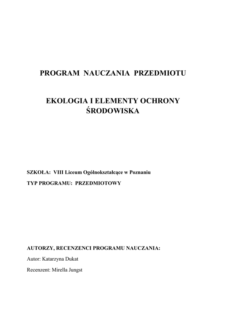 PROGRAM NAUCZANIA PRZEDMIOTU EKOLOGIA I ELEMENTY OCHRONY ŚRODOWISKA SZKOŁA: VIII Liceum Ogólnokształcące w Poznaniu TYP PROGRAMU: PRZEDMIOTOWY AUTORZY, RECENZENCI PROGRAMU NAUCZANIA: Autor: Katarzyna Dukat Recenzent: Mirella Jungst PODSTAWY PRAWNE: Program nauczania opracowany jest zgadnie z poniższymi aktami prawnymi: – Ustawą z dnia 19 sierpnia 2011 r. o zmianie ustawy o systemie oświaty oraz niektórych innych ustaw – Rozporządzeniem w sprawie ramowych planów nauczania z dnia 7 lutego 2012 r. – Rozporządzeniem w sprawie dopuszczenia do użytku w szkole programów wychowanie przedszkolnego i programów nauczania oraz dopuszczenia do użytku szkolnego podręczników z dnia 21 czerwca 2012 r. – Rozporządzeniem w sprawie warunków i sposobu oceniania, klasyfikowania i promowania uczniów i słuchaczy oraz przeprowadzania sprawdzianów i egzaminów w szkołach publicznych z dnia 30 kwietnia 2007 r. z późniejszymi zmianami. – Rozporządzeniem w sprawie podstawy programowej wychowania przedszkolnego oraz kształcenia ogólnego w poszczególnych typach szkół z dnia 27 sierpnia 2012 r. SPIS TREŚCI: 1. 2. 3. 4. 5. 6. 7. Wstęp – charakterystyka programu, założenia dydaktyczne i wychowawcze Szczegółowe cele edukacyjne kształcenia i wychowania Materiał nauczania Treść nauczania z opisem założonych osiągnięć uczniów, procedurami osiągania szczegółowych celów edukacyjnych oraz podziałem materiału nauczania. Propozycje form i metod pracy z uczniami. Propozycje metod kontroli i oceny osiągnięć uczniów. Bibliografia. 2 1. Wstęp – charakterystyka programu, założenia dydaktyczne i wychowawcze Program nauczania jest przewidziany do realizacji w ramach 30 godzin, w wymiarze 1 godziny tygodniowo w klasie pierwszej, w klasach, które będą realizowały biologię i chemię w zakresie rozszerzonym. Program ma na celu poszerzenie wiedzy uczniów z zakresu ekologii i elementów ochrony środowiska. Uzyskana wiedza z zakresu ekologii, pozwoli uczniom, lepiej zrozumieć problemy ochrony przyrody, zarówno dotyczące najbliższego środowiska jak i aspektów globalnego stanu środowiska. Duży nacisk położono na korzystanie z różnorodnych materiałów źródłowych, samodzielne wyszukiwanie informacji, ich analizę i wyciąganie wniosków. Ważne jest również aby młodzież miała możliwość pracy w zespołach oraz prezentowała swoje poglądy jak i rezultaty wspólnej pracy. 2. Szczegółowe cele edukacyjne kształcenia i wychowania W wyniku procesu kształcenia uczeń powinien wykazać się wiadomościami dotyczącymi: - zależności występujących między organizmami a środowiskiem, - struktury populacji, - zależności między populacjami, - struktury i funkcjonowania biecenoz i ekosystemów, - krążenia materii i przepływu energii w ekosystemach, - obiegu pierwiastków w przyrodzie, - przebiegu sukcesji ekologicznej, - cech biomów, - składników środowiska przyrodniczego, - zasobów naturalnych i gospodarowania nimi, - zanieczyszczenia i ochrony wód, powietrza i gleb, - rolnictwa ekologicznego, - idei zrównoważonego rozwoju. Uczeń powinien opanować umiejętności w zakresie: - biegłego posługiwania się terminologią biologiczną, - wyboru, wykorzystania i stosowania różnych źródeł wiedzy dla wyjaśnienia zjawisk i procesów biologicznych, - wyjaśniania związków strukturalno-funkcjonalnych na różnych poziomach organizacji biologicznej, - odnajdywania sposobów organizowania i neutralizowania negatywnych dla środowiska oddziaływań antropologicznych. Ponadto uczeń powinien prezentować postawy, przekonania i zainteresowania dotyczące: - kształtowania dociekliwej oraz aktywnej postawy badawczej poprzez poznanie języka biologii i metod poznania naukowego, - zainteresowania najnowszymi osiągnięciami ekologii, - świadomości zagrożeń cywilizacyjnych wynikających z działalności człowieka, 3 - przekonania o odpowiedzialności indywidualnej i zbiorowej za stan środowiska. 3. Materiał nauczania 1.Ekologia. 1.1.Szczeble organizacji materii żywej a ekologia. Podstawowe pojęcia ekologii. 1.2.Organizm i jego środowisko. Współzależność między organizmami a środowiskiem. 1.3.Typy interakcji między organizmami.. 1.4.Struktura i właściwości populacji. 1.5.Struktura troficzna i funkcjonowanie biocenoz. 1.6.Struktura i funkcjonowanie ekosystemów. 1.7.Zróżnicowanie ekosystemów wodnych 1.8.Cykle biogeochemiczne. 1.9.Sukcesja ekologiczna i jej znaczenie w przyrodzie. 1.10.Charakterystyka biomów. 2. Elementy ochrony środowiska 2.1.Elementy środowiska przyrodniczego. Człowiek a zasoby nieodnawialne. 2.2.Pozyskiwanie energii a zagrożenia dla środowiska. 2.3.Zanieczyszczenia i ochrona wód. 2.4.Zanieczyszczenia i ochrona powietrza atmosferycznego. 2.5.Hałas i wibracje – problem XXI wieku. 2.6. Rolnictwo ekologiczne. 2.7 Przyczyny degradacji gleb oraz ich ochrona i rekultywacja. 2.8 Idea zrównoważonego rozwoju. 2.9 Stan środowiska naszego regionu w świetle publikowanych materiałów. 4. Treść nauczania z opisem założonych osiągnięć uczniów, procedurami osiągania szczegółowych celów edukacyjnych oraz podziałem materiału nauczania. 4 PLAN WYNIKOWY NAUCZANIA EKOLOGIA I ELEMENTY OCHRONY ŚRODOWISKA Cele kształcenia L.p. 1 Temat Szczeble organizacji materii żywej a ekologia. Podstawowe pojęcia ekologii. Treści programowe Ekologia i sozologia jako dyscypliny biologii. Podział ekologii. ♦ ♦ ♦ 2 3 Organizm a środowisko. Współzależność między organizmami a środowiskiem. Czynniki biotyczne i abiotyczne. Tolerancja ekologiczna. Bioindykatory i gatunki wskaźnikowe. ♦ ♦ ♦ ♦ 4 Typy interakcji między Interakcje między organizmami w Wiadomości Uczeń: Określa zakres zainteresowań ekologii. Określa zakres zainteresowania: populacjologii, biocenologii, ekologii biosfery, ekologii opisowej, funkcjonalnej i ewolucyjnej, autekologii i synekologii. Definiuje terminy: osobni