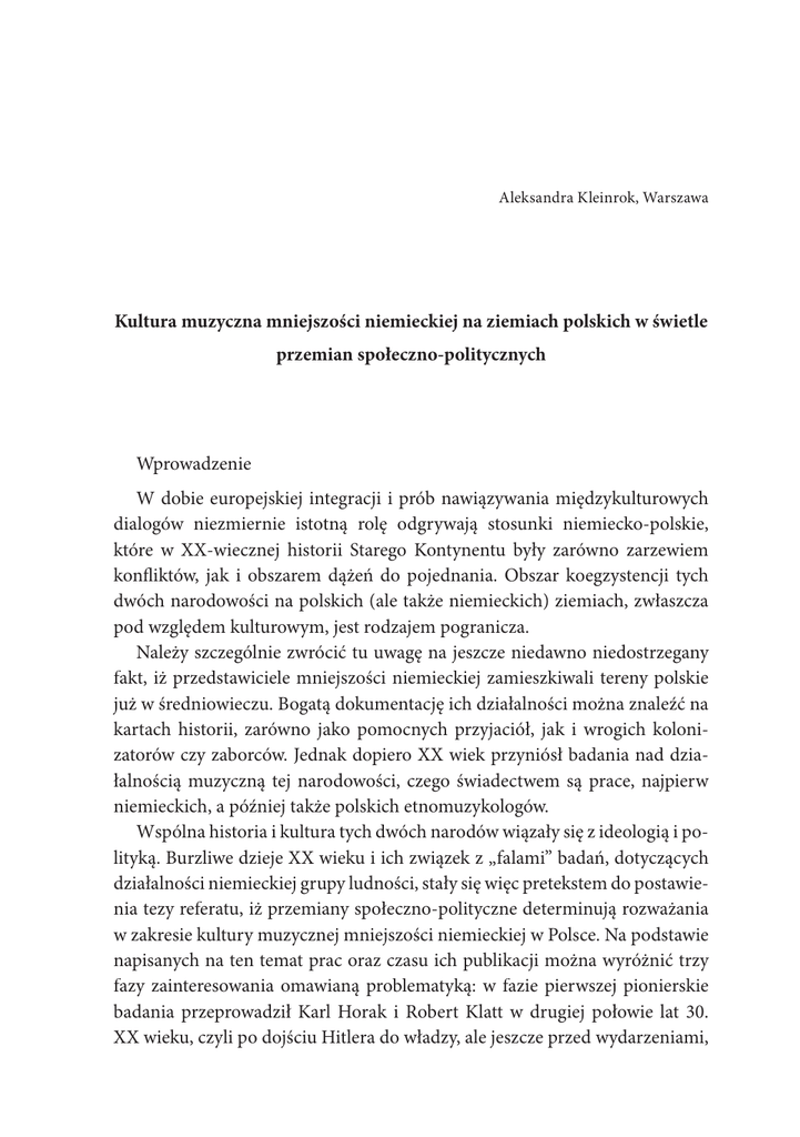 Aleksandra Kleinrok, Warszawa Kultura muzyczna mniejszości niemieckiej na ziemiach polskich w świetle przemian społeczno-politycznych Wprowadzenie W dobie europejskiej integracji i prób nawiązywania międzykulturowych dialogów niezmiernie istotną rolę odgrywają stosunki niemiecko-polskie, które w XX-wiecznej historii Starego Kontynentu były zarówno zarzewiem konfliktów, jak i obszarem dążeń do pojednania. Obszar koegzystencji tych dwóch narodowości na polskich (ale także niemieckich) ziemiach, zwłaszcza pod względem kulturowym, jest rodzajem pogranicza. Należy szczególnie zwrócić tu uwagę na jeszcze niedawno niedostrzegany fakt, iż przedstawiciele mniejszości niemieckiej zamieszkiwali tereny polskie już w średniowieczu. Bogatą dokumentację ich działalności można znaleźć na kartach historii, zarówno jako pomocnych przyjaciół, jak i wrogich kolonizatorów czy zaborców. Jednak dopiero XX wiek przyniósł badania nad działalnością muzyczną tej narodowości, czego świadectwem są prace, najpierw niemieckich, a później także polskich etnomuzykologów. Wspólna historia i kultura tych dwóch narodów wiązały się z ideologią i polityką. Burzliwe dzieje XX wieku i ich związek z „falami” badań, dotyczących działalności niemieckiej grupy ludności, stały się więc pretekstem do postawienia tezy referatu, iż przemiany społeczno-polityczne determinują rozważania w zakresie kultury muzycznej mniejszości niemieckiej w Polsce. Na podstawie napisanych na ten temat prac oraz czasu ich publikacji można wyróżnić trzy fazy zainteresowania omawianą problematyką: w fazie pierwszej pionierskie badania przeprowadził Karl Horak i Robert Klatt w drugiej połowie lat 30. XX wieku, czyli po dojściu Hitlera do władzy, ale jeszcze przed wydarzeniami, 2 Aleksandra Kleinrok które miały w późniejszym życiu naukowym badaczy odegrać istotną rolę; kolejną „falę” swoich zainteresowań kwestiami mniejszości niemieckiej można dostrzec u tego samego etnomuzykologa, Karla Horaka, który następne prace dotyczące ziem polskich opublikował w latach 60. po odwilży 1956 roku. Nie prowadził on już jednak badań terenowych w Polsce; ostatni okres prezentuje już badania polskich muzykologów, socjologów i historyków, którzy po przełomie 1989 roku mogli bez cenzury publikować swe prace na ten temat. Karl Horak i niemiecka „wyspa językowa” na terenach Polski międzywojennej Osoba profesora Karla Horaka, zasłużonego badacza tańca ludowego i etnomuzykologa nie jest dobrze znana w literaturze polskojęzycznej. Jeśli któryś z autorów poświęca miejsce w swej publikacji tej wybitnej i niezmiernie ważnej dla badań nad niemiecką mniejszością narodową postaci, czyni to jedynie w sposób wzmiankowy. Dla przykładu można tu podać artykuł Grażyny Władysławy Dąbrowskiej Muzyka i taniec ludowy atrybutem różnoetnicznej koegzystencji kulturalnej. Siła dyfuzji i percepcja1 oraz dwustronicowy fragment pracy Piotra Dahliga Tradycje muzyczne a ich przemiany. Między kulturą ludową, popularną i elitarną Polski międzywojennej2. Z kolei niemieckie źródła rzadko traktują o osobie samego badacza, korzystając raczej z jego tekstów dotyczących tańca w regionach Europy, w których można odnotować informacje na temat działalności niemieckich grup osadniczych. Niezmiernie istotnym faktem w świetle niniejszego referatu jest jednak nie tyle życie i różnorodność zainteresowań Karla Horaka, ale jego wkład w badania nad kulturą muzyczną mniejszości niemieckiej na ziemiach polskich. Bowiem właśnie on jako pierwszy podjął próby badań kręgów muzycznych, w których obracały się „wyspy językowe” (Sprachinseln). Niemieckojęzyczni mieszkańcy Polski, a także Węgier czy Słowacji, i ich działalność muzyczna pozostały w kręgu zainteresowań badacza przez znaczną część jego życia. Fakt ten jest dziś o tyle istotny i interesujący, że obrazuje zarówno działalność kulturalną niemieckiej mniejszości etnicznej, a pośrednio relacje zachodzące w miejscowościach zamieszkałych przez ludność niemiecką i polską, czyli Muzyka i taniec ludowy atrybutem różnoetnicznej koegzystencji kulturalnej. Siła dyfuzji i percepcja, w: „Biuletyn Polskiego Towarzystwa Etnochoreologicznego” nr 9/1998, s. 32; wzmianka ta jest jednak zamieszczona jedynie w przypisie. 2 Instytut Sztuki Polskiej Akademii Nauk, Warszawa 1998, s. 627-628. 1 Kultura muzyczna mniejszości niemieckiej na ziemiach polskich 3 miejscowościach pogranicza kulturowego, jak również to, w jaki sposób wpłynęły one na dalsze kształtowanie się tradycji, którą dziś określamy jako „polską”. Zatem Niemcy, żyjący na terenie Polski, musieli pozostawać pod wpływem otaczającego ich środowiska, co uwidacznia się w koneksjach repertuaru muzycznego tych dwóch narodów. Niemiecka działalność kulturalna, a szczególnie muzyczna, pretenduje w ten sposób do miana „pogranicza” dwóch kręgów kulturowych, pozostających w ścisłej zależności terytorialnej. Pierwszy okres działalności Horaka na ziemiach polskich przypadł na lata międzywojenne, a właściwie na okres tuż przed wybuchem II wojny światowej. Po raz pierwszy odwiedził on tereny środkowej Polski w 1935 roku. Badania na tym samym terenie powtórzył rok później, zapoznając się także z kulturą muzyczną „bielskiej wyspy językowej”, jak Horak sam ją nazywał. Powrócił zresztą jeszcze po raz ostatni w okolice Bielska-Białej w 1937 roku. Po tych badaniach powstał 4-zeszytowy zbiór Volkstänze der Deutschen in Mittelpolen (Tańce ludowe Niemców w środkowej Polsce)3. Horak prezentuje w nim 53 melodie taneczne wraz z opisami tańców, wykonywanych w okolicach Koła, Łodzi, Gostynina, Konina, Nieszawy czy Kalisza. Melodie w zdecydowanej większości (70%) utrzymane są w tonacjach systemu dur-moll. W tym samym czasie powstały także