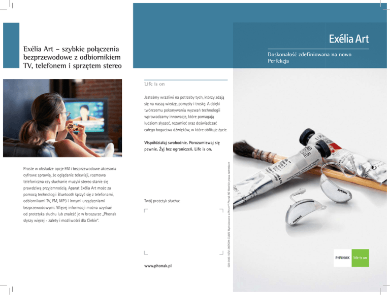 Exélia Art – szybkie połączenia bezprzewodowe z odbiornikiem TV, telefonem i sprzętem stereo Doskonałość zdefiniowana na nowo Perfekcja Life is on Jesteśmy wrażliwi na potrzeby tych, którzy zdają się na naszą wiedzę, pomysły i troskę. A dzięki twórczemu pokonywaniu wyzwań technologii wprowadzamy innowacje, które pomagają ludziom słyszeć, rozumieć oraz doświadczać całego bogactwa dźwięków, w które obfituje życie. Proste w obsłudze opcje FM i bezprzewodowe akcesoria cyfrowe sprawią, że oglądanie telewizji, rozmowa telefoniczna czy słuchanie muzyki stereo stanie się prawdziwą przyjemnością. Aparat Exélia Art może za pomocą technologii Bluetooth łączyć się z telefonami, odbiornikami TV, FM, MP3 i innymi urządzeniami bezprzewodowymi. Więcej informacji można uzyskać od protetyka słuchu lub znaleźć je w broszurze „Phonak słyszy więcej - zalety i możliwości dla Ciebie“. Twój protetyk słuchu: www.phonak.pl 028-0443-16/V1.00/2009-03/WU Wydrukowano w Polsce © Phonak AG Wszelkie prawa zastrzeżone Współdziałaj swobodnie. Porozumiewaj się pewnie. Żyj bez ograniczeń. Life is on. Exélia Art uwielbia wygrywać Exélia Art zaimponuje każdemu Nowa seria produktów Premium wykracza poza standardy określone dla aparatów słuchowych. Aparaty Exélia Art to doskonałe rozwiązanie przy niemal każdym stopniu ubytku słuchu. Można nadać im indywidualny charakter i dostosować do indywidualnych potrzeb. Użytkownicy aparatów zyskują dzięki zastosowanej w nich wyjątkowej technologii CORE firmy Phonak i procesorowi audio, najbardziej zaawansowanemu spośród dostępnych na rynku. Niniejsza broszura ma pomóc w wyborze najlepszego, najwydajniejszego, a zarazem prostego w obsłudze, trwałego i estetycznego aparatu z prostymi funkcjami łączności bezprzewodowej. Aparat Exélia Art pozwala czuć się swobodnie nawet w trudnych sytuacjach, kiedy słyszenie to prawdziwe wyzwanie. W zmieniających się warunkach codziennego życia wspiera on dyskretnie swojego użytkownika. Wszystkich pacjentów, którzy cenią sobie najwyższą jakość, czekają miłe niespodzianki. Dostępne kształty aparatów z serii Exélia Art DuoPhone W aparatach z serii Exélia Art po przyłożeniu słuchawki telefonicznej do ucha można słyszeć głos w słuchawce obojgiem uszu, co znacznie ułatwia rozmowę. Jednocześnie zachodzi redukcja dźwięków tła oraz wzrasta czystość odbieranego sygnału. Powyżej pokazano kilka wybranych modeli z całej gamy aparatów dostępnych na rynku: od maleńkich aparatów wewnątrzusznych do zausznych modeli o dużej mocy. SoundRecover Pomaga prowadzić rozmowę, rozumieć słowa wypowiadane kobiecym głosem, słyszeć dziecięcy śmiech i dźwięk budzika, a także śpiew ptaków, szum liści czy wysokie tony w muzyce. SoundFlow Funkcja ta odpowiada za naturalne przejścia między różnymi sytuacjami słuchowymi. Zaawansowana funkcja automatycznego zarządzania programami w każdej sytuacji szybko i płynnie tworzy idealne doznanie dźwiękowe. Technologia WhistleBlock Zastosowanie tej technologii pozwala uniknąć irytującego piszczenia pojawiającego się w trakcie przytulania kogoś bliskiego, noszenia nakrycia głowy, kasku czy zajadania się jabłkiem. ZoomControl z funkcją DirectTouch Nawet rozmowa, którą tak jak w samochodzie trudno prowadzić twarzą w twarz, może dać sporo satysfakcji. Wystarczy nastawić kierunek słyszenia w stronę rozmówcy w prawo, w lewo lub do tyłu. Wśród wielu dostępnych kolorów aparatów znajdują się zarówno kolory intensywne, jak i stonowane.