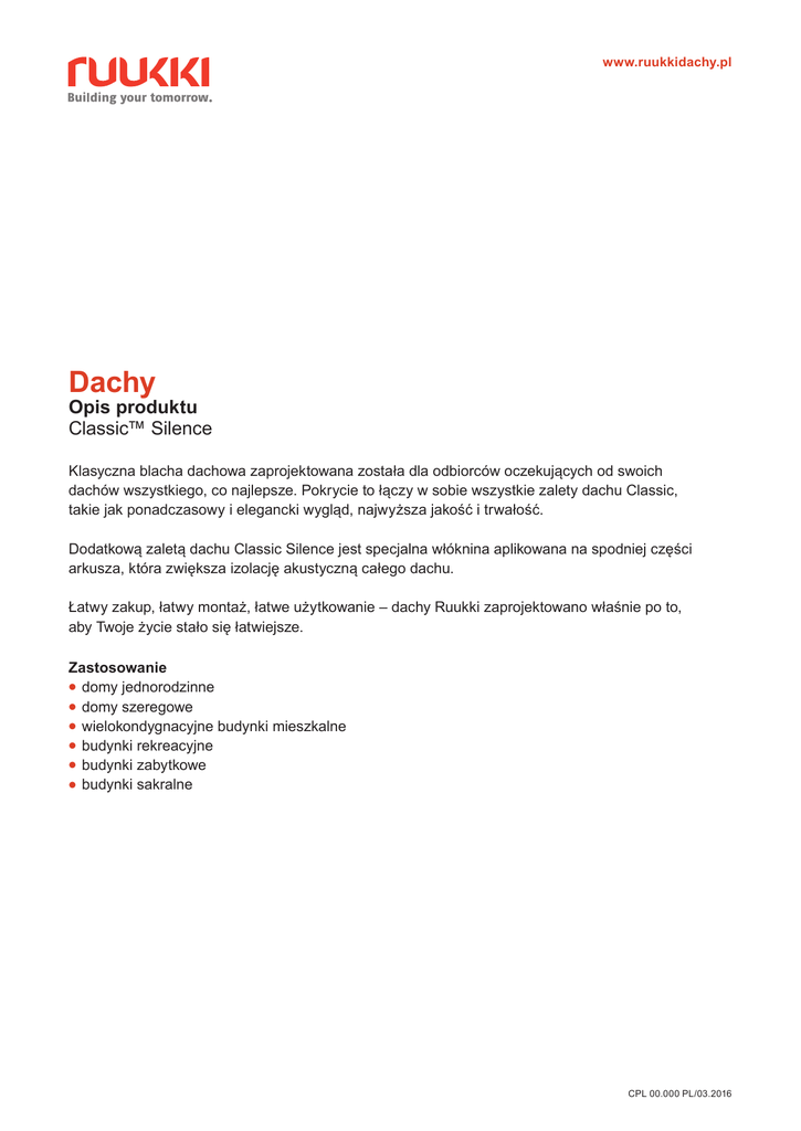 www.ruukkidachy.pl Dachy Opis produktu Classic™ Silence Klasyczna blacha dachowa zaprojektowana została dla odbiorców oczekujących od swoich dachów wszystkiego, co najlepsze. Pokrycie to łączy w sobie wszystkie zalety dachu Classic, takie jak ponadczasowy i elegancki wygląd, najwyższa jakość i trwałość. Dodatkową zaletą dachu Classic Silence jest specjalna włóknina aplikowana na spodniej części arkusza, która zwiększa izolację akustyczną całego dachu. Łatwy zakup, łatwy montaż, łatwe użytkowanie – dachy Ruukki zaprojektowano właśnie po to, aby Twoje życie stało się łatwiejsze. Zastosowanie •domy jednorodzinne •domy szeregowe •wielokondygnacyjne budynki mieszkalne •budynki rekreacyjne •budynki zabytkowe •budynki sakralne CPL 00.000 PL/03.2016 • Produkt EN 14782 Nazwa Classic™ Silence Kod SR35-475C Wysokość rąbka 32 mm Szerokość efektywna 475 mm Szerokość całkowita 505 mm Długość maksymalna 10 000 mm Długość minimalna 800 mm Minimalny spadek 8° Minimalny spadek dachu przy łączeniu na długości 14° Zakład poprzeczny 200 mm Jednostka sprzedaży m² 475 32 SR35-475C 25 • Materiał PN-EN 10346 Blacha stalowa powlekana PN-EN 10169 SR35-475C 32 Blacha stalowa ocynkowana Widok z przodu 475 • Tolerancje Produkt PN-EN 508-1 Materiał PN-EN 10143 Widok od spodu L = 800 – 10000 mm • Kolory Ruukki® 50 PlusCzarny, Antracytowy, Grafitowy, Czekoladowobrązowy Widok z boku • Specyfikacja materiału Classic Klasa jakości Grubość nominalna (mm) Masa (kg/m²) Powłoka Minimalna ilość cynku (g/m²) Ruukki® 50 Plus 0,50 5,2 Pural mat wytłaczany 275 (PN-EN10143) • Kontakt CPL 00.000 PL/03.2016 Ruukki Polska Sp. z o.o. tel. +48 46 85 81 600 Fax +48 46 85 81 609 www.ruukkidachy.pl W związku z prowadzonymi pracami badawczymi i rozwojem proponowanego systemu, Ruukki Polska Sp. z o.o. zastrzega sobie prawo do zmian lub poprawek treści zawartej w powyższym opracowaniu bez wcześniejszego uprzedzenia. Niniejsze opracowanie nie stanowi oferty w rozumieniu prawnym. Copyright © 2016 Rautaruukki Corporation. Wszelkie prawa zastrzeżone. Ruukki i nazwy produktów Ruukki stanowią znaki handlowe lub zarejestrowane znaki handlowe Rautaruukki Corporation, spółki zależnej SSAB.