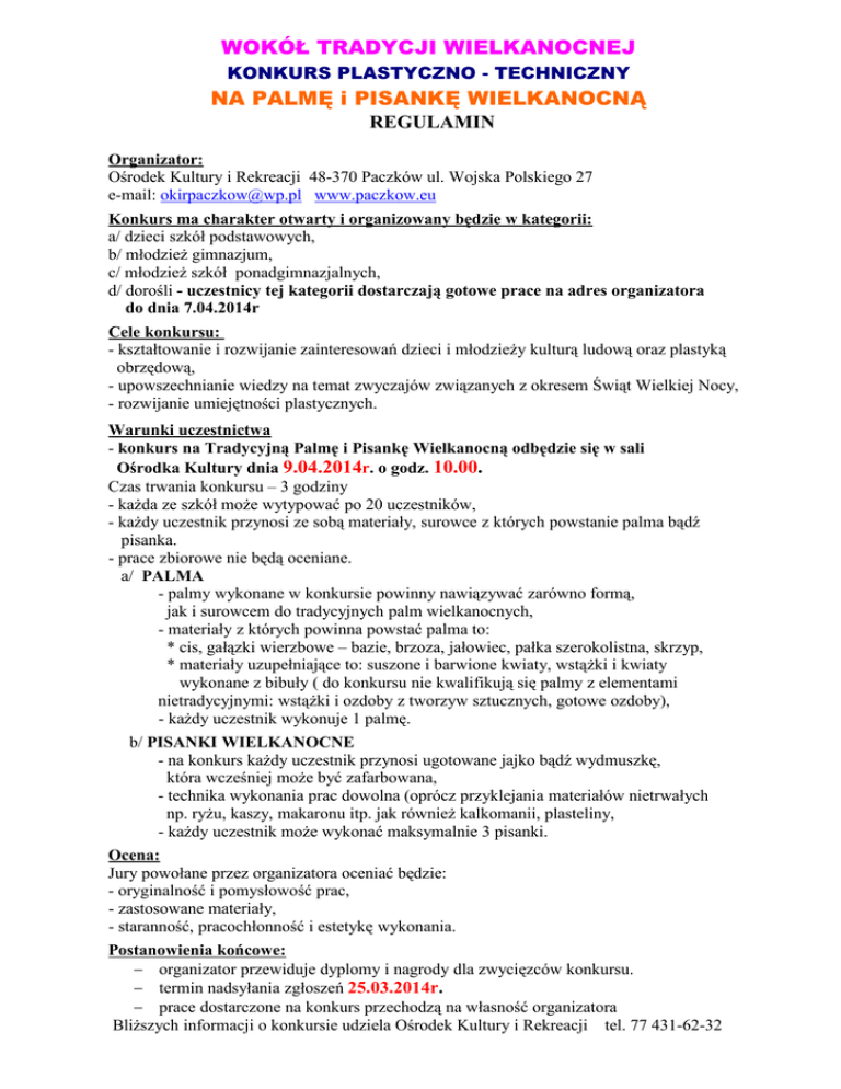 WOKÓŁ TRADYCJI WIELKANOCNEJ KONKURS PLASTYCZNO - TECHNICZNY NA PALMĘ i PISANKĘ WIELKANOCNĄ REGULAMIN Organizator: Ośrodek Kultury i Rekreacji 48-370 Paczków ul. Wojska Polskiego 27 e-mail: [email protected] www.paczkow.eu Konkurs ma charakter otwarty i organizowany będzie w kategorii: a/ dzieci szkół podstawowych, b/ młodzież gimnazjum, c/ młodzież szkół ponadgimnazjalnych, d/ dorośli - uczestnicy tej kategorii dostarczają gotowe prace na adres organizatora do dnia 7.04.2014r Cele konkursu: - kształtowanie i rozwijanie zainteresowań dzieci i młodzieży kulturą ludową oraz plastyką obrzędową, - upowszechnianie wiedzy na temat zwyczajów związanych z okresem Świąt Wielkiej Nocy, - rozwijanie umiejętności plastycznych. Warunki uczestnictwa - konkurs na Tradycyjną Palmę i Pisankę Wielkanocną odbędzie się w sali Ośrodka Kultury dnia 9.04.2014r. o godz. 10.00. Czas trwania konkursu – 3 godziny - każda ze szkół może wytypować po 20 uczestników, - każdy uczestnik przynosi ze sobą materiały, surowce z których powstanie palma bądź pisanka. - prace zbiorowe nie będą oceniane. a/ PALMA - palmy wykonane w konkursie powinny nawiązywać zarówno formą, jak i surowcem do tradycyjnych palm wielkanocnych, - materiały z których powinna powstać palma to: * cis, gałązki wierzbowe – bazie, brzoza, jałowiec, pałka szerokolistna, skrzyp, * materiały uzupełniające to: suszone i barwione kwiaty, wstążki i kwiaty wykonane z bibuły ( do konkursu nie kwalifikują się palmy z elementami nietradycyjnymi: wstążki i ozdoby z tworzyw sztucznych, gotowe ozdoby), - każdy uczestnik wykonuje 1 palmę. b/ PISANKI WIELKANOCNE - na konkurs każdy uczestnik przynosi ugotowane jajko bądź wydmuszkę, która wcześniej może być zafarbowana, - technika wykonania prac dowolna (oprócz przyklejania materiałów nietrwałych np. ryżu, kaszy, makaronu itp. jak również kalkomanii, plasteliny, - każdy uczestnik może wykonać maksymalnie 3 pisanki. Ocena: Jury powołane przez organizatora oceniać będzie: - oryginalność i pomysłowość prac, - zastosowane materiały, - staranność, pracochłonność i estetykę wykonania. Postanowienia końcowe: − organizator przewiduje dyplomy i nagrody dla zwycięzców konkursu. − termin nadsyłania zgłoszeń 25.03.2014r. − prace dostarczone na konkurs przechodzą na własność organizatora Bliższych informacji o konkursie udziela Ośrodek Kultury i Rekreacji tel. 77 431-62-32 KARTA ZGŁOSZENIA UCZESTNIKÓW WOKÓŁ TRADYCJI WIELKANOCNEJ KONKURS PLASTYCZNO - TECHNICZNY Termin zgłoszenia do 25.03.2014r Lp. 1 Imię i nazwisko klasa 2 3 4 5 6 7 8 9 10 11 12 13 14 15 16 17 18 19 20 ____________________________ pieczątka szkoły i podpis