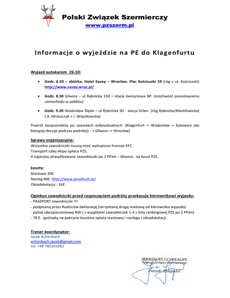 Polski Związek Szermierczy www.pzszerm.pl Informacje o wyjeździe na PE do Klagenfurtu Wyjazd autokarem 26.10: Godz. 6.50 – zbiórka. Hotel Savoy – Wrocław. Plac Kościuszki 19 (róg z ul. Kościuszki) http://www.savoy.wroc.pl/ Godz. 8.30 Gliwice – ul Rybnicka 150 – stacja benzynowa BP. (możliwość pozostawienia samochodu w pobliżu) Godz. 9.30 Wodzisław Śląski – ul Rybnicka 30 - stacja Orlen (róg Rybnicka/Marklowicka) ( A. Mroszczak + I. Wójcikowska) Powrót bezpośrednio po zawodach indywidualnych. (Klagenfurt--> Wodzisław--> Katowice (do bieżącej decyzji podczas podróży)-- > Gliwice--> Wrocław) Sprawy organizacyjne: Wszystkie zawodniczki muszą mieć wykupione licencje EFC Transport całej ekipy opłaca PZS. 4 najwyżej sklasyfikowane zawodniczki po 2 PPJm – Gliwice: na koszt PZS. koszty: Startowe 20E Nocleg 40E http://www.jerolitsch.at/ Obiadokolacja - 16E Opiekun zawodniczki przed rozpoczęciem podróży przekazuje kierownikowi wyjazdu: - PASZPORT zawodniczki !!! - podpisaną przez Rodziców deklarację (otrzymaną drogą mailową od kierownika wyjazdu) - polisę ubezpieczeniową NW ( z wyjątkiem zawodniczek 1-4 z listy rankingowej PZS po 2 PPJm) - 76 E - gotówką na pokrycie kosztów opłaty startowej i noclegu i obiadokolacji. Trener koordynator: Jacek Achenbach [email protected] tel: +48 785101082