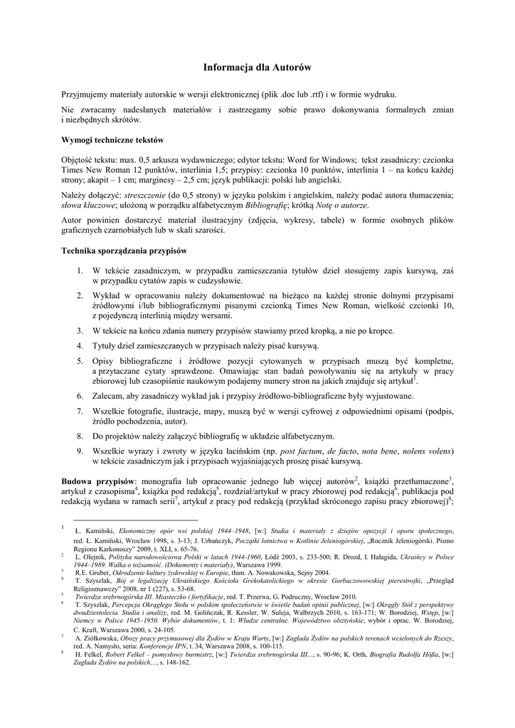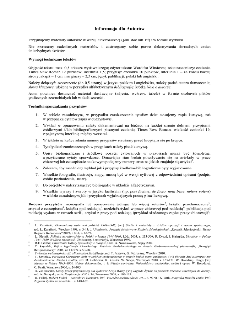 Informacja dla Autorów Przyjmujemy materiały autorskie w wersji elektronicznej (plik .doc lub .rtf) i w formie wydruku. Nie zwracamy nadesłanych materiałów i zastrzegamy sobie prawo dokonywania formalnych zmian i niezbędnych skrótów. Wymogi techniczne tekstów Objętość tekstu: max. 0,5 arkusza wydawniczego; edytor tekstu: Word for Windows; tekst zasadniczy: czcionka Times New Roman 12 punktów, interlinia 1,5; przypisy: czcionka 10 punktów, interlinia 1 – na końcu każdej strony; akapit – 1 cm; marginesy – 2,5 cm; język publikacji: polski lub angielski. Należy dołączyć: streszczenie (do 0,5 strony) w języku polskim i angielskim, należy podać autora tłumaczenia; słowa kluczowe; ułożoną w porządku alfabetycznym Bibliografię; krótką Notę o autorze. Autor powinien dostarczyć materiał ilustracyjny (zdjęcia, wykresy, tabele) w formie osobnych plików graficznych czarnobiałych lub w skali szarości. Technika sporządzania przypisów 1. W tekście zasadniczym, w przypadku zamieszczania tytułów dzieł stosujemy zapis kursywą, zaś w przypadku cytatów zapis w cudzysłowie. 2. Wykład w opracowaniu należy dokumentować na bieżąco na każdej stronie dolnymi przypisami źródłowymi i/lub bibliograficznymi pisanymi czcionką Times New Roman, wielkość czcionki 10, z pojedynczą interlinią między wersami. 3. W tekście na końcu zdania numery przypisów stawiamy przed kropką, a nie po kropce. 4. Tytuły dzieł zamieszczanych w przypisach należy pisać kursywą. 5. Opisy bibliograficzne i źródłowe pozycji cytowanych w przypisach muszą być kompletne, a przytaczane cytaty sprawdzone. Omawiając stan badań powoływaniu się na artykuły w pracy zbiorowej lub czasopiśmie naukowym podajemy numery stron na jakich znajduje się artykuł1. 6. Zalecam, aby zasadniczy wykład jak i przypisy źródłowo-bibliograficzne były wyjustowane. 7. Wszelkie fotografie, ilustracje, mapy, muszą być w wersji cyfrowej z odpowiednimi opisami (podpis, źródło pochodzenia, autor). 8. Do projektów należy załączyć bibliografię w układzie alfabetycznym. 9. Wszelkie wyrazy i zwroty w języku łacińskim (np. post factum, de facto, nota bene, nolens volens) w tekście zasadniczym jak i przypisach wyjaśniających proszę pisać kursywą. Budowa przypisów: monografia lub opracowanie jednego lub więcej autorów2, książki przetłumaczone3, artykuł z czasopisma4, książka pod redakcją5, rozdział/artykuł w pracy zbiorowej pod redakcją6, publikacja pod redakcją wydana w ramach serii7, artykuł z pracy pod redakcją (przykład skróconego zapisu pracy zbiorowej)8; 1 2 3 4 5 6 7 8 Ł. Kamiński, Ekonomiczny opór wsi polskiej 1944–1948, [w:] Studia i materiały z dziejów opozycji i oporu społecznego, red. Ł. Kamiński, Wrocław 1998, s. 3-13; J. Urbańczyk, Początki lotnictwa w Kotlinie Jeleniogórskiej, „Rocznik Jeleniogórski. Pismo Regionu Karkonoszy” 2009, t. XLI, s. 65-76. L. Olejnik, Polityka narodowościowa Polski w latach 1944-1960, Łódź 2003, s. 233-500; R. Drozd, I. Hałagida, Ukraińcy w Polsce 1944–1989. Walka o tożsamość. (Dokumenty i materiały), Warszawa 1999. R.E. Gruber, Odrodzenie kultury żydowskiej w Europie, tłum. A. Nowakowska, Sejny 2004. T. Szyszlak, Bój o legalizację Ukraińskiego Kościoła Grekokatolickiego w okresie Gorbaczowowskiej pierestrojki, „Przegląd Religioznawczy” 2008, nr 1 (227), s. 53-68. Twierdza srebrnogórska III. Miasteczko i fortyfikacje, red. T. Przerwa, G. Podruczny, Wrocław 2010. T. Szyszlak, Percepcja Okrągłego Stołu w polskim społeczeństwie w świetle badań opinii publicznej, [w:] Okrągły Stół z perspektywy dwudziestolecia. Studia i analizy, red. M. Golińczak, R. Kessler, W. Suleja, Wałbrzych 2010, s. 163-171; W. Borodziej, Wstęp, [w:] Niemcy w Polsce 1945–1950. Wybór dokumentów, t. 1: Władze centralne. Województwo olsztyńskie, wybór i oprac. W. Borodziej, C. Kraft, Warszawa 2000, s. 24-105. A. Ziółkowska, Obozy pracy przymusowej dla Żydów w Kraju Warty, [w:] Zagłada Żydów na polskich terenach wcielonych do Rzeszy, red. A. Namysło, seria: Konferencje IPN, t. 34, Warszawa 2008, s. 100-115. H. Felkel, Robert Felkel – pomysłowy burmistrz, [w:] Twierdza srebrnogórska III..., s. 90-96; K. Orth, Biografia Rudolfa Hößa, [w:] Zagłada Żydów na polskich…, s. 148-162. zapisu artykuł prasowy - dziennik9, tygodnik i miesięcznik10, strona internetowa11 (tylko adres strony głównej, bez rozszerzeń, w nawiasie data odczytu); strona internetowa w przypadku tekstów, których autorzy są znani12), źródła archiwalne (nazwa archiwum, nazwa zespołu archiwalnego, sygnatura teczki, nazwa/tytuł dokumentu, strona/karta dokumentu na który się powołujemy)13, źródła archiwalne już opublikowane14, źródła i materiały ze zbiorów bibliotek15 lub prywatnych16, relacja-wywiad17, informacje pozyskane drogą korespondencji pocztą tradycyjną18 lub elektroniczną19. Proszę stosować w przypisach terminy łacińskie pisane kursywą: ibidem (odnosi się do przypisu wcześniejszego, gdzie występuje zapis jednej publikacji20 lub więcej niż jedna21, ale pozostają te same strony22), idem, eadem, op. cit. (jeśli w artykule odwołujemy się więcej niż jeden raz do jedynej w tekście pracy danego autora lub autorów)23, jeśli w artykule danego autora cytujemy kolejny raz poszczególne jego publikacje należy stosować konsekwentnie skrócony zapis tytułów24, natomiast nie dotyczy to już zapisów źródeł archiwalnych25. Budowa bibliografii: Jedynak T., Stasiak K., Komentarz do ustawy o kuratorach sądowych, Warszawa 2008. Konopczyński M., Kryzys resocjalizacji czy(li) sukces działań pozornych: refleksje wokół polskiej rzeczywistości resocjalizacyjnej, Warszawa 2013. Konopczyński M., Metody twórczej resocjalizacji. Teoria i praktyka wychowawcza, Warszawa 2007. Kwadrans Ł. Charakterystyka systemu profilaktyki i resocjalizacji nieletnich w Polsce. Pro