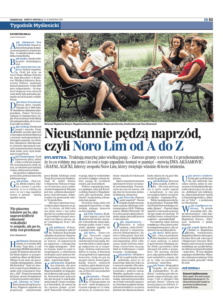 B 03 SOBOTA–NIEDZIELA, 15–16 WRZEŚNIA 2012 Tygodnik Myślenicki KATARZYNA HOŁUJ [email protected] A jak Akšamović Ewa i Alicki Rafał. On jest założycielemgrupy,kompozytorem pianistą i aranżerem. Ona – to autorka teksów, wokalistka i menedżerka. jak bardzo. Bardzo lubimy grać! – stwierdzają razem. jak charytatywne imprezy. Sami je organizują. Grali już m.in. na rzecz Domu Małego Dziecka im. Jana Brzechwy w Krakowie, Wielkiej Orkiestry Świątecznej Pomocy (pamiętny koncert plenerowy z roku 2005 przy temperaturze – 18 stopnia Celsjusza) oraz chorych osób, kiedy były potrzebne pieniądze na ich leczenie i rehabilitację. jak Dzieci Przestrzeni. Trzecia płyta zespołu. Ukazała się w 2008 roku. W charakterze odmienna od poprzedniej. „Taniec” był żywy, radosny, ta romantyczna i ciepła. Praca nad nią trwała dłużej niż nad poprzednią, ale to wyszło jej tylko na dobre. jak ewolucja. Ewoluował zespół i muzyka. Pasja Rafała zaczęła zmierzać w kierunku stylistyki filmowej i utworów instrumentalnych. Następnie pojawiły się teksty Ewy Akšamović. Dziś dwa nurty: utworów śpiewanych i muzyki instrumentalnej istnieją obok siebie, przy czym dominuje ten pierwszy. jak Fatamorgana. Tytuł najnowszej płyty, piątej z kolei w historii zespołu. Od wcześniejszych różni się tym, że tekstowo jest bardziej realna, mniej marzycielska. Jej premiera zaplanowana jest na dziś, podczas koncertu jubileuszowego. jak gramy. – Dość często. Bardzo chętnie. Zawsze z sercem. I z przekonaniem, że to co robimy ma sens i że coś z tego zapadnie komuś w pamięć – mówią zgodnie razem. B C E F G Nie piszemy tekstów po to, aby usprawiedliwić obecność wokalistki w zespole, ale po to, żeby coś przekazać Ewa Aksamović jak historia. Zaczyna się od daty 15 września 2002 roku. Tego dnia, w sali kameralnej MOKiS narodził się zespół. W tamtym okresie Rafał Alicki dopiero co przeprowadził się z Iławy do Myślenic. Nikogo tu nie znał, ale pracował jako akompaniator „Ziemi Myślenickiej”. Stąd też obecność w pierwszym składzie zespołu osób związanych właśnie z „ZM”. Pomysł na muzykę był jasny: utwory fortepianowe z towarzyszeniem smyczków. jak „Idziemy za Tobą”. Rozważania Drogi Krzyżowej. Najpierw pojawiła się propozycja namalowania H I FOT. ALMA SPEI D Od lewej: Magdalena Ślósarz, Magdalena Kiszka, Rafał Alicki, Małgorzata Górecka, Ewelina Korczak i Ewa Akšamović Nieustannie pędzą naprzód, czyli Noro Lim od A do Z Traktują muzykę jako wielką pasję. – Zawsze gramy z sercem. I z przekonaniem, że to co robimy ma sens i że coś z tego zapadnie komuś w pamięć – mówią EWA AKŠAMOVIĆ i RAFAŁ ALICKI, liderzy zespołu Noro Lim, który świętuje właśnie 10-lecie istnienia. SYLWETKA. przez Rafała Alickiego stacji Drogi Krzyżowej do Sanktuarium bł. Anieli Salawy w Sieprawiu. Podczas trwającej 16 miesięcy pracy jednocześnie komponował. Muzyka jest więc „efektem ubocznym” pracy nad obrazami. Jednocześnie też powstawały teksty. Te pisała Ewa. – Dla nas to ogromna rzecz. I jedyna płyta nagrana na żywo. Co istotne, od 2009 roku ani jedno słowo i ani jeden dźwięk nie zostały zmienione. W pozostałych naszych utworach to się zdarza, utwory „żyją” i zmieniają się. Te nie – mówi Ewa. jak jubileusz. 10-lecie. Dziś z tej okazji w auli LO im. Tadeusza Kościuszki odbędzie się koncert. Repertuar pierwszej części to wybrane utwory, od najstarszych po najnowsze, i wzbogacony o te nigdy nienagrane. – Krótko mówiąc, będzie to część retrospektywna, w odróżnieniu od drugiej części podczas której będziemy promować nową płytę – zapowiada Rafał. jak koncerty. Zespół nie ma ciśnienia, aby grać wszędzie, żeby przeżyć. Mają ten komfort, że mogą granie traktować jako pasję, hobby. Doświadczenie nauczyło ich, aby nie grać w salach gimnastycznych. Często występują w kościołach, ale marzy im się częstsze granie „cywilnych” koncertów. Utwory, któ- J K re grają, także te wydawałoby się stricte religijne, równie dobrze pasują do cywilnych wnętrz, jak i kościelnych. Dobrze wspominają miejsca spokojne, takie jak Krynica-Zdrój, Zamek w Niepołomicach albo myślenicki „Dom Grecki”, bo jak mówią, ich muzyka tam pasuje. Na koncie mają około 250 zagranych koncertów, co daje średnią jednego koncertu na dwa tygodnie. jak Lida Tomasz. Realizator nagrań, a przy tym człowiek bardzo starannie wykształcony muzycznie, którego trafne oceny i wskazówki głęboko zapadły im w pamięć i dużo dały. jak łatwo. – Łatwo nie jest. Tworzenie czegoś kosztuje. Czasem praca nad dźwiękiem lub myślą, którą trzeba ubrać w słowa wymaga wyłączenia się ze wszystkiego. Rodziny niekoniecznie dobrze to znoszą. Z łatwością nie przychodzi też organizacja koncertów, kiedy nie gra się muzyki znanej, komercyjnej. Każdy koncert, zwłaszcza w miejscu, gdzie dotąd nie graliśmy, jest osiągnięciem. Znaczy, że ktoś chce nas posłuchać – mówi Ewa. jak muzyka. – Powstaje, gdy gotowe są teksty. Przyzwyczajam się do nich – mówi kompozytor. Czasem zajmuje to 1,5 roku, ale bywa, że wystarczy kwa- L Ł M drans i muzyka do tekstu jest gotowa. Oprócz muzyki do utworów śpiewanych tworzy też muzykę instrumentalną. Towarzyszyła mu ona od zawsze, tak jak chęć do tworzenia stylizacji filmowej, obrazowej. jak Noro Lim. Oznacza „pędź naprzód”. Nazwa zespołu została zaczerpnięta z języka elfickiego stworzonego przez J.R.R. Tolkiena, autora „Władcy Pierścieni”. Elfy to fascynacja założyciela zespołu, mająca początki jeszcze w dzieciństwie. jak organizatorzy. – Właściwie to ludzie i miejsca: „Dom Grecki”, Stary Kościół w Sieprawiu, Dworek Białoprądnicki, Zamek w Dobczycach, Dom Kultury w Krakowie-Mydlnikach oraz impresariat „Artos” z Rzeszowa, dzięki któremu dotarliśmy z koncer