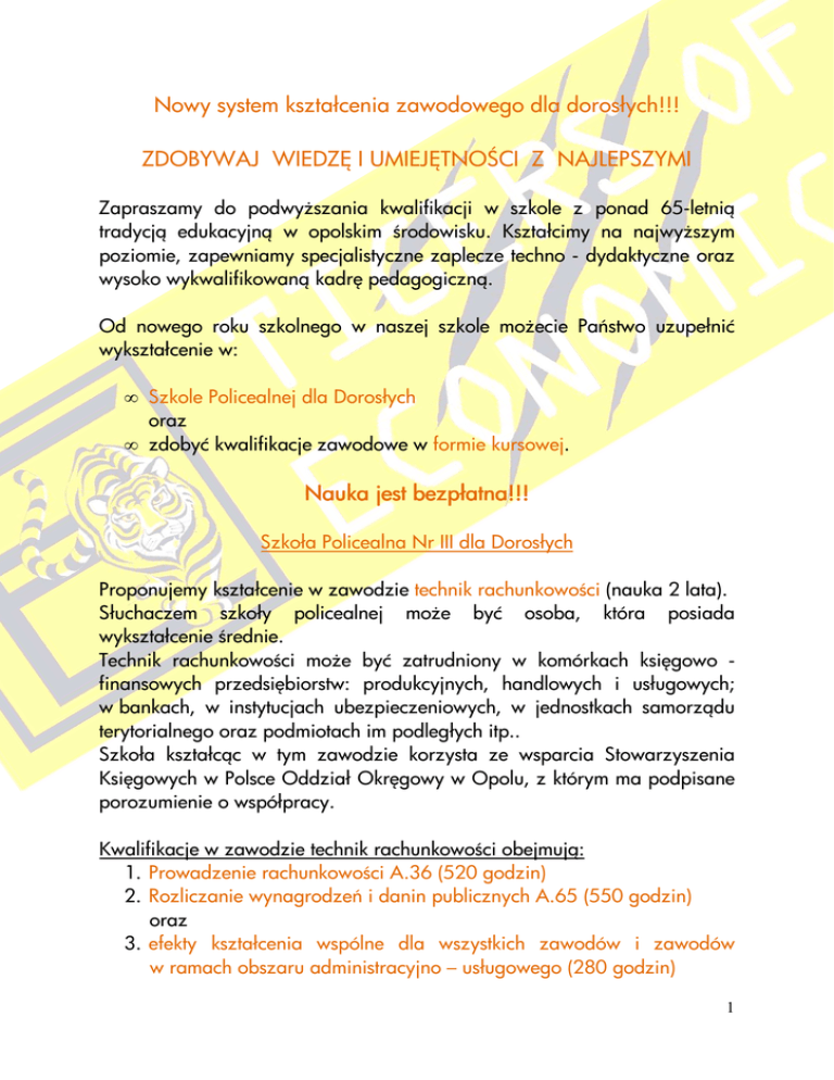 Nowy system kształcenia zawodowego dla dorosłych!!! ZDOBYWAJ WIEDZĘ I UMIEJĘTNOŚCI Z NAJLEPSZYMI Zapraszamy do podwyŜszania kwalifikacji w szkole z ponad 65-letnią tradycją edukacyjną w opolskim środowisku. Kształcimy na najwyŜszym poziomie, zapewniamy specjalistyczne zaplecze techno - dydaktyczne oraz wysoko wykwalifikowaną kadrę pedagogiczną. Od nowego roku szkolnego w naszej szkole moŜecie Państwo uzupełnić wykształcenie w: • Szkole Policealnej dla Dorosłych oraz • zdobyć kwalifikacje zawodowe w formie kursowej. Nauka jest bezpłatna!!! Szkoła Policealna Nr III dla Dorosłych Proponujemy kształcenie w zawodzie technik rachunkowości (nauka 2 lata). Słuchaczem szkoły policealnej moŜe być osoba, która posiada wykształcenie średnie. Technik rachunkowości moŜe być zatrudniony w komórkach księgowo finansowych przedsiębiorstw: produkcyjnych, handlowych i usługowych; w bankach, w instytucjach ubezpieczeniowych, w jednostkach samorządu terytorialnego oraz podmiotach im podległych itp.. Szkoła kształcąc w tym zawodzie korzysta ze wsparcia Stowarzyszenia Księgowych w Polsce Oddział Okręgowy w Opolu, z którym ma podpisane porozumienie o współpracy. Kwalifikacje w zawodzie technik rachunkowości obejmują: 1. Prowadzenie rachunkowości A.36 (520 godzin) 2. Rozliczanie wynagrodzeń i danin publicznych A.65 (550 godzin) oraz 3. efekty kształcenia wspólne dla wszystkich zawodów i zawodów w ramach obszaru administracyjno – usługowego (280 godzin) 1 W wyniku kształcenia w szkole policealnej technik rachunkowości będzie potrafił m.in.: • posługiwać się pojęciami ekonomicznymi, z zakresu prawa, statystyki i finansów • obliczać i odprowadzać podatki, • prowadzić zapisy w podatkowej księdze przychodów i rozchodów oraz ewidencjach pomocniczych, • przeprowadzać analizy finansowe, • posługiwać się narzędziami rachunkowości zarządczej, • prowadzić księgi rachunkowe, sporządzać i kontrolować dokumenty księgowe, • ustalać wynik finansowy, • sporządzać sprawozdania finansowe, • wykorzystywać nowoczesne metody techniki informatycznej (rachunkowość komputerowa). Dzisiaj rachunkowość jest dyscypliną bardzo szybko się rozwijającą, stwarzającą moŜliwości awansu zawodowego, zapewnia stabilną i ciekawą pracę. Kursy kwalifikacyjne Kurs obejmuje zakres jednej kwalifikacji w danym zawodzie oraz efekty wspólne dla wszystkich zawodów i zawodów pokrewnych i jest prowadzony według programu nauczania uwzględniającego nową podstawę programową kształcenia w zawodach. Ukończenie kursu umoŜliwia przystąpienie do egzaminu potwierdzającego kwalifikacje zawodowe z danej kwalifikacji, przeprowadzanego w formie pisemnej (test wyboru) oraz praktycznej (wykonanie elementu pracy zgodnie z efektami wynikającymi z podstawy programowej). Jest to egzamin zewnętrzny odbywający się w placówce organizującej dany kurs. Osoba, która ukończy kwalifikacyjny kurs zawodowy i zda egzamin potwierdzający kwalifikacje w zawodzie w zakresie danej kwalifikacji, otrzymuje świadectwo potwierdzające kwalifikacje w zawodzie. 2 Zdobycie wszystkich kwalifikacji składających się na dany zawód wraz z potwierdzeniem odpowiedniego poziomu wykształcenia oznaczać będzie zdobycie pełnego zawodu i dyplomu technika w danym zawodzie. KURSY KWALIFIKACYJNE W ZESPOLE SZKÓŁ EKONOMICZNYCH W OPOLU: Dla absolwentów techników: • A.65 Rozliczanie wynagrodzeń, podatków i innych danin publicznych - 500 godzin Jest to kurs dla absolwentów technikum w zawodzie technik ekonomista, którzy chcieliby uzyskać kwalifikacje do wykonywania zawodu technik rachunkowości. Zajęcia praktyczne odbywają w pracowniach: rachunkowości i techniki biurowej. • A.35 Planowanie i prowadzenie działalności w organizacji - 470 godzin Jest to kurs dla absolwentów szkoły policealnej w zawodzie technik rachunkowości, którzy chcieliby uzyskać kwalifikacje do wykonywania zawodu technik ekonomista. Zajęcia praktyczne odbywają w pracowniach: ekonomicznej i techniki biurowej. Dla absolwentów dowolnych szkół średnich: • A.25. Wykonywanie i realizacja projektów multimedialnych 300 godzin Zajęcia praktyczne odbywają w pracowni komputerowych technik multimedialnych. • A.36. Prowadzenie rachunkowości - 520 godzin + Efekty kształcenia wspólne dla wszystkich zawodów oraz efekty kształcenia wspólne dla zawodów w ramach obszaru administracyjnousługowego stanowiące podbudowę do kształcenia w zawodzie lub grupie zawodów - 280 godzin. 3 Razem: 800 godzin. Zajęcia praktyczne i techniki biurowej. odbywają w pracowniach: rachunkowości • A.65 Rozliczanie wynagrodzeń, podatków i innych danin publicznych - 550 godzin + zrealizowanie kwalifikacji A.36 oraz efektów wspólnych dla wszystkich zawodów oraz zawodów w ramach obszaru administracyjno-usługowego - daje tytuł technika rachunkowości. Zajęcia praktyczne odbywają w pracowniach: rachunkowości i techniki biurowej. 4