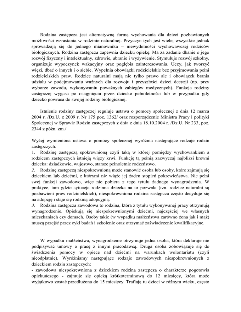 Rodzina zastępcza jest alternatywną formą wychowania dla dzieci pozbawionych możliwości wzrastania w rodzinie naturalnej. Przyczyn tych jest wiele, wszystkie jednak sprowadzają się do jednego mianownika – niewydolności wychowawczej rodziców biologicznych. Rodzina zastępcza zapewnia dziecku opiekę. Ma za zadanie dbanie o jego rozwój fizyczny i intelektualny, zdrowie, ubranie i wyżywienie. Stymuluje rozwój szkolny, organizuje wypoczynek wakacyjny oraz pogłębia zainteresowania. Uczy, jak tworzyć więzi, dbać o innych i o siebie. Wypełnia obowiązki rodzicielskie bez przyjmowania pełni rodzicielskich praw. Rodzice naturalni mają nie tylko prawo ale i obowiązek brania udziału w podejmowaniu ważnych dla rozwoju i przyszłości dzieci decyzji (np. przy wyborze zawodu, wykonywaniu poważnych zabiegów medycznych). Funkcja rodziny zastępczej wygasa po osiągnięciu przez dziecko pełnoletności lub w przypadku gdy dziecko powraca do swojej rodziny biologicznej. Istnienie rodziny zastępczej reguluje ustawa o pomocy społecznej z dnia 12 marca 2004 r. /Dz.U. z 2009 r. Nr 175 poz. 1362/ oraz rozporządzenie Ministra Pracy i polityki Społecznej w Sprawie Rodzin zastępczych z dnia z dnia 18.10.2004 r. /Dz.U. Nr 233, poz. 2344 z późn. zm./ Wyżej wymieniona ustawa o pomocy społecznej wyróżnia następujące rodzaje rodzin zastępczych: 1. Rodzinę zastępczą spokrewnioną czyli taką w której pomiędzy wychowankiem a rodzicem zastępczych istnieją więzy krwi. Funkcję tą pełnią zazwyczaj najbliżsi krewni dziecka: dziadkowie, wujostwo, starsze pełnoletnie rodzeństwo. 2. Rodzinę zastępczą niespokrewnioną może stanowić osoba lub osoby, które zajmują się dzieckiem lub dziećmi, z którymi nie wiąże jej żaden stopień pokrewieństwa. Nie pełni swej funkcji zawodowo, więc nie pobiera z tego tytułu żadnego wynagrodzenia. W praktyce, tam gdzie sytuacja rodzinna dziecka na to pozwala (tzn. rodzice naturalni są pozbawieni praw rodzicielskich), niespokrewniona rodzina zastępcza często decyduje się na adopcję i staje się rodziną adopcyjną. 3. Rodzina zastępcza zawodowa to rodzina, która z tytułu wykonywanej pracy otrzymują wynagrodzenie. Opiekują się niespokrewnionymi dziećmi, najczęściej we własnych mieszkaniach czy domach. Osoby takie (w wypadku małżeństwa zarówno żona jak i mąż) muszą przejść przez cykl badań i szkolenie oraz otrzymać zaświadczenie kwalifikacyjne. W wypadku małżeństwa, wynagrodzenie otrzymuje jedna osoba, która deklaruje nie podpisywać umowy o pracę z innym pracodawcą. Druga osoba zobowiązuje się do świadczenia pomocy w opiece nad dziećmi na warunkach wolontariatu (czyli nieodpłatnie). Wyróżniamy następujące rodzaje zawodowych niespokrewnionych z dzieckiem rodzin zastępczych: - zawodowa niespokrewniona z dzieckiem rodzina zastępcza o charakterze pogotowia opiekuńczego - zajmuje się opieką krótkoterminową do 12 miesięcy, która może wyjątkowo zostać przedłużona do 15 miesięcy. Trafiają tu dzieci w różnym wieku, często noworodki i niemowlaki. Jest to okres, w którym rodzina naturalna dziecka, z pomocą odpowiednich służb, może podjąć próbę rozwiązania swoich problemów, albo też jest to okres na uporządkowanie sytuacji prawnej np. dla niemowlęcia porzuconego przez rodziców znalezienie rodziców adopcyjnych. - zawodowa wielodzietna niespokrewniona z dzieckiem rodzina zastępcza, to forma opieki, która - biorąc pod uwagę obowiązki związane z opieką nad dziećmi i ich liczbę przypomina rodzinny dom dziecka. Jest jednak mniej skomplikowana pod względem organizacyjnym i rozliczeniowym. W wielodzietnej rodzinie zawodowej może znajdować się równocześnie od 3 do 6 dzieci. - specjalistyczna niespokrewniona z dzieckiem zawodowa rodzina zastępcza - jest przeznaczona dla dziecka wymagającego dodatkowej opieki czy pielęgnacji. Trafiają tu dzieci z problemami rozwojowymi, zdrowotnymi, z dysfunkcjami, niedostosowane społecznie. Rodzina zastępcza ma prawo do pomocy pieniężnej na częściowe pokrycie kosztów utrzymania każdego umieszczonego w niej dziecka. Pomocy finansowej udziela starosta właściwy ze względu na miejsce zamieszkania rodziny zastępczej. Wysokość pomocy pieniężnej uzależniona jest od wieku i stanu zdrowia dziecka, a także niedostosowania społecznego dziecka, jeżeli wykazuje ono przejawy demoralizacji, w rozumieniu przepisów o postępowaniu w sprawach nieletnich. Podstawą ustalania wysokości pomocy pieniężnej jest kwota 1 647 zł zwana dalej podstawą. W zależności od stanu zdrowia, wieku dziecka, pokrewieństwa lub jego braku, mogą mieć miejsce dodatkowe modyfikacje wysokości kwoty. Określenie zawarte w ustawie o pomocy społecznej i rozporządzeniu o rodzinach zastępczych mówiące o "częściowym pokryciu kosztów", sygnalizuje, że może zaistnieć potrzeba wkładu finansowego rodziny zastępczej w wydatki na utrzymanie dziecka. Wysokość pomocy pieniężnej wynosi miesięcznie nie mniej niż: - 60% podstawy – dziecko do 7 lat; - 80% podstawy - dziecko do 7 lat, posiadającego orzeczenie o niepełnosprawności; - 40% podstawy, nie mniej niż 10% - dziecko od 7 do 18 lat; - 60% podstawy – dziecko od 7 do 18 lat posiadającego orzeczenie o niepełnosprawności; - 80% podstawy – dziecko od 7 do 18 lat posiadającego orzeczenie o niepełnosprawności i umieszczonego w rodzinie zastępczej na podstawie ustawy o postępowaniu w sprawach o nieletnich. Niespokrewniona z dzieckiem rodzina zastępcza otrzymuje dodatkowo na każde umieszczone w niej dziecko kwotę odpowiadającą 10% podstawy z tytułu sprawowania osobistej opieki i jego wychowania Wyżej wymienioną pomoc przyznaje się na okres pobytu dziecka: 1) W rodzinie zastępczej spokrewnionej z dzieckiem, rodzinie zastępczej niespokrewnionej z dzieckiem oraz zawodowej niespokrewnionej z dzieckiem, wielodzietnej i specjalistycznej rodzinie zastępczej, pocz