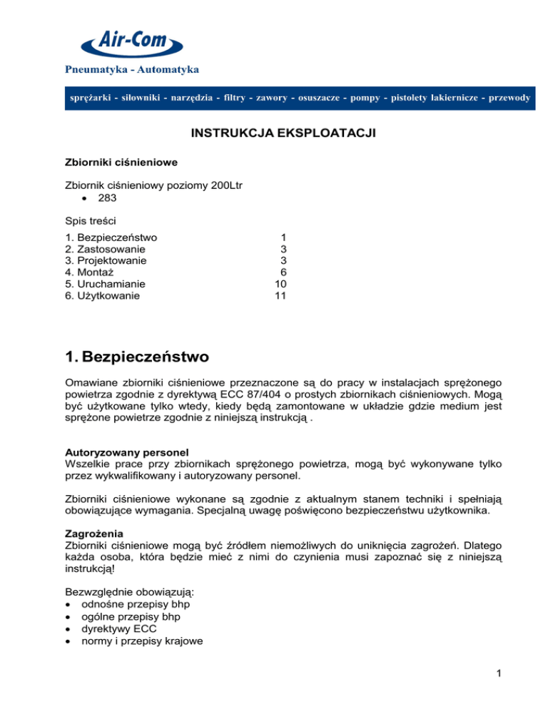 INSTRUKCJA EKSPLOATACJI Zbiorniki ciśnieniowe Zbiornik ciśnieniowy poziomy 200Ltr 283 Spis treści 1. Bezpieczeństwo 2. Zastosowanie 3. Projektowanie 4. Montaż 5. Uruchamianie 6. Użytkowanie 1 3 3 6 10 11 1. Bezpieczeństwo Omawiane zbiorniki ciśnieniowe przeznaczone są do pracy w instalacjach sprężonego powietrza zgodnie z dyrektywą ECC 87/404 o prostych zbiornikach ciśnieniowych. Mogą być użytkowane tylko wtedy, kiedy będą zamontowane w układzie gdzie medium jest sprężone powietrze zgodnie z niniejszą instrukcją . Autoryzowany personel Wszelkie prace przy zbiornikach sprężonego powietrza, mogą być wykonywane tylko przez wykwalifikowany i autoryzowany personel. Zbiorniki ciśnieniowe wykonane są zgodnie z aktualnym stanem techniki i spełniają obowiązujące wymagania. Specjalną uwagę poświęcono bezpieczeństwu użytkownika. Zagrożenia Zbiorniki ciśnieniowe mogą być źródłem niemożliwych do uniknięcia zagrożeń. Dlatego każda osoba, która będzie mieć z nimi do czynienia musi zapoznać się z niniejszą instrukcją! Bezwzględnie obowiązują: odnośne przepisy bhp ogólne przepisy bhp dyrektywy ECC normy i przepisy krajowe 1 Wskazówki bhp służą unikaniu zagrożenia i należy je dokładnie przestrzegać. UWAGA! Wskazówka ostrzegająca przed zagrożeniem zniszczenia sprzętu OSTROŻNIE! Wskazówka ostrzegająca przed średnio ciężkim zagrożeniem zdrowia. OSTRZEŻENIE! Wskazówka ostrzegająca przed ciężkim zagrożeniem zdrowia. NIEBEZPIECZEŃSTWO! Wskazówka ostrzegająca przed bezpośrednim ciężkim zagrożeniem zdrowia. Ogólne wskazówki bhp Ostrzeżenie! W czasie pracy przy zbiornikach ciśnieniowych należy zachować należytą ostrożność. Nie otwierać przyłączy przed wyrównaniem ciśnienia. Ostrzeżenie! Zbiorniki ciśnieniowe mogą być pod ciśnieniem! Możliwe ciężkie urazy przy nie zachowaniu należytej ostrożności podczas prac wykonywanych przy zbiorniku. W razie otwarcia klapy spuścić ciśnienie! Przy wykonywaniu prac przy zbiornikach na sprężone powietrze obowiązuje dodatkowo: Zastosowanie Urządzenie Medium PS td max td min Zbiornik ciśnieniowy wolnostojący (pionowy) pojemność 200 Lt. Sprężone powietrze 11 bar 100°C -10°C PS – maksymalne ciśnienie robocze td max - maksymalna temperatura robocza td min – minimalna temperatura robocza 2 3. Projektowanie 3.1 Miejsce ustawienia Zbiornik ciśnieniowy powinien być ustawiony w miejscu gdzie temperatura otoczenia nie przekracza 100 st.C i nie schodzi poniżej -10 st.C. W miarę możliwości unikać eksploatowania w pomieszczeniach niedostatecznie wentylowanych , oraz nie instalować zbiornika koło źródeł ciepła czy też substancji łatwo palnych. W razie zastosowania w ciężkich warunkach (np. agresywna atmosfera, niskie temperatury zewnętrzne) należy podjąć odpowiednie środki. W razie potrzeby zaleca się kontakt z firmą AIR-COM. 3.2 Maksymalne ciśnienie robocze Cała instalacja powinna być tak zwymiarowana i użytkowana, aby nie mogło dojść do przekroczenia maksymalnego ciśnienia roboczego w zbiorniku (11 barów). Zawory bezpieczeństwa wymagane są bezwzględnie, zgodnie z ROZPORZĄDZENIEM MINISTRA GOSPODARKI, PRACY I POLITYKI SPOŁECZNEJ z dnia 9 lipca 2003 r. Rozdział 1, § 2.pkt.27, dobrane zaś powinne być według stosunku wydajności urządzenia do niego podłączonego a wydajności zaworu bezpieczeństwa. Urządzenia zabezpieczające Urządzenia zabezpieczające zgodnie z ROZPORZĄDZENIEM MINISTRA GOSPODARKI, PRACY I POLITYKI SPOŁECZNEJ z dnia 9 lipca 2003 r. Rozdział 1, § 2.pkt.27 , jest to urządzenia przeznaczone do zabezpieczania urządzeń ciśnieniowych przed przekroczeniem parametrów dopuszczalnych. Do danego zbiornika używamy zawór bezpieczeństwa z ciś. otwarcia równym dopuszczalnemu ciśnieniu zbiornika. 3.5 Zgłoszenie instalacji Zbiorniki ciśnieniowy do sprężonego powietrza jest zgodny z dyrektywą ECC 87/404. Dlatego cała instalacja zgodnie z miejscowymi przepisami musi być zgłoszona i odebrana przez UDT. 3 4. Montaż 4.1 Stan w chwili dostawy Zbiornik ciśnieniowy dostarczany jest w stanie otwartym gotowym do montażu z instalacją sprężonego powietrza . 4.2 Podłączenie zbiornika do instalacji sprężonego powietrza. Zbiornik powinien zostać podłączony przez firmę,(osobę), uprawnioną do tej czynności , zgodnie z wszelkimi normami występującymi w ogólnych przepisach o urządzeniach ciśnieniowych. 5. Uruchomienie Zbiornik ciśnieniowy sprawdzany jest fabrycznie jako samodzielne urządzenie. Po zamontowaniu należy ponownie sprawdzić szczelność przyłączy i systemu łączącego przez osoby uprawnione. 5.1 Rozruch Rozruch zbiornika ciśnieniowego powinien odbywać się przy osobach które sprawdzają jego szczelność , oraz osobach upoważnionych do montażu tego zbiornika z siecią sprężonego powietrza. Rozruch następuję przy włączeniu urządzenia do sprężonego powietrza (sprężarki, kompresora) , „nabiciu” zbiornika powietrzem oraz sprawdzeniem działania zaworu bezpieczeństwa. Zawór bezpieczeństwa powinien zadziałać kiedy ciśnienie osiągnie nominalną wartość (wartość otwarcia nastawy) ustaloną przy doborze zaworu. Drgania Sprawdzić, czy w instalacji, a szczególnie w przewodach rurowych nie powstają znaczne drgania. W razie potrzeby wprowadzić dodatkowe zabezpieczenia. UWAGA! Możliwe są pęknięcia i wycieki na złączach przy sprężarce i innych elementach instalacji! Należy zapobiegać silnym wibracjom! 4 6. Użytkowanie 6.1. Badania odbiorcze, przeprowadza się, jeżeli bezpieczeństwo eksploatacji urządzenia ciśnieniowego zależy od warunków jego zainstalowania, w szczególności gdy urządzenie jest: 1) montowane w miejscu jego eksploatacji; 2) wyposażone w osprzęt zabezpieczający lub osprzęt ciśnieniowy w miejscu jego eksploatacji. 2. Badania odbiorcze obejmują: 1) sprawdzenie, czy urządzenie ciśnieniowe jest zainstalowane zg