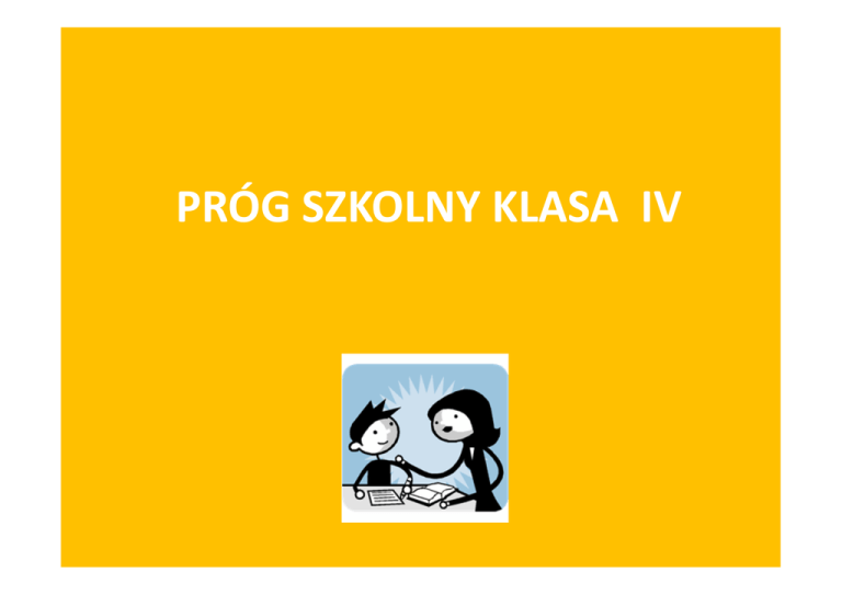 PRÓG SZKOLNY KLASA IV Nie wystarczy przekroczyć próg, trzeba iść w głąb.” „ Jan Paweł II (Karol Wojtyła) PRÓG SZKOLNY 1. Uczeń czwartej klasy. 2. Straty związane z zakończeniem nauczania początkowego. 3. Zmiany związane z przekroczeniem progu szkolnego: różni nauczyciele, trudniejsza nauka, oceny z przedmiotów i zachowania. 4. Pozytywne aspekty zmiany. 5. Psychologiczna sylwetka czwartoklasisty: ogólny opis zachowań, relacje z Rodzicami, typowe zachowania w szkole. 6. Objawy przeżywanych zmian. 7. Pomoc rodziców w przejściu progu szkolnego: rozmowy z dzieckiem, organizacja nauki, pomoc w nauce, kontakty ze szkołą, stosunek do ocen, wiara w możliwości dziecka. 8. Dyskusja, pytania. PRÓG SZKOLNY CZWARTOKLASISTA UCZEŃ KLASY CZWARTEJ prawdziwy uczeń CZWARTOKLASISTA PRÓG KLASA III - IV następny szczebel edukacji CZWARTOKLASISTA OKRES ADAPTACJI STRATY Pani, sala, STRATY pozycja, sukces, przyzwyczajenia, luz, zabawa. ZMIANY nauczyciele, nauka, oceny, organizacja, rówieśnicy, większa samodzielność, ZMIANY przyzwyczajenia, czas wolny, zajęcia pozalekcyjne, więcej obowiązków, luz, zabawa. ZMIANY RÓŻNI NAUCZYCIELE wymagania (zachowanie, nauka), egzekwowanie wiedzy, ZMIANY style pracy (sposoby nauczania), sposób komunikowania się, brak opinii, mały kontakt z wychowawcą (wsparcie, odroczenie w czasie, konflikty). ZMIANY NAUKA trudniejsza (więcej, szybciej, wymaga intensywnego myślenia, nie tylko polecenia), różnorodność przedmiotów, problemy, z niektórymi przedmiotami, ZMIANY nie zawsze jest już „dobrym uczniem”, więcej pracy w domu (nie tylko utrwalanie), pisemna i ustna, zapamiętywanie zadań domowych, większa samodzielność. ZMIANY OCENY brak opisowych, nieznajomość konsekwencji „złych ocen”, ZMIANY silny stres, ocena ważniejsza niż wiedza, nadmierna waga przypisywana ocenom, porównywanie. ZMIANY ORGANIZACJA nauka w domu, systematyczność, wytrwałość, dokładność, ZMIANY tempo pracy, poczucie czasu, klasówki (odległe terminy), większa samodzielność, lekcje w szkole (45 min.), różne przedmioty. ZMIANY RÓWIEŚNICY bardzo ważni, konflikty, ZMIANY grupa, dorośli, większa samodzielność. PLUSY czyste konto, różne przedmioty, PLUSY nowa wiedza, rozwój m.in. zainteresowań, samodzielność. ZACHOWANIE ZACHOWANIE ETAPY GENETYKA ŚRODOWISKO ZACHOWANIA ZACHOWANIA DZIECKA SĄ ZGODNE Z JEGO ETAPAMI ROZWOJU PSYCHICZNEGO SYLWETKA CHARAKTERYSTYKA ROZWOJU DZIECKA SYLWETKA SYLWETKA SYLWETKA STARY MALUTKI spokojniejszy, skryty, poważny, zbuntowany. SYLWETKA DZIECKO W NIEBIE sympatyczny, przyjacielski, „luzak”, zadowolony. BUNTOWNIK BEZ POWODU SYLWETKA obrażalski, narzekający, pełen energii, kłótliwy. SYLWETKA POCZEKAJCIE NA MNIE emanuje energią, ale spokojny, ciekawy, otwarty. SYLWETKA ZACHOWANIE SYLWETKA 9 spokojniejszy, skryty martwi się, jest poważny praktyk - autonomia bardziej posłuszny ważne zdanie kolegów większa samodzielność nie konieczne nagrody nie narzucać się – potrzeba uszanowania dojrzałości wydaje się przemądrzały, krnąbrny, zbuntowany otwarta krytyka użala się 10 zrównoważony spokojny pogodny odprężony luz dystans sympatyczny przyjacielski rozwój intelektualny i społeczny wyobraźnia – lęki przed złymi ludźmi 11 przygaszony, skryty obrażony niezadowolony lubi samotność zajęty, „pełno go” aktywność manualna telewizja, muzyka nieobecny (polecenia) bywa ospały, smutny narzekający, nastroje użala się, płacze „pełnia szczęścia” lęki racjonalne – o bliskich odreagowanie – bóle zainteresowanie seksem 12 energia spieszy się przebojowy zajęty bezkrytyczny przeżywa porażki wrażliwy, czuły patrzy na innych pogodny otwarty potrzeba pochwał nie doprowadza zadań do końca zainteresowany obawy SYLWETKA RODZICE SYLWETKA 9 mama mniej ważna przyjaciel jest wyrocznią dostrzegają ojca asystują ojcu przy pracach zdanie taty bardzo się liczy chętniej wykonują polecenia taty 10 posłuszny mama najwyższy autorytet jej słowa prawem z radością wykonują jej polecenia rodzice - autorytet ojcowie maja pozycję idola dumne z zawodowych osiągnięć taty są samodzielne, „nie wiszą na rodzicach” chętnie się zwierzają 11 sprzeciwia się odwleka niechętny do pomocy zamknięty okropni rodzice „dorosły” dyskutuje opryskliwy zbuntowany, podważa autorytet nie lubi rad mama ma gorszą pozycję nieprzyjazny dla rodzeństwa 12 wyrozumiały i ..życzliwy szczególnie ..dla mamy łatwiej znosi krytykę dość posłuszny, ale niezależny „odrywa się” od rodziny dużo tajemnic chce być poważnie traktowany chętnie poza domem nie lubi czułości trochę lepiej z rodzeństwem dziecięce wybryki SYLWETKA SZKOŁA SYLWETKA 9 uspokojenie stabilizacja życie społeczne – paczki wrogość do osób spoza grupy konflikt płci intrygi, rozgrywki, układy kłótnie, łzy dyskutują i odpowiadają nauczycielom zbuntowani 10 11 spokój i stabilizacja ..cd. zadowoleni z nauczycieli posłuszni, chętnie podporządkowują się silny konflikt płci skargi głównie na chłopców intrygi , plotki, kłótnie, a nawet bójki wśród dziewczynek jawne i gwałtowne kłótnie i bójki wśród chłopców unikanie szkoły – sytuacja w klasie „stres szkolny” jeszcze chce się uczyć skłonny do awantur i bójek potrafi kłócić się z nauczycielem ocenia nauczycieli, liczą się ze zdaniem kolegów potrzeba przebywania z rówieśnikami grupy klasowe przyjaźnie zazdrośni rywalizują problemy z współpracą 12 szkoła to jego ..sprawa skłonny do ..współpracy posłuszny, ale nie w ..grupie więcej ruchu i ..swobody nauczyciel – idol, ..ale … nie lubi odrabiać ..lekcji samodzielny zmiana struktury ..społecznej klasy ZMIANY ROZWOJOWE ZACHOWANIA „huśtawka nastrojów”, wybuchy buntu, rodzice tracą autorytet, rówieśnicy stają się coraz ważniejsi, pojawia się niechęć do szkoły, dyscypliny i nauczycieli. REAKCJA RODZICÓW ZACHOWANIA Z