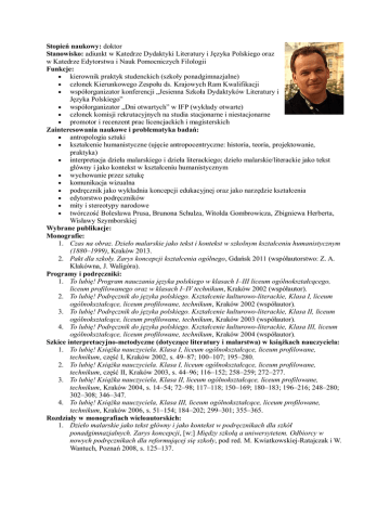 Stopień naukowy: doktor Stanowisko: adiunkt w Katedrze Dydaktyki Literatury i Języka Polskiego oraz w Katedrze Edytorstwa i Nauk Pomocniczych Filologii Funkcje: kierownik praktyk studenckich (szkoły ponadgimnazjalne) członek Kierunkowego Zespołu ds. Krajowych Ram Kwalifikacji współorganizator konferencji „Jesienna Szkoła Dydaktyków Literatury i Języka Polskiego” współorganizator „Dni otwartych” w IFP (wykłady otwarte) członek komisji rekrutacyjnych na studia stacjonarne i niestacjonarne promotor i recenzent prac licencjackich i magisterskich Zainteresowania naukowe i problematyka badań: antropologia sztuki kształcenie humanistyczne (ujęcie antropocentryczne: historia, teoria, projektowanie, praktyka) interpretacja dzieła malarskiego i dzieła literackiego; dzieło malarskie/literackie jako tekst główny i jako kontekst w kształceniu humanistycznym wychowanie przez sztukę komunikacja wizualna podręcznik jako wykładnia koncepcji edukacyjnej oraz jako narzędzie kształcenia edytorstwo podręczników mity i stereotypy narodowe twórczość Bolesława Prusa, Brunona Schulza, Witolda Gombrowicza, Zbigniewa Herberta, Wisławy Szymborskiej Wybrane publikacje: Monografie: 1. Czas na obraz. Dzieło malarskie jako tekst i kontekst w szkolnym kształceniu humanistycznym (1880–1999), Kraków 2013. 2. Pakt dla szkoły. Zarys koncepcji kształcenia ogólnego, Gdańsk 2011 (współautorstwo: Z. A. Kłakówna, J. Waligóra). Programy i podręczniki: 1. To lubię! Program nauczania języka polskiego w klasach I–III liceum ogólnokształcącego, liceum profilowanego oraz w klasach I–IV technikum, Kraków 2002 (współautor). 2. To lubię! Podręcznik do języka polskiego. Kształcenie kulturowo-literackie, Klasa I, liceum ogólnokształcące, liceum profilowane, technikum, Kraków 2002 (współautor). 3. To lubię! Podręcznik do języka polskiego. Kształcenie kulturowo-literackie, Klasa II, liceum ogólnokształcące, liceum profilowane, technikum, Kraków 2003 (współautor). 4. To lubię! Podręcznik do języka polskiego. Kształcenie kulturowo-literackie, Klasa III, liceum ogólnokształcące, liceum profilowane, technikum, Kraków 2004 (współautor). Szkice interpretacyjno-metodyczne (dotyczące literatury i malarstwa) w książkach nauczyciela: 1. To lubię! Książka nauczyciela. Klasa I, liceum ogólnokształcące, liceum profilowane, technikum, część I, Kraków 2002, s. 49–87; 100–107; 195–280. 2. To lubię! Książka nauczyciela. Klasa I, liceum ogólnokształcące, liceum profilowane, technikum, część II, Kraków 2003, s. 44–96; 116–152; 258–259; 272–277. 3. To lubię! Książka nauczyciela, Klasa II, liceum ogólnokształcące, liceum profilowane, technikum, Kraków 2004, s. 14–54; 72–98; 117–118; 150–169; 180–183; 196–216; 248–280; 302–308; 346–347. 4. To lubię! Książka nauczyciela, Klasa III, liceum ogólnokształcące, liceum profilowane, technikum, Kraków 2006, s. 51–154; 184–202; 299–301; 355–365. Rozdziały w monografiach wieloautorskich: 1. Dzieło malarskie jako tekst główny i jako kontekst w podręcznikach dla szkół ponadgimnazjalnych. Zarys koncepcji, [w:] Między szkołą a uniwersytetem. Odbiorcy w nowych podręcznikach dla reformującej się szkoły, pod red. M. Kwiatkowskiej-Ratajczak i W. Wantuch, Poznań 2008, s. 125–137. 2. Warunki odbioru dzieła malarskiego w szkole, czyli o strukturowaniu sytuacji wytwarzania znaczeń, [w:] Annales Universitatis Pedagogicae Cracoviensis 71. Studia at Didacticam Litterarum Polonarum et Linguae Polonae Pertinentia I, pod red. M. Jędrychowskiej, M. Sienko, J. Waligóry, Kraków 2010, s. 237–253. 3. O „czytaniu” dzieła malarskiego w szkole – inspiracje, kontynuacje, zaniechania, [w:] Annales Universitatis Pedagogicae Cracoviensis. Studia at Didacticam Litterarum Polonarum et Linguae Polonae, Pertinentia II, pod red. M. Jędrychowskiej, D. Łazarskiej, E. Mikoś, Kraków 2010, s. 59–75. 4. Program – podręcznik – nauczyciel. Jędrzejewicz potrzebny od zaraz!, [w:] Edukacja dla rozwoju, Gdańsk 2010, s. 117–122. 5. Dzieje dydaktyki języka polskiego, [w:] Dzieje dydaktyk przedmiotowych w 65-letniej tradycji Uniwersytetu Pedagogicznego w Krakowie, Kraków 2011, s. 175–181. 6. Priorytety kształcenia „polonistycznego”, czyli o poszukiwaniu podstawy w „podstawie programowej”, [w:] Annales Universitatis Pedagogicae Cracoviensis. Studia ad Didacticam Litterarum Polonarum et Lingua Polonie, Partinentia III, pod red. M. Jędrychowskiej i M. Szymańskiej, Kraków 2011, s. 195–207. 7. Malarstwo – zguba i ocalenie, [w:] Wokół słowa, obrazu i edukacji, pod red. M. Nęckiej, Annales Universitatis Pedagogicae Cracoviensis. Studia de Arte et Educatione VI, Kraków s. 82–111. 8. Szkoła w świecie pozoru [w:] Sprawcy i/lub ofiary działań pozornych w edukacji szkolnej, pod red. M. Dudzikowej i K. Knasieckiej-Falbierskiej, Kraków 2013, s. 204–220. 9. Galeria w Soplicowie albo powrót do domu w rodzinnej Europie, [w:] Mała ojczyzna wobec wielokulturowej Europy, pod red. G. Różańskiej, Gdańsk-Słupsk 2013, s.153–169. 10. Wy-słowienia i wy-obrażenia. Przyczynek do refleksji antropologicznej, [w:] Annales Universitatis Pedagogicae Cracoviensis. Studia ad Didacticam Litterarum Polonarum et Lingua Polonie, Partinentia IV, pod red. M. Szymańskiej, Kraków 2013, s. 116–127. 11. Jak Matejko Kopernika malował… albo o ambiwalentnej jedności świata, [w:] Humor w kulturze i edukacji, pod red. E. Dunaj, I. Morawskiej, M. Latoch-Zielińskiej, Lublin 2014, s. 91–108. 12. Wąsy Rejtana, [w:] Mężczyzna w literaturze i kulturze, pod red. G. Różańskiej, Gdańsk-Słupsk 2014, s. 71–96. 13. Komisja Edukacji Narodowej. Mała reinterpretacja wielkiego mitu, [w:]Miejsca wspólne i odmienne. Dydaktyka literatury i języka polskiego w kręgu tradycji KEN?, Annales Universitatis Pedagogicae Cracoviensis. Studia at Didacticam Litte