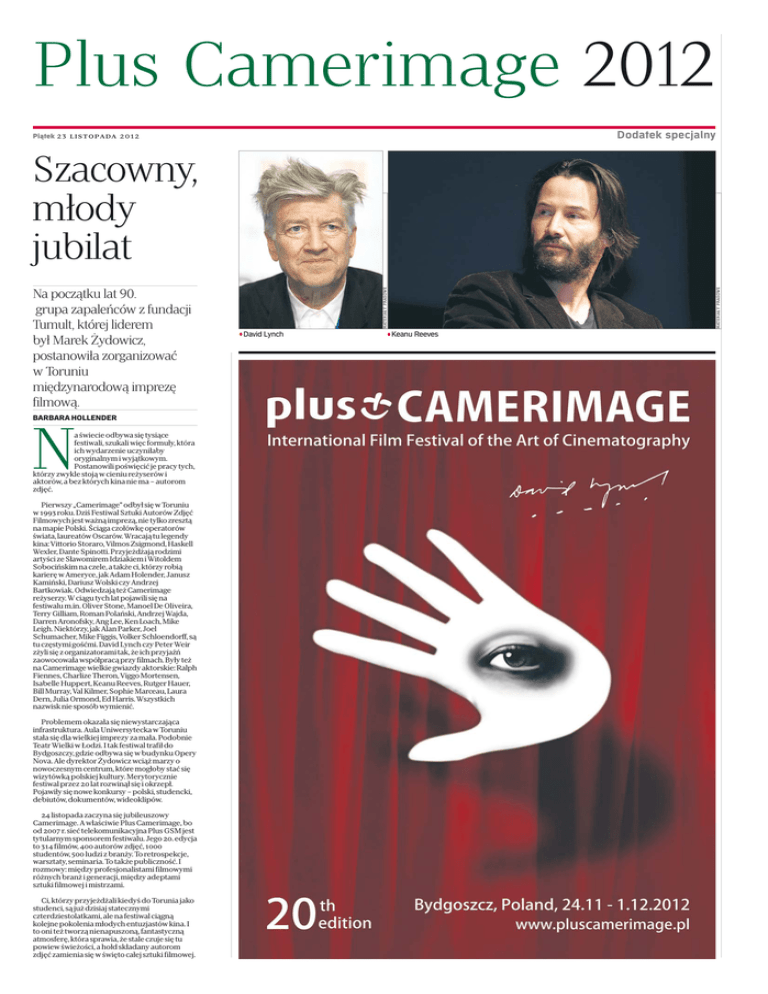 Plus Camerimage 2012 Dodatek specjalny Piątek 23 listopada 2012 BARBARA HOLLENDER N a świecie odbywa się tysiące festiwali, szukali więc formuły, która ich wydarzenie uczyniłaby oryginalnym i wyjątkowym. Postanowili poświęcić je pracy tych, którzy zwykle stoją w cieniu reżyserów i aktorów, a bez których kina nie ma – autorom zdjęć. Pierwszy „Camerimage” odbył się w Toruniu w 1993 roku. Dziś Festiwal Sztuki Autorów Zdjęć Filmowych jest ważną imprezą, nie tylko zresztą na mapie Polski. Ściąga czołówkę operatorów świata, laureatów Oscarów. Wracają tu legendy kina: Vittorio Storaro, Vilmos Zsigmond, Haskell Wexler, Dante Spinotti. Przyjeżdżają rodzimi artyści ze Sławomirem Idziakiem i Witoldem Sobocińskim na czele, a także ci, którzy robią karierę w Ameryce, jak Adam Holender, Janusz Kamiński, Dariusz Wolski czy Andrzej Bartkowiak. Odwiedzają też Camerimage reżyserzy. W ciągu tych lat pojawili się na festiwalu m.in. Oliver Stone, Manoel De Oliveira, Terry Gilliam, Roman Polański, Andrzej Wajda, Darren Aronofsky, Ang Lee, Ken Loach, Mike Leigh. Niektórzy, jak Alan Parker, Joel Schumacher, Mike Figgis, Volker Schloendorff, są tu częstymi gośćmi. David Lynch czy Peter Weir zżyli się z organizatorami tak, że ich przyjaźń zaowocowała współpracą przy filmach. Były też na Camerimage wielkie gwiazdy aktorskie: Ralph Fiennes, Charlize Theron, Viggo Mortensen, Isabelle Huppert, Keanu Reeves, Rutger Hauer, Bill Murray, Val Kilmer, Sophie Marceau, Laura Dern, Julia Ormond, Ed Harris. Wszystkich nazwisk nie sposób wymienić. Problemem okazała się niewystarczająca infrastruktura. Aula Uniwersytecka w Toruniu stała się dla wielkiej imprezy za mała. Podobnie Teatr Wielki w Łodzi. I tak festiwal trafił do Bydgoszczy, gdzie odbywa się w budynku Opery Nova. Ale dyrektor Żydowicz wciąż marzy o nowoczesnym centrum, które mogłoby stać się wizytówką polskiej kultury. Merytorycznie festiwal przez 20 lat rozwinął się i okrzepł. Pojawiły się nowe konkursy – polski, studencki, debiutów, dokumentów, wideoklipów. 24 listopada zaczyna się jubileuszowy Camerimage. A właściwie Plus Camerimage, bo od 2007 r. sieć telekomunikacyjna Plus GSM jest tytularnym sponsorem festiwalu. Jego 20. edycja to 314 filmów, 400 autorów zdjęć, 1000 studentów, 500 ludzi z branży. To retrospekcje, warsztaty, seminaria. To także publiczność. I rozmowy: między profesjonalistami filmowymi różnych branż i generacji, między adeptami sztuki filmowej i mistrzami. Ci, którzy przyjeżdżali kiedyś do Torunia jako studenci, są już dzisiaj statecznymi czterdziestolatkami, ale na festiwal ciągną kolejne pokolenia młodych entuzjastów kina. I to oni też tworzą nienapuszoną, fantastyczną atmosferę, która sprawia, że stale czuje się tu powiew świeżości, a hołd składany autorom zdjęć zamienia się w święto całej sztuki filmowej. ≥David Lynch ≥Keanu Reeves MATERIAŁY PRASOWE Na początku lat 90. grupa zapaleńców z fundacji Tumult, której liderem był Marek Żydowicz, postanowiła zorganizować w Toruniu międzynarodową imprezę filmową. MATERIAŁY PRASOWE Szacowny, młody jubilat 2 Piątek Plus Camerimage 2012 23 listopada 2012 rp.pl ◊ Festiwal z oryginalną formułą ROZMOWA | Marek Żydowicz, dyrektor festiwalu Plus Camerimage Jak przekonał pan do tej idei twórców, którzy licznie zjawili się w Toruniu? Zwróciłem się do wielkich artystów, takich jak Sven Nykvist czy Vittorio Storaro, a Festiwal okrzepł i okazał się wielkim sukcesem. Operatorzy, którzy zwykle pozostają w cieniu, poczuli się na nim gwiazdami. – To prawda, jednak szybko zdałem sobie sprawę, że jeśli będziemy zapraszać wyłącznie autorów zdjęć, to stworzymy coś w rodzaju getta zawodowego, w którym pokrzywdzeni kompensują swoje kompleksy. Moi goście też to rozumieli. Opowiedzieli się za tym, żeby na Camerimage przyznawać nagrody także reżyserom, scenografom, nawet aktorom – tym wszystkim, którzy mają artystyczny wpływ na stronę wizualną filmu. MATERIAŁY PRASOWE Dwudziesta, jubileuszowa edycja Plus Camerimage skłania do spojrzenia wstecz. Jak to się stało, że grupa zapaleńców, w trudnym okresie transformacji, w Toruniu, zorganizowała wielki międzynarodowy festiwal? Marek Żydowicz: Zaczęło się od Fundacji Tumult i wystaw artystycznych. Na „Tumulcie Toruńskim ’89” zgromadziliśmy 1500 prac 250 artystów mieszkających lub wywodzących się z Torunia. W 1991 roku przygotowaliśmy „Konfrontacje artystyczne ’91”. Udało nam się ściągnąć niepokazywane wcześniej w Polsce dzieła Ludwiga, niezależnych artystów z Czech, Rosji, Słowacji, Węgier. Wystawie towarzyszył przegląd filmowy „Droga ku nowej Europie”. Z „Homo Faber” przyjechał wówczas do Torunia Volker Schloendorff i to on właśnie podszepnął nam, żebyśmy zorganizowali festiwal z oryginalną formułą. Spytałem, o jakiej formule myśli. Odpowiedział: „Gdybym wiedział, sam bym taką imprezę stworzył”. Zastanawiałem się nad jego słowami i uświadomiłem sobie, że jako historyka sztuki interesuje mnie w kinie obraz i warto byłoby wywołać dyskusję na temat języka filmu. Tak narodziła się idea festiwalu poświęconego sztuce ruchomych obrazów. w Polsce – Witold Sobociński, Sławomir Idziak. Nawiązałem kontakt z organizacjami zrzeszającymi operatorów na zachodzie Europy i w Ameryce. Na pierwszym festiwalu odbyło się też założycielskie spotkanie IMAGO – Europejskiej Federacji Autorów Zdjęć Filmowych. Wielu twórców odniosło się do naszego pomysłu z entuzjazmem i wspierało nas. Ale miał pan też sporo oponentów. Oczywiście, że tak. W kraju wysłuchiwaliśmy początkowo krytycznych uwag w stylu: „Niedługo będziemy robić festiwale wózkarzy i oświetlaczy”, a złe recenzje krytyka poważnej gazety po pierwszej edycji sprawiły, że zaczęli wycofywać si