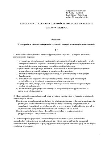 Załącznik do uchwały Nr XXX-146/2013 Rady Gminy Wierzbica z dnia 28 sierpnia 2013 r. REGULAMIN UTRZYMANIA CZYSTOŚCI I PORZĄDKU NA TERENIE GMINY WIERZBICA Rozdział 1 Wymagania w zakresie utrzymania czystości i porządku na terenie nieruchomości §1 1. Właściciele nieruchomości zapewniają utrzymanie czystości i porządku na terenie nieruchomości poprzez: 1) wyposażenie nieruchomości zamieszkałych i niezamieszkałych w pojemniki i worki służące do zbierania odpadów komunalnych oraz utrzymywanie tych pojemników w odpowiednim stanie sanitarnym, porządkowym i technicznym; 2) prowadzenie selektywnego zbierania i przekazywanie przedsiębiorcy odpadów komunalnych, w sposób opisany w niniejszym Regulaminie; 3) zbieranie odpadów niepodlegających selekcji, w sposób opisany w niniejszym Regulaminie; 4) przekazywanie odpadów zebranych selektywnie i pozostałych zmieszanych przedsiębiorcy, w terminach wyznaczonych harmonogramem; 5) uprzątanie błota, śniegu, lodu i innych zanieczyszczeń z chodników położonych wzdłuż nieruchomości; 6) pryzmowanie zgarniętego lodu i śniegu w miejsce niepowodujące zakłóceń w ruchu pieszych i pojazdów. 2. Mycie pojazdów samochodowych poza myjniami możliwe jest wyłącznie w miejscach dozwolonych, a więc: 1) na terenie nieruchomości niesłużącej do użytku publicznego tylko pod warunkiem, że powstające ścieki odprowadzane są do kanalizacji sanitarnej lub gromadzone w szczelnych zbiornikach bezodpływowych, w szczególności ścieki takie nie mogą być odprowadzane bezpośrednio do zbiorników wodnych lub do ziemi; 2) na terenach służących do użytku publicznego tylko w miejscach do tego przygotowanych i specjalnie oznaczonych. 3. Drobne naprawy pojazdów samochodowych dozwolone są poza warsztatami samochodowymi na terenie nieruchomości, gdy nie są one uciążliwe dla sąsiednich nieruchomości, a powstające odpady są gromadzone w sposób umożliwiający ich usunięcie zgodnie z przepisami. 1 Rozdział 2 Częstotliwość i sposób pozbywania się odpadów komunalnych i nieczystości ciekłych z terenu nieruchomości oraz z terenów przeznaczonych do użytku publicznego §2 1. Właściciele nieruchomości obowiązani są do pozbywania się odpadów komunalnych z terenu nieruchomości w sposób systematyczny, gwarantujący zachowanie czystości i porządku na terenie nieruchomości. 2. Właściciele nieruchomości, którzy selektywnie gromadzą odpady komunalne, segregują je w następujący sposób: 1) frakcję zmieszaną (mokrą) tj. odpady biodegradowalne, np. resztki jedzenia, odpady z pielęgnacji roślin doniczkowych i pozostałe odpady komunalne nie wymienione w pkt 2 -7); 2) frakcję suchą – papier i tektury (w tym opakowania, gazety, czasopisma itd.) plastik tj. tworzywa sztuczne, opróżnione opakowania wielomateriałowe, metale, tekstylia; 3) szkło, opróżnione opakowania szklane np. słoiki, butelki; 4) odpady zielone z pielęgnacji ogrodów i parków, np. skoszona trawa; 5) odpady wielkogabarytowe tj. odpady komunalne, które ze względu na swoje rozmiary i masę, nie mogą być umieszczone w typowych pojemnikach przeznaczonych do zbierania odpadów komunalnych z wyłączeniem odpadów z budów i remontów; 6) odpady budowlano – remontowe i rozbiórkowe tj. odpady komunalne, które powstały w wyniku prowadzenia drobnych robót, nie wymagających pozwolenia na budowę ani zgłoszenia zamiaru prowadzenia robót; 7) popiół t.j.: pozostałości po całkowitym spaleniu wsadu z pieców używanych na terenie nieruchomości; 8) inne rodzaje odpadów – należy przez to rozumieć odpady niebezpieczne w rozumieniu ustawy o odpadach, powstające w gospodarstwach domowych, w tym m.in.: baterie, akumulatory, żarówki, świetlówki, resztki farb, lakierów, rozpuszczalników, środków do impregnacji drewna, środków ochrony roślin i nawozów, pojemniki po aerozolach, olejach mineralnych i syntetycznych, tłuszczach, benzynie, środkach chemicznych, środkach ochrony roślin, przeterminowane leki, stare kosmetyki, sprzęt elektryczny i elektroniczny, tusze do drukarek i tonery, taśmy wideo, kasety magnetofonowe, materiały fotograficzne, taśmy barwiące oraz zużyte opony. 3. Zbieranie segregowanych odpadów odbywa się poprzez: 1) gromadzenie frakcji mokrej w pojemnikach. Dopuszcza się gromadzenie frakcji mokrej w workach oznaczonych kolorem szarym lub czarnym; 2) gromadzenie frakcji suchej w pojemnikach i workach oznaczonych kolorem żółtym; 3) gromadzenie szkła w pojemnikach i workach oznaczonych kolorem zielonym. 4) pojemniki i worki oznaczone właściwymi kolorami, mogą być dodatkowo oznaczone właściwymi napisami określającymi rodzaj gromadzonej frakcji; 5) dopuszcza się stosowanie pojemników i worków o innych kolorach niż wymienione w pkt 1-3 do gromadzenia poszczególnych frakcji, pod warunkiem ich oznaczenia właściwymi napisami określającymi rodzaj gromadzonej frakcji. 4. Właściciele nieruchomości w zabudowie zagrodowej i jednorodzinnej mogą korzystać z przydomowego kompostownika w celu zagospodarowania odpadów ulegających biodegradacji i odpadów zielonych, o ile proces ten nie spowoduje zanieczyszczenia wód lub gleby oraz uciążliwości dla sąsiadów i nie będzie naruszał praw określonych w innych powszechnie obowiązujących przepisach. 2 5. Na obszarze zabudowy zagrodowej i jednorodzinnej odpady odbierane są sprzed nieruchomości. Właściciel ma obowiązek w terminie określonym harmonogramem odbioru odpadów komunalnych, wystawić je przed wejście na teren nieruchomości lub przy krawędzi drogi, albo pozostawić otwartym miejsce ustawienia pojemników dostępne z ulicy. 6. Odpady zielone, wielkogabarytowe, budowlano-remontowe i rozbiórkowe, właściciele nieruchomości mogą pozostawić w wyznaczonych miejscach na terenie gminy. §3 1. Ustala się następujące zasady w zakresie opróżniania zbiorników bezodpływowych: 1) opróżnianie zbiorników 