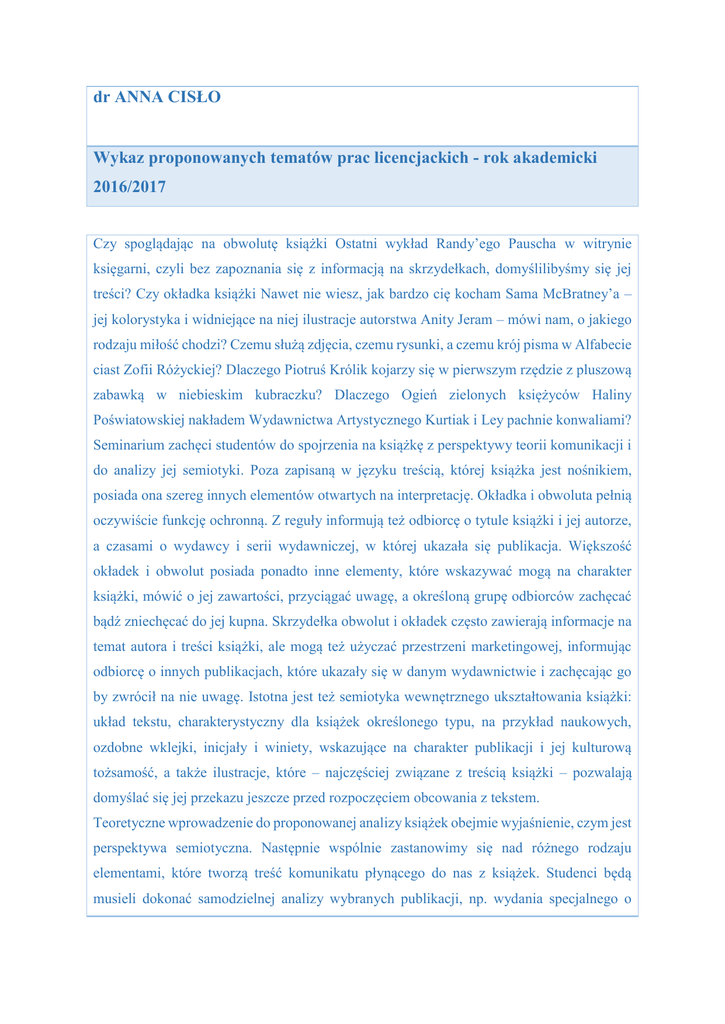 dr ANNA CISŁO Wykaz proponowanych tematów prac licencjackich - rok akademicki 2016/2017 Czy spoglądając na obwolutę książki Ostatni wykład Randy’ego Pauscha w witrynie księgarni, czyli bez zapoznania się z informacją na skrzydełkach, domyślilibyśmy się jej treści? Czy okładka książki Nawet nie wiesz, jak bardzo cię kocham Sama McBratney’a – jej kolorystyka i widniejące na niej ilustracje autorstwa Anity Jeram – mówi nam, o jakiego rodzaju miłość chodzi? Czemu służą zdjęcia, czemu rysunki, a czemu krój pisma w Alfabecie ciast Zofii Różyckiej? Dlaczego Piotruś Królik kojarzy się w pierwszym rzędzie z pluszową zabawką w niebieskim kubraczku? Dlaczego Ogień zielonych księżyców Haliny Poświatowskiej nakładem Wydawnictwa Artystycznego Kurtiak i Ley pachnie konwaliami? Seminarium zachęci studentów do spojrzenia na książkę z perspektywy teorii komunikacji i do analizy jej semiotyki. Poza zapisaną w języku treścią, której książka jest nośnikiem, posiada ona szereg innych elementów otwartych na interpretację. Okładka i obwoluta pełnią oczywiście funkcję ochronną. Z reguły informują też odbiorcę o tytule książki i jej autorze, a czasami o wydawcy i serii wydawniczej, w której ukazała się publikacja. Większość okładek i obwolut posiada ponadto inne elementy, które wskazywać mogą na charakter książki, mówić o jej zawartości, przyciągać uwagę, a określoną grupę odbiorców zachęcać bądź zniechęcać do jej kupna. Skrzydełka obwolut i okładek często zawierają informacje na temat autora i treści książki, ale mogą też użyczać przestrzeni marketingowej, informując odbiorcę o innych publikacjach, które ukazały się w danym wydawnictwie i zachęcając go by zwrócił na nie uwagę. Istotna jest też semiotyka wewnętrznego ukształtowania książki: układ tekstu, charakterystyczny dla książek określonego typu, na przykład naukowych, ozdobne wklejki, inicjały i winiety, wskazujące na charakter publikacji i jej kulturową tożsamość, a także ilustracje, które – najczęściej związane z treścią książki – pozwalają domyślać się jej przekazu jeszcze przed rozpoczęciem obcowania z tekstem. Teoretyczne wprowadzenie do proponowanej analizy książek obejmie wyjaśnienie, czym jest perspektywa semiotyczna. Następnie wspólnie zastanowimy się nad różnego rodzaju elementami, które tworzą treść komunikatu płynącego do nas z książek. Studenci będą musieli dokonać samodzielnej analizy wybranych publikacji, np. wydania specjalnego o „bogatej” semiotyce, analizy nastawionej na porównanie wydań tego samego utworu, charakterystykę serii wydawniczej, książek adresowanych do określonego odbiorcy, związanych z określoną kulturą. Temat pracy każdorazowo związany będzie z wybranym utworem, analizowanym z perspektywy semiotycznej. Poniższe tematy, w większości związane z pytaniami wprowadzającymi do opisu seminarium, są przykładowe.. Nr 1. 2. 3. 4. 5. TEMAT Semiotyka okładek serii wydawniczej Baśnie Świata w języku polskim wydawnictwa Media Rodzina Innowacyjność ukształtowania książek kucharskich wydawnictwa Dwie Siostry Wizerunek Ani z Zielonego Wzgórza na okładkach wybranych polskich wydań powieści Lucy Maud Montgomery Zakorzenienie w historii i kulturze Irlandii książki The Secret of Kells Tomma Moore’a Mapy Aleksandry i Daniela Mizielińskich jako źródło informacji naukowej
