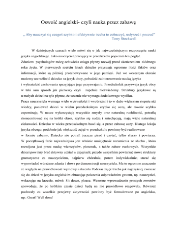 Oswoić angielski- czyli nauka przez zabawę „ Aby nauczyć się czegoś szybko i efektywnie trzeba to zobaczyć, usłyszeć i poczuć” Tony Stockwell W dzisiejszych czasach wiele mówi się o jak najwcześniejszym rozpoczęciu nauki języka angielskiego. Jako nauczyciel pracujący w przedszkolu popieram ten pogląd. Zdaniem psychologów mózg człowieka osiąga płynny rozwój przed ukończeniem siódmego roku życia. W pierwszych sześciu latach dziecko przyswaja ogromne ilości faktów oraz informacji, które są później przechowywane w jego pamięci. Już we wczesnym okresie możemy uwrażliwić dziecko na język obcy, pobudzić zainteresowanie nauką języka i wykształcić zachowania sprzyjające jego przyswajaniu. Przedszkolak przyswaja język obcy w taki sam sposób jak pierwszy czyli zupełnie nieświadomy. Struktury językowe są u małych dzieci na tyle płynne, że uczenie nie wymaga dodatkowego wysiłku. Praca nauczyciela wymaga wiele wytrwałości i wyobraźni i to w dużo większym stopniu niż wiedzy, ponieważ dzieci w wieku przedszkolnym szybko się uczą, ale równie szybko zapominają. W nauce wykorzystują wszystkie zmysły oraz naturalną ruchliwość, potrafią skoncentrować się na krótki okres, szybko się nudzą i zniechęcają, mają wiele naturalnej ciekawości. Dziecko w wieku przedszkolnym bawi się, a przez zabawę uczy. Dlatego lekcja języka obcego, podobnie jak większość zajęć w przedszkolu powinny być realizowane w formie zabawy. Dziecko nie potrafi jeszcze pisać i czytać, tylko słyszy i powtarza. W początkowej fazie najważniejsza jest właśnie umiejętność rozumienia ze słuchu , która rozwijana jest przez naukę wierszyków, piosenek, a także zabaw ruchowych. Wszystkie dzieci powinny brać aktywny udział w zajęciach; przede wszystkim powtarzać nowe struktury gramatyczne za nauczycielem, najpierw chóralnie, potem indywidualnie; starać się wypowiadać wdrażane zdania i słowa po demonstracji nauczyciela. Ma to ogromne znaczenie ze względu na prawidłowość wymowy i akcentu Podczas zajęć trzeba jak najczęściej zwracać się do dzieci w języku angielskim obrazując polecenia odpowiednim gestem, np. nauczyciel, wskazując na krzesło, mówi: Sit down, please. Wczesne wprowadzanie prostych zwrotów spowoduje, że po krótkim czasie dzieci będą na nie prawidłowo reagowały. Również pochwały za wszelkie przejawy aktywności powinny być formułowane po angielsku, np.: Great! Well done! Rozpoczynając naukę języka obcego we wczesnym dzieciństwie dziecko z pewnością polubi ten język. Łatwiej też będzie mu odnosić sukcesy podczas szkolnych lekcji języka. Mamo, Tato już umiem!! My toys: Teddy Bear, a ball, a book, a car, a doll, a bag, a kite, a train, a plane, a bike, a balloon, Piosenki: Hello! Hello! Hello! Hello! I’m Teddy. What’s your name? What’s your name? Hello! Hello! I’m Kasia. What’s your name? What’s your name? Hello! Hello! I’m Andy. What’s your name? What’s your name? Hello! Hello! I’m Ola. What’s your name? What’s your name? This is Kasia This is Kasia. Kasia is my friend. Look! She’s got a kite! She’s got a kite! OK! This is Andy. Andy is my friend. Look! He’s got a plane! He’s got a plane! OK! This is Ola. Ola is my friend. Look! She’s got a bike! She’s got a bike! OK! This is Tomek. Tomek is my friend. Look! He’s got a train! He’s got a train! OK! A kite, a plane, A bike, a train, Look what they’ve got, OK! OK! OK! I am Teddy. I am your friend. Let’s play together! Oh, yes! Oh, yes! Oh, yes! Zabawa Teddy Bear Teddy Bear, Teddy Bear - clap your hands! Teddy Bear, Teddy Bear - turn around! Teddy Bear, Teddy Bear - point to your nose! Teddy Bear, Teddy Bear - touch your toes! Zabawa Head and shoulders Head and shoulders, knees and toes, knees and toes. Eyes and ears and mouth and nose, mouth and nose. Head and shoulders, knees and toes, knees and toes, knees and toes! Wyliczanki: One sun. One sun! One cloud. One cloud! One tree. One tree! One bird. One bird! One bee. One bee! One butterfly. One butterfly! One girl. One girl! One boy. One boy! One flower. One flower! One potato, two potatoes, three potatoes, four! Five potatoes, six potatoes, seven potatoes, more! Good luck!! mgr Aneta Zniszczoł