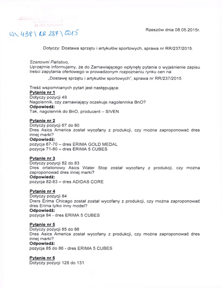 , ^ Rzeszów dnia 08.05.2015r. Dotyczy; Dostawa sprzętu i artykułów sportowych, sprawa nr RR/237/2015. Szanowni Państwo, Uprzejmie informujemy, że do Zamawiającego wpłynęły pytania o wyjaśnienie zapisu treści zapytania ofertowego w prowadzonym rozpoznaniu rynku cen na: „Dostawę sprzętu i artykułów sportowych”, sprawa nr RR/237/2015 Treść wspomnianych pytań jest następująca: Pytanie nr 1 Dotyczy pozycji 49 Nagolennik, czy zamawiający oczekuje nagolennika BnO? Odpowiedź: Tak, nagolennik do BnO, producent - SIVEN Pytanie nr 2 Dotyczy pozycji 67 do 80 Dres Asics America został wycofany z produkcji, czy można zaproponować dres innej marki? Odpowiedź; pozycja 67-70 - dres ERIMA GOLD MEDAL pozycja 71-80 - dres ERIMA 5 CUBES Pytanie nr 3 Dotyczy pozycji 82 do 83 Dres ortalionowy Asics Water Stop został wycofany z produkcji, czy można zaproponować dres innej marki? Odpowiedź: pozycja 82-83 - dres ADIDAS CORE Pytanie nr 4 Dotyczy pozycji 84 Drers Erima Chicago został został wycofany z produkcji, czy można zaproponować dres Erima tylko inny model? Odpowiedź: pozycja 84 - dres ERIMA 5 CUBES Pytanie nr 5 Dotyczy pozycji 85 do 86 Dres Asics America został wycofany z produkcji, czy można zaproponować dres innej marki? Odpowiedź: pozycja 85 do 86 - dres ERIMA 5 CUBES Pytanie nr 6 Dotyczy pozycji 128 do 131 Koszulki i spodenki firmy Zina w biało-niebieskie pasy są niedostępne na rynku, czy można zaoferować produkt równoważny innej marki? Odpowiedź: pozycja 128-129 - koszulka sportowa COLO GIANT PI pozycja 130-13 1 - spodenki sportowe COLO Pytanie nr 7 Dotyczy pozycji 159 do 166 Buty Asics Nimbus 16 są butami na rok 2014, na rok 2015 weszły ulepszone buty Asics Nimbus 17, czy można zaoferować model Nimbus 17? Odpowiedź: Tak, ASICS NIMBUS 17 Pytanie nr 8 Dotyczy pozycji 167 do 170 Buty Asics Kayano 20 są butami na rok 2014, na rok 2015 weszły nowe buty Asics Kayano 21, czy można zaoferować model Kayano 21? Odpowiedź: Tak, ASICS KAYANO 21 Pytanie nr 9 Dotyczy pozycji 171 do 176 Buty Asics Zaraca 2 są butami na rok 2014, na rok 2015 weszły nowe buty Asics Zaraca 3, czy można zaoferować model Zaraca 3? Odpowiedź: Tak, ASICS Zaraca 3 Pytanie nr 10 Dotyczy pozycji 184 do 185 Buty Keen Maeshall WP są niedostępne na rynku, czy można zaoferować buty turystyczne innej marki? Odpowiedź: Buty SALOMON ESKAPE AERO NILE GREEN Jednocześnie Zamawiający zmienia formularz kalkulacji ceny ofertowej (załącznik nr 1A) oraz termin składania ofert z dnia 12.05.2015r. godzina 11:00 na 14.05.2015r. godzina 11:00. otwarcie ofert godzina 11:30.