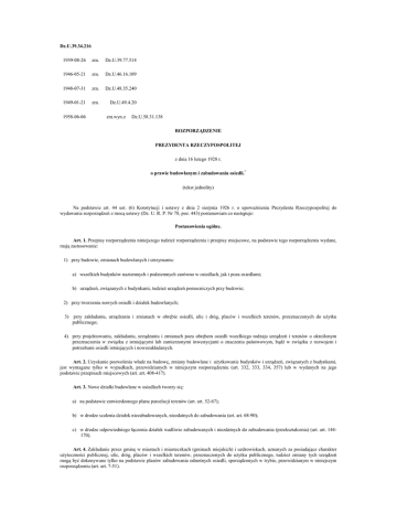Dz.U.39.34.216 1939-08-26 zm. Dz.U.39.77.514 1946-05-21 zm. Dz.U.46.16.109 1948-07-31 zm. Dz.U.48.35.240 1949-01-21 zm. Dz.U.49.4.20 1958-06-06 zm.wyn.z Dz.U.58.31.138 ROZPORZĄDZENIE PREZYDENTA RZECZYPOSPOLITEJ z dnia 16 lutego 1928 r. o prawie budowlanym i zabudowaniu osiedli.* (tekst jednolity) Na podstawie art. 44 ust. (6) Konstytucji i ustawy z dnia 2 sierpnia 1926 r. o upowaŜnieniu Prezydenta Rzeczypospolitej do wydawania rozporządzeń z mocą ustawy (Dz. U. R. P. Nr 78, poz. 443) postanawiam co następuje: Postanowienia ogólne. Art. 1. Przepisy rozporządzenia niniejszego tudzieŜ rozporządzenia i przepisy miejscowe, na podstawie tego rozporządzenia wydane, mają zastosowanie: 1) przy budowie, zmianach budowlanych i utrzymaniu: a) wszelkich budynków naziemnych i podziemnych zarówno w osiedlach, jak i poza osiedlami; b) urządzeń, związanych z budynkami, tudzieŜ urządzeń pomocniczych przy budowie; 2) przy tworzeniu nowych osiedli i działek budowlanych; 3) przy zakładaniu, urządzaniu i zmianach w obrębie osiedli, ulic i dróg, placów i wszelkich terenów, przeznaczonych do uŜytku publicznego; 4) przy projektowaniu, zakładaniu, urządzaniu i zmianach poza obrębem osiedli wszelkiego rodzaju urządzeń i terenów o określonym przeznaczeniu w związku z istniejącymi lub zamierzonymi inwestycjami o znaczeniu państwowym, bądź w związku z rozwojem i potrzebami osiedli istniejących i nowozakładanych. Art. 2. Uzyskanie pozwolenia władz na budowę, zmiany budowlane i uŜytkowanie budynków i urządzeń, związanych z budynkami, jest wymagane tylko w wypadkach, przewidzianych w niniejszym rozporządzeniu (art. 332, 333, 334, 357) lub w wydanych na jego podstawie przepisach miejscowych (art. art. 408-417). Art. 3. Nowe działki budowlane w osiedlach tworzy się: a) na podstawie zatwierdzonego planu parcelacji terenów (art. art. 52-67); b) w drodze scalenia działek niezabudowanych, niezdatnych do zabudowania (art. art. 68-90); c) w drodze odpowiedniego łączenia działek wadliwie zabudowanych i niezdatnych do zabudowania (przekształcenia) (art. art. 144170). Art. 4. Zakładanie przez gminę w miastach i miasteczkach (gminach miejskich) i uzdrowiskach, uznanych za posiadające charakter uŜyteczności publicznej, ulic, dróg, placów i wszelkich terenów, przeznaczonych do uŜytku publicznego, tudzieŜ zmiany tych urządzeń mogą być dokonywane tylko na podstawie planów zabudowania odnośnych osiedli, sporządzonych w trybie, przewidzianym w niniejszym rozporządzeniu (art. art. 7-51). Art. 5. (1) W miarę potrzeby będą wydane dla miast, uzdrowisk, uznanych za posiadające charakter uŜyteczności publicznej, i gmin wiejskich, miejscowe przepisy policyjno-budowlane, zastosowane do warunków lokalnych. (2) O ile nie chodzi o miasta, wydzielone z powiatowych związków samorządowych, albo o uzdrowiska, uznane za posiadające charakter uŜyteczności publicznej, przepisy takie mogą być wydane wspólnie dla kilku albo dla szeregu miast, lub gmin wiejskich. Art. 6. Za osiedla w rozumieniu niniejszego rozporządzenia uwaŜa się: a) miasta i miasteczka, b) uzdrowiska, uznane za posiadające charakter uŜyteczności publicznej na podstawie ustawy z dnia 23 marca 1922 r. (Dz. U. R. P. Nr 31, poz. 254), w granicach okręgu ochrony sanitarnej, c) osady wiejskie i fabryczne, kolonie robotnicze i w ogóle wszelkie skupienia w jednej grupie, co najmniej 10 budynków mieszkalnych. CZĘŚĆ I. Tworzenie i zabudowanie osiedli. TYTUŁ I. Plany zabudowania. Rozdział 1. Istota planu zabudowania i zasady tworzenia i zabudowania osiedli. Art. 7-20. (1) (uchylone). Rozdział 2. Postępowanie przy sporządzaniu planów zabudowania. Art. 21-38. (2) (uchylone). Rozdział 3. Wznoszenie budynków w okresie sporządzania planów zabudowania. Art. 39-42. (3) (uchylone). Rozdział 4. Skutki zatwierdzenia planów zabudowania. Art. 43-50. (4) (uchylone). Rozdział 5. Zmiany w zatwierdzonych planach zabudowania. Art. 51. (5) (uchylony). TYTUŁ II. Podział terenów (parcelacja). Rozdział 1. Istota parcelacji. Art. 52-56. (6) (uchylone). Rozdział 2. Zatwierdzanie planów parcelacji. Art. 57-63. (7) (uchylone). Rozdział 3. Urządzanie ulic, dróg i innych obiektów, przeznaczonych do uŜytku publicznego, przy tworzeniu nowych osiedli lub nowych dzielnic. Art. 64-67. (8) (uchylone). TYTUŁ III. Scalenie działek budowlanych. Rozdział 1. Istota scalenia. Art. 68. (1) W wypadkach, gdy w części osiedla, objętej prawomocnym planem zabudowania, znajdują się działki niezabudowane, które ze względu na ich rozmiary, kształt lub połoŜenie nie mogą być zabudowane zgodnie z wymogami przepisów obowiązujących i planem zabudowania, działki te mogą ulec scaleniu w trybie, przewidzianym niŜej w art. 69-143. (2) W razie, gdy osiedle lub jego część zostały zniszczone wskutek klęski Ŝywiołowej, brak planu zabudowania nie moŜe być przeszkodą do dokonania scalenia. (3) Działki, na których znajdują się budynki, tudzieŜ działki niezabudowane, lecz do zabudowania zgodnie z wymogami przepisów obowiązujących i planu zabudowania zdatne, mogą w całości lub w części ulec scaleniu, gdy to jest konieczne dla dokonania scalenia przyległych do nich działek, niezdatnych do zabudowania z powodów, podanych w ust. (1) i o ile korzyści ze scalenia przewyŜszają korzyści z dotychczasowego uŜytkowania. Działki zdatne do zabudowania, zgodnego z przepisami i z planem zabudowania, mogą ulec scaleniu równieŜ w tych przypadkach, gdy wskutek ustalenia w prawomocnym planie zabudowania linij regulacyjnych, albo linij zabudowania, działki te stały się niezdatnymi do ekonomicznego lub do celowego zabudowania. Art. 69. Działki niezabudowane, które zdatne są do zabudowania zgodnie z przepisami obowiązującymi i planem zabudowania, lecz nie mogą być zabudowane w sposób ekonomiczny i celowy ze względu na ich kształt, mogą poza wypadkami, przewidzianymi w ust. (3) art. 68, r
