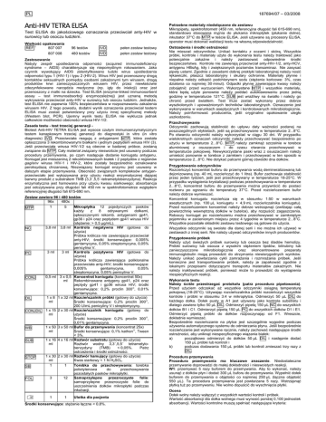 [PL] 187694/07 – 03/2008 Anti-HIV TETRA ELISA Test ELISA do jakościowego oznaczania przeciwciał anty-HIV w surowicy lub osoczu ludzkim. Wielkość opakowania 807 007 [REF]1 807 008 96 testów [IVD] pełen zestaw testowy 480 testów [IVD] pełen zestaw testowy Zastosowanie Nabyty zespół upośledzenia odporności (acquired immunodeficiency syndrome – AIDS) charakteryzuje się niepomyślnym rokowaniem. Jako czynnik wywołujący AIDS zidentyfikowano ludzki wirus upośledzenia odporności typu 1 (HIV-1) i typu 2 (HIV-2). Wirus HIV jest przenoszony drogą kontaktów seksualnych pomiędzy osobami zakażonymi tym wirusem, drogą produktów krwi zanieczyszczonych wirusem HIV, przez niewłaściwie zdezynfekowane narzędzia medyczne (np. igły do iniekcji) oraz jest przenoszony z matki na dziecko. Test ELISA (enzyme-linked immunosorbent assay – test immunoabsorbcji enzymozależnej) jest uznaną metodą wykrywania przeciwciał anty-HIV w surowicy lub osoczu ludzkim. Jednakże, test ELISA nie zapewnia 100% bezpieczeństwa w rozpoznawaniu zakażenia wirusem HIV. Z tego powodu, dodatni wynik oznaczenia przeciwciał testem ELISA musi zostać potwierdzony przy użyciu innej specyficznej metody (Western blot, PCR). Ujemny wynik testu ELISA nie wyklucza jednak całkowicie możliwości obecności wirusa HIV-1/2. Zasada testu - test trzeciej generacji Biotest Anti-HIV TETRA ELISA jest wysoce czułym immunoenzymatycznym testem kanapkowym trzeciej generacji do diagnostyki in vitro (in vitro diagnosis) IVD. Przeciwciała reagują z antygenami MTP, która została opłaszczona 3 rekombinowanymi białkami i jednym peptydem wirusa HIV (3). Jeśli przeciwciała wirusa HIV-1/2 są obecne w badanej próbce, zostaną związane do MTP. Cały materiał związany nieswoiście jest usuwany podczas procedury przemywania, po czym następuje dodanie koniugatu antygenu. Koniugat jest mieszaniną 2 rekombinowanych białek i 2 peptydów z regionów gag/env wirusa HIV-1 i HIV-2, które zostały bezpośrednio oznakowane peroksydazą chrzanową. Niezwiązany koniugat enzymu jest usuwany w dalszym etapie przemywania. Obecność związanych kompleksów antygenprzeciwciało jest wykazywana przy użyciu reakcji enzymatycznej dającej barwny produkt z substratem TMB (3,3´,5,5´-tetrametylobenzydyna). Reakcja enzymatyczna jest hamowana przy użyciu kwasu siarkowego; absorbancja jest odczytywana przy długości fali 450 nm w spektrofotometrze względem referencyjnej długości fali 615-690 nm. Zestaw zawiera 96 i 480 testów 96x 480x MTP NC PC 1 3,8 ml 3 ml CONJ 0,5 ml DIL 1x8 ml CONJDIL 1 x 15 ml WB 1 x 50 ml SUB 1 x 16 ml STOP 1 x 30 ml 1 SB FOL 3 1 5 Mikropłytka 12 pojedynczych pasków każdy z 8 odrywanymi dołkami, opłaszczonymi rekomb. antygenami gp41, gp36 i p24 oraz peptydem gp41 wirusa HIV (stężenie: > 0,5 µg/mL). 3,8 ml Kontrola negatywna HIV (gotowa do użycia) Próbka królicza nie zawierająca przeciwciał anty-HIV; środki konserwujące: 0,005% gentamycyna, 0,05% streptomycyna, 0,05% penicylina V. 3 ml Kontrola pozytywna HIV (gotowa do użycia) Próbka królicza zawierająca poliklonalne przeciwciała anty-HIV; środki konserwujące: 0,005% gentamycyna, 0,05% streptomycyna, 0,05% penicylina V. 3 x 0,5 Koncentrat koniugatu (koncentrat 50x) ml Rekombinowane antygeny gp41, p24 oraz peptydy gp41 i gp36 wirusa HIV; środki konserwujące: 0,2% proclin 300®, 0,01% gentamycyna. 1 x 32 ml Rozcieńczalnik próbki (gotowy do użycia) Środki konserwujące: 0,2% proclin 300®, 200 U/mL penicyliny V i streptomycyny. 2 x 30 ml Rozcieńczalnik koniugatu (gotowy do użycia) Środki konserwujące: 0,2% proclin 300®, 0,01% gentamycyna. 3 x 50 ml Bufor do przemywania (koncentrat 25x) Środki konserwujące: 0,1% kathon®, Tween < 3%. 4 x 16 ml Roztwór substratu (gotowy do użycia) Roztwór wodny 3,3´,5,5´ tetrametylobenzydyny (TMB) < 0,05%. Patrz ostrzeżenia i środki ostrożności. 2 x 30 ml Roztwór hamujący (gotowy do użycia) Kwas siarkowy < 1 N H2SO4. 1 Torebka do przechowywania: torebka polietylenowa do przechowywania pozostałych pasków mikropłytki. 12 Samoprzylepne przezroczyste folie: samoprzylepne przezroczyste folie do uszczelnienia dołków mikropłytki podczas inkubacji. 1 Ulotka dla pacjenta Środki konserwujące: stężenie łączne < 0,8%. Potrzebne materiały niedołączone do zestawu Mikropipety, spektrofotometr (450 nm, referencyjna długość fali 615-690 nm), standardowo stosowana myjnia do płukania mikropłytek (płukanie dolne), inkubator 37°C do MTP w teście ELISA. Jeśli używane są procesory ELISA, operator musi dokonać walidacji testu na własną odpowiedzialność. Ostrzeżenia i środki ostrożności Nie mieszać odczynników. Unikać kontaktu z oczami i skórą. Wszystkie próbki, kontrole i materiały użyte do wykonania testu należy traktować jako potencjalnie zakaźne i należy zastosować odpowiednie środki bezpieczeństwa. Kontrole nie zawierają przeciwciał anty-HIV-1/2, anty-HCV, antygenu HBsAg, kiły i zwiększonych poziomów transaminaz. Nie zasysać pipety ustami. Zgodnie z zasadami dobrej praktyki laboratoryjnej należy nosić rękawiczki, płaszcz laboratoryjny i okulary ochronne. Materiały płynne i niepalne należy odkazić podchlorynem sodu (stężenie końcowe: 3%, czas działania co najmniej 30 minut). Odpadki płynne zawierające kwasy należy zobojętnić przed wyrzuceniem. Wykorzystane MTP i wszystkie materiały, które będą użyte ponownie należy poddać autoklawowaniu przez jedną godzinę w temperaturze 121°C. SUB jest wrażliwy na światło i należy go chronić przed światłem. Test musi zostać wykonany przez dobrze wyszkolonych i upoważnionych techników laboratoryjnych. Oznaczenie jest wykonywane w warunkach aseptycznych i kontrolowanych mikrobiologicznie. Należy poinformować producenta, jeśli oryginalne opakowanie uległo uszkodzeniu. Przechowywanie Odczynniki zachowują stabilność do upływu daty ważności podanej na poszczególnych etyki