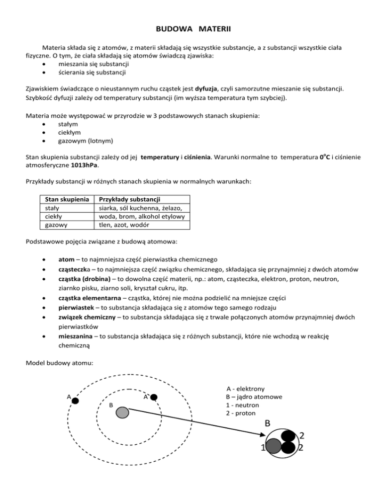BUDOWA MATERII Materia składa się z atomów, z materii składają się wszystkie substancje, a z substancji wszystkie ciała fizyczne. O tym, że ciała składają się atomów świadczą zjawiska: mieszania się substancji ścierania się substancji Zjawiskiem świadczące o nieustannym ruchu cząstek jest dyfuzja, czyli samorzutne mieszanie się substancji. Szybkość dyfuzji zależy od temperatury substancji (im wyższa temperatura tym szybciej). Materia może występować w przyrodzie w 3 podstawowych stanach skupienia: stałym ciekłym gazowym (lotnym) Stan skupienia substancji zależy od jej temperatury i ciśnienia. Warunki normalne to temperatura 0oC i ciśnienie atmosferyczne 1013hPa. Przykłady substancji w różnych stanach skupienia w normalnych warunkach: Stan skupienia stały ciekły gazowy Przykłady substancji siarka, sól kuchenna, żelazo, woda, brom, alkohol etylowy tlen, azot, wodór Podstawowe pojęcia związane z budową atomowa: atom – to najmniejsza część pierwiastka chemicznego cząsteczka – to najmniejsza część związku chemicznego, składająca się przynajmniej z dwóch atomów cząstka (drobina) – to dowolna część materii, np.: atom, cząsteczka, elektron, proton, neutron, ziarnko pisku, ziarno soli, kryształ cukru, itp. cząstka elementarna – cząstka, której nie można podzielić na mniejsze części pierwiastek – to substancja składająca się z atomów tego samego rodzaju związek chemiczny – to substancja składająca się z trwale połączonych atomów przynajmniej dwóch pierwiastków mieszanina – to substancja składająca się z różnych substancji, które nie wchodzą w reakcję chemiczną Model budowy atomu: A A B A - elektrony B – jądro atomowe 1 - neutron 2 - proton B 1 2 2 Atom składa się z jądra i krążących wokół niego elektronów. W jądrze znajdują się protony i neutrony. Protony mają ładunek dodatni, elektrony – ujemny, a neutrony są elektrycznie obojętne. Ilość elektronów i protonów w atomie jest taka sama. Atom nie ma ładunku elektrycznego. Atomy różnych pierwiastków mają inną liczbę protonów i elektronów, np.: wodór – po 2, żelazo – po 56. Za własności poszczególnych substancji odpowiadają siły międzycząsteczkowe. Własności poszczególnych stanów skupienia: Stan skupienia stały ciekły gazowy Kształt Objętość nie można zmienić określony nieokreślony (dopasowują się do naczynia) nieokreślony (wypełniają całą przestrzeń) nie można zmienić można zmienić Siły międzycząsteczkowe dzielimy na : siły spójności – występują między cząsteczkami tej samej substancji siły przylegania – występują między cząsteczkami rożnych substancji Napięcie powierzchniowe – siły wywołujące powstawanie cienkiej błony na powierzchni cieczy, powoduje np. tworzenie się kropel cieczy. Zestawienie budowy cząsteczkowej substancji: Stan skupienia stały ciekły Odległości międzycząsteczkowe bardzo małe małe Siły międzycząsteczkowe bardzo duże duże gazowy duże małe Ruchy cząsteczek drgania powolne po całej objętości szybkie po całej objętości Siły międzycząsteczkowe działają na bardzo małe odległości i im bliżej znajdują się cząstki, tym są większe. Ciała stałe pod względem własności mechanicznych dzielimy na: twarde – stal, mosiądz kruche – kreda szkolna, szkło plastyczne – plastelina, modelina sprężyste – guma, sprężyna Ciała stałe pod względem budowy cząsteczkowej (ułożenia atomów) dzielimy na: krystaliczne – regularne ułożenie atomów, np.: sól kuchenna, diament, grafit, miedź, lód bezpostaciowe – nieregularne ułożenie atomów, np.: bursztyn, szkło, guma