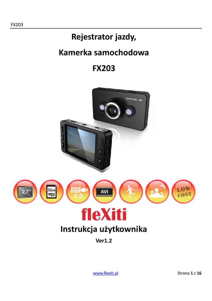 FX203 Rejestrator jazdy, Kamerka samochodowa FX203 Instrukcja użytkownika Ver1.2 www.flexiti.pl Strona 1 z 16 FX203 Wstęp Cyfrowa kamera FX203 HD (wysokiej rozdzielczości) jest wykonana z wykorzystaniem najnowszych technologii. Może służyć zarówno jako kamera HD, jak również jako profesjonalna kamerka samochodowa. Kamerka samochodowa (rejestrator jazdy) nagrywa w rozdzielczości zdjęcia są wykonywanie z rozdzielczością do 1920x1080P, a do 5 mega pikseli. Używając karty SDHC jako pamięci do przechowywania nagrań, przy równoczesnym małym poborze energii, kamera HD może nagrywać obraz wideo, audio i robić zdjęcia, po czym zapisywać je na karcie pamięci.. Wideo może być wyświetlane i przeglądane bezpośrednio na wyświetlaczu, na ekranie telewizora podłączonego za pomocą kabla HDMI, lub przeglądane i kopiowane za pomocą komputera. www.flexiti.pl Strona 2 z 16 FX203 Zawartość opakowania kamerka FX203 Przykładowy montaż rejestratora FX203 w samochodzie www.flexiti.pl Strona 3 z 16 FX203 1. Instrukcja instalacji i. Wyłącz silnik samochodu lub odłącz kamerę od zasilania. ii. Włóż kartę SD w slot. [Uwaga] Sugerujemy użycie karty SD klasa 6 lub wyższa, i o pojemności nie mniejszej niż 1 GB. Urządzenie obsługuje karty SD o pojemności 32GB maksymalnie. [Uwaga] Należy dobrze umyć szybę samochodu nim przylepisz uchwyt. Zabrudzona I wilgotna szyba może powodować że uchwyt będzie się odklejał. iii. Podłącz kamerę na stałe do instalacji 12V lub do gniazda zapalniczki. [Uwaga] Kabel zasilający USB nie powinien zwisać na przedniej szybie samochodu. iv. Zależnie od potrzeb wyreguluj ustawienie kamery. v. Uruchom silnik. [Uwaga] Jeśli kamera jest ustawiona I zainstalowana prawidłowo, kamera automatycznie wejdzie w tryb nagrywania w momencie uruchomienia silnika. Sprawdź na ekranie LCD obraz, dostosuj również ustawienia dostępne w Menu urządzenia. Przydatne informacje Aby nagrania z kamerki były prawidłowe i bez zacięć należy zastosować dobrej jakości kartę MicroSD, o dużej prędkości zapisu. Czytaj więcej tu... Dobrze zaprogramowana kamerka samochodowa po uruchomieniu samochodu zaczyna automatycznie rejestrację, a kończy kilkanaście sekund po wyłączeniu silnika (nie wymaga ingerencji) Uaktywnienie opcji wykrywania ruchu może spowodować nieciągłość nagrania, gdyż kamerka nagrywać będzie tylko w przypadku wykrycia ruchu. Tryb ten pozwala oszczędzać miejsce na karcie SD, jednakże nie zapewnia ciągłości. Kamera automatycznie nagrywa wszystkie nagranie w trybie cyklicznym. Oznacza to że w przypadku braku wolnego miejsca kasowane będą najstarsze nagrania, a w ich miejsce nagrywane nowe. Kamera zaopatrzona jest również w detekcję niskiego napięcia baterii, i w razie wykrycia takiej sytuacji automatycznie kończy zapis. Umiejscowienie kamerki za lusterkiem powoduje że kamerka nie przeszkadza kierowcy w czasie jazdy, a równocześnie doskonale nagrywa. Nie każdy obszar okna samochodu jest wycierany wycieraczką, należy na to zwrócić uwagę w czasie montażu. Szyba samochodu, szczególnie przyciemniana może powodować refleksy i odbicia deski rozdzielczej, dlatego należy starać się umieścić obiektyw kamery jak najbliżej szyby samochodu. Doświetlenie nocne, czy też nazywane inaczej "night vision" jest tylko elementem marketingu Chińskich producentów. Zakres takiego doświetlenia zamyka się w obszarze do 1 metra (a czasami dużo mniej) i jego funkcjonalność jest znikoma. Nie są nam znane kamerki samochodowe które rzeczywiście "widzą" w nocy (kamery noktowizyjne to potrafią, jest to jednak zupełnie inna półka cenowa).Jakość obrazu nocą zależeć będzie głównie od oświetlenia zewnętrznego np. lampy uliczne, reflektory samochodów. www.flexiti.pl Strona 4 z 16 FX203 Cechy rejestratora: Szerokokątny obiektyw o kącie widzenia 140 stopni. Rozdzielczość: 1920×1080P FULL HD . Zaawansowany kodek kompresji AVI J-MPG Aparat, zdjęcia w rozdzielczości 4X zoom cyfrowy, ostrość od 12cm do nieskończoności. 2,7 calowy wyświetlacz LCD, podgląd w czasie nagrywania. Diody podświetlania dla nagrań przy słabym oświetleniu. Złącze do transmisji HDMI wideo. 5 rodzajów jakości nagrywanego materiału wideo. płynny obraz wideo. Specjalny, przegubowy samochodowy uchwyt mocujący do szyby. Zabezpieczenie nagrań, nawet w przypadku nagłego wypadku nagrania wideo są 5 mega pikseli. zabezpieczone. Spójność nagrań wideo (brak przerw w nagraniach). Zasilanie bezpośrednio z gniazdka zapalniczki, szybkie podłączenie I nagrywanie w czasie jazdy. Automatyczne uruchamianie nagrywania w momencie uruchomienia silnika (również automatyczne wyłączanie po jego wyłączenia) Nagrywanie w pętli, z możliwością ustawienia długości fragmentów wideo. Możliwość przeglądania wideo w czasie nagrywania. Nagrywanie daty i czasu na nagranym materiale wideo. Ustawiany czas nagrywanych sekwencji wideo. Funkcja zdjęć, może wykonać zdjęcie w czasie nagrywania sekwencji wideo. Ładowanie akumulatorka poprzez złącze USB. Nagrywania na karcie MicroSD, o pojemności do 32GB. www.flexiti.pl Strona 5 z 16 FX203 Opis przycisków i złączy www.flexiti.pl Strona 6 z 16 FX203 Funkcje przycisków Przycisk MODE : W czasie oczekiwania przycisk służy do zmiany trybu pracy z trybu nagrywania wideo, w tryb fotograficzny ,w tryb odtwarzania wideo lub tryb ustawień. Przycisk MENU : Przycisk służy do wejścia i wyjścia z trybu programowania kamerki Przycisk Do góry/Na dół : W trybie ustawień (Menu) przyciski używane są do wyboru opcji. W innym przypadku przyciski te służą do wyboru plików które chcemy przeglądać, oraz w czasie przeglądania służą do regulacji głośności. W trybie nagrywania za pomocą tych przycisków możemy uaktywnić funkcję Zoom. Przycisk POWER : Krótkie naciśnięcie przycisku włącza rejestrator, naciśnięcie na 2 sekundy wyłącza. W trybie nagr