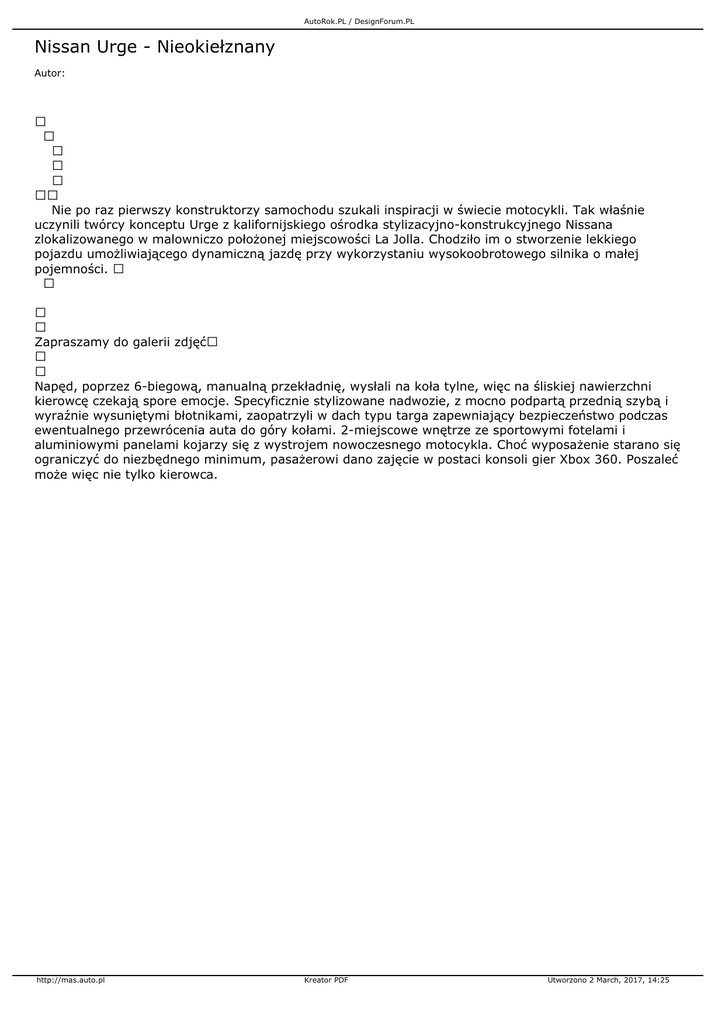 AutoRok.PL / DesignForum.PL Nissan Urge - Nieokiełznany Autor: Nie po raz pierwszy konstruktorzy samochodu szukali inspiracji w świecie motocykli. Tak właśnie uczynili twórcy konceptu Urge z kalifornijskiego ośrodka stylizacyjno-konstrukcyjnego Nissana zlokalizowanego w malowniczo położonej miejscowości La Jolla. Chodziło im o stworzenie lekkiego pojazdu umożliwiającego dynamiczną jazdę przy wykorzystaniu wysokoobrotowego silnika o małej pojemności. Zapraszamy do galerii zdjęć Napęd, poprzez 6-biegową, manualną przekładnię, wysłali na koła tylne, więc na śliskiej nawierzchni kierowcę czekają spore emocje. Specyficznie stylizowane nadwozie, z mocno podpartą przednią szybą i wyraźnie wysuniętymi błotnikami, zaopatrzyli w dach typu targa zapewniający bezpieczeństwo podczas ewentualnego przewrócenia auta do góry kołami. 2-miejscowe wnętrze ze sportowymi fotelami i aluminiowymi panelami kojarzy się z wystrojem nowoczesnego motocykla. Choć wyposażenie starano się ograniczyć do niezbędnego minimum, pasażerowi dano zajęcie w postaci konsoli gier Xbox 360. Poszaleć może więc nie tylko kierowca. http://mas.auto.pl Kreator PDF Utworzono 2 March, 2017, 14:25