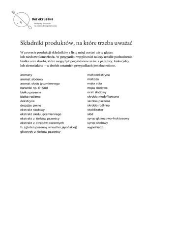 Bez okruszka Przepisy dla osób na diecie bezglutenowej Składniki produktów, na które trzeba uważać W procesie produkcji składników z listy mógł zostać użyty gluten lub niedozwolone zboża. W przypadku wątpliwości należy ustalić pochodzenie białka oraz skrobi, które mogą być pozyskiwane m.in. z pszenicy, kukurydzy lub ziemniaków – w dwóch ostatnich przypadkach jest dozwolone. aromaty maltodekstryna aromat słodu jęczmiennego mąka atta aromat słodowy barwniki np. E150d białko pszenne Przepisy dla osób białko na diecie bezglutenowej roślinne dekstryna drożdże piwne ekstrakt słodowy ekstrakt słodu jęczmiennego ekstrakt z kiełków pszenicy ekstrakt z otrębów pszennych fu (gluten pszenny w kuchni japońskiej) glicerydy z kiełków pszenicy maltoza mąka słodowa ocet słodowy skrobia modyfikowana skrobia pszenna skrobia roślinna stabilizator słód syrop glukozowo–fruktozowy syrop słodowy wypełniacz