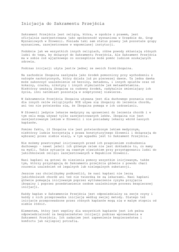Inicjacja do Sakramentu Przejścia Sakrament Przejścia jest religią, która, w zgodzie z prawem, jest oficjalnie zarejestrowana jako społeczność wyznaniowa w Urzędzie ds. Grup Wyznaniowych w Słowenii. Posiada taki sam status prawny jak pozostałe grupy wyznaniowe, zarejestrowane w wspomnianej instytucji. Podobnie jak we wszystkich innych religiach, różne powody skłaniają różnych ludzi do tego, by dołączyć do Sakramentu Przejścia. Ale Sakrament Przejścia ma w sobie coś wyjątkowego co szczególnie może pomóc ludziom szukających zdrowia. Podczas inicjacji użyta jest(w jednej ze swoich form)ibogaina. Na zachodzie Ibogaina zasłynęła jako środek pomocniczy przy wychodzeniu z nałogów narkotycznych, który działa już po pierwszej dawce. Ta jedna dawka może zakonczyć uzależnienie od heroiny, metadonu, i innych opiatów oraz od kokainy, cracku, nikotyny i innych stymulantów jak metaamfetamina. Niektórzy uważają ibogainę za cudowny środek, radykalnie zmieniający ich życie, inni natomiast pozostają w sceptycznej niewierze. W Sakramencie Przejścia Ibogaina używana jest dla duchowego poznania oraz dla innych celów religijnych; NIE używa się ibogainy do leczenia chorób, ani tez nie potwierdza się, że Ibogaina pomaga w ich uzdrawianiu. W Słowenii jedynie lekarze medycyny są uprawnieni do leczenia chorób i w tym celu mogą używać tylko zarejestrowanych leków. Ibogaina nie jest zarejestrowanym lekiem w Słowenii i nie posiadamy lekarzy wśród naszych kapłanów. Pomimo faktu, iż Ibogaina nie jest potwierdzonym lekiem medycznym, niektórzy ludzie korzystają z prawa konstytucyjnego Słowenii i dołączają do wybranej przez siebie wiary, w tym wypadku jest to Sakrament Przejścia. Nie możemy powstrzymać inicjowanych przed ich pragnieniem rozbudzenia duchowego – nawet jeżeli ich głównym celem nie jest dokładnie to, co mamy na myśli. Takie sytuacje są częstym zjawiskiem przy przystępowaniu ludzi do jakichkolwiek religii zarejestrowanych w Republice Słowenii. Nasi kapłani są gotowi do niesienia pomocy wszystkim inicjowanym, także tym, którzy przystępują do Sakramentu przejścia głównie z powodu chęci rzucenia uzależnień od legalnych lub nielegalnych substancji. Jeszcze raz chcielibyśmy podkreślić, że nasi kapłani nie leczą jakichkolwiek chorób ani też nie twierdzą że są lekarzami. Nasi kapłani głównie pomagają inicjowanym poprzez wytłumaczenie ryzyka przyjęcia ibogainy i poprzez przedstawienie osobom uzależnionym procesu bezpiecznej inicjacji. Każdy kapłan w Sakramencie Przejścia jest odpowiedzialny za swoje czyny i każdy z nich przeprowadza inicjację według swojej metody. Dlatego też inicjacje przeprowadzone przez różnych kapłanów mogą się w małym stopniu od siebie różnić. Elementem, który jest wspólny dla wszystkich kapłanów jest ich pełna odpowiedzialność za bezpieczeństwo inicjacji podczas wprowadzenia w Sakrament Przejścia. Ich zadaniem jest zapewnienie bezpieczeństwa i komfortu jak najlepiej potrafią. Jakkolwiek, każdy inicjowany jest również sam ODPOWIEDZIALNY ZA SWOJE CZYNY i MUSI przystąpić do inicjacji z całą odpowiedzialnością za siebie i swoje wybory w czasie trwania i po inicjacji. Za inicjowanych poniżej 18 roku życia odpowiedzialni są rodzice lub prawni opiekunowie. Najważniejsze rzeczy, które każdy inicjowany MUSI wiedzieć zanim przystąpi do Sakramentu Przejścia: Przed inicjacją potencjalny inicjowany musi podpisać oświadczenie, że przeprowadza inicjację z własnej woli i jest w dobrej kondycji psychicznej i fizycznej. Kapłan nie jest w stanie sprawdzić prawdziwości powyższego oświadczenia, dlatego też cała odpowiedzialność leży po stronie inicjowanego. W przypadkach gdy inicjowany nie podał ważnych informacji dotyczących swojego bezpieczeństwa, Kapłan który przeprowadza inicjację nie może wziąć odpowiedzialności za stan zdrowotny inicjowanego podczas seansu. Inicjowany MUSI rozumieć, że dobra kondycja fizyczna i psychiczna jest podstawowym warunkiem przyjęcia Sakramentu Przejścia. Inicjacja wymaga zdrowego ciała i ducha. Istnieją udokumentowane przypadki śmierci związane z Ibogainą (nie zaszły one podczas Sakramentu Przejścia). Nie udało się jednak ustalić konkretnych przyczyn zgonów, trudno więc powiedzieć, czy śmierć była bezpośrednim wynikiem spożycia ibogainy. Zanotowano pięć wypadków śmiertelnych mających związek z ibogainą w przeciągu 100 lat jej używania na zachodzie. Kapłan może odmówić inicjacji następującym osobom: Kobietom w ciąży Ludziom starszym Ludziom mającym problemy ze zdrowiem fizycznym (kłopoty z sercem, schizofrenia) oraz cierpiący na wiele innych poważnych chorób, które mogą uniemożliwić spokojne i bezpieczne przeżycie. Wyżej wymienieni nadal mogą przyjąć Sakrament Przejścia, jednak nie mogą uczestniczyć w samym akcie inicjacji. Ze względów bezpieczeństwa, inicjowani muszą od początku procesu stosować się do zaleceń kapłanów. Przed rozpoczęciem inicjacji, inicjowany musi podpisać wspomniany wyżej dokument o stanie zdrowia oraz uiścić odpowiednią kwotę, która pokrywa koszty związane z inicjacją. Inicjowany musi wyłączyć swoją komórkę, pager oraz inne urządzenia elektroniczne i oddać je na czas inicjacji kapłanowi. Wszystkie urządzenia zostaną zwrócone inicjowanemu po zakończeniu seansu. Proces inicjacji Inicjacja zaczyna się nad ranem. Inicjowany nie powinien nic jeść przed inicjacją. Inicjacja zaczyna się maksymalnie w przeciągu godziny po zażyciu świętego Sakramentu. Inicjowany NIE MOŻE być w czasie seansu pod wpływem jakiegokolwiek narkotyku. Inicjowanemu zaleca się wygodne, luźne ubranie. Jest wskazane, by inicjowany nie miał żadnych wyobrażeń o tym, co może otrzymać od Świętego Sakramentu. Najlepszą postawą jest przyjmowanie rzeczy, które przychodzą takimi, jakie są. Podczas pływani