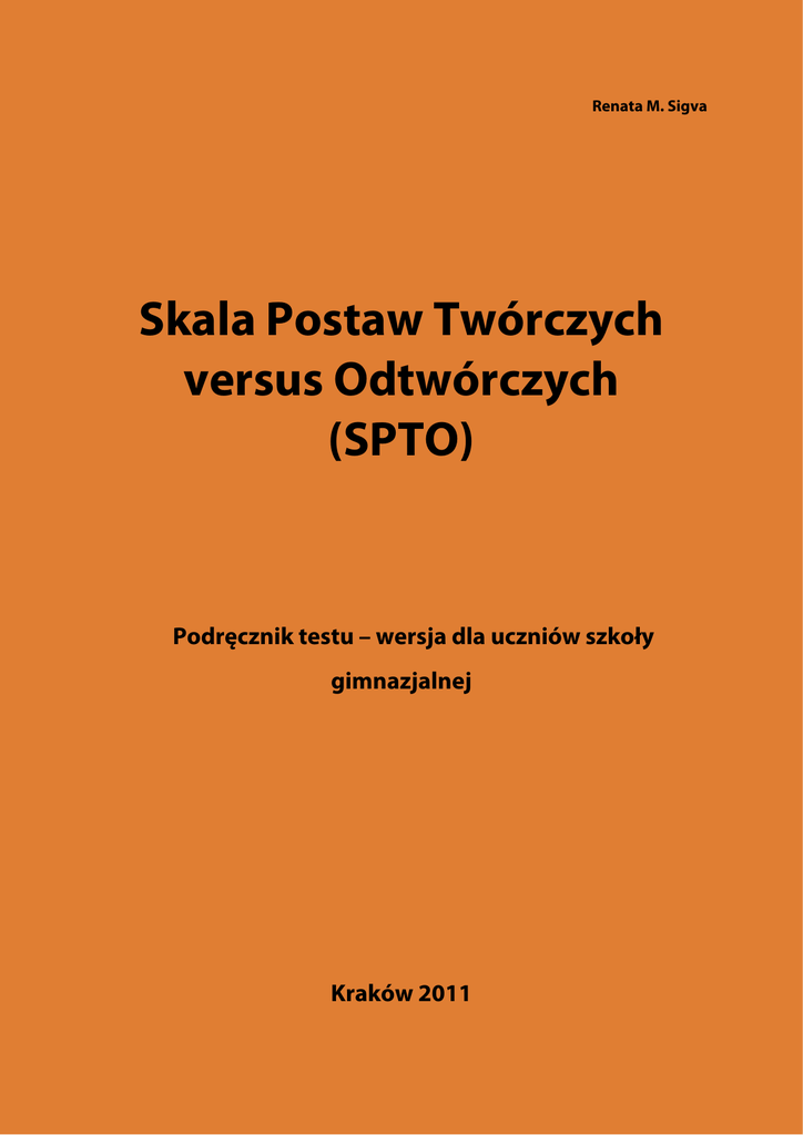 Renata M. Sigva Skala Postaw Twórczych versus Odtwórczych (SPTO) Podręcznik testu – wersja dla uczniów szkoły gimnazjalnej Kraków 2011 1 Wydawnictwo: © Ministerstwo Edukacji Narodowej, Kraków 2011 Wszelkie prawa zastrzeżone, kopiowanie, przedruk i rozpowszechnianie całości lub fragmentów bez zgody wydawcy zabronione. Podręcznik opracowany został w ramach projektu: „Opracowanie narzędzi diagnostycznych i materiałów metodycznych wspomagających proces rozpoznawania predyspozycji i zainteresowań zawodowych uczniów” realizowanego przez Krakowską Akademię im. Andrzeja Frycza Modrzewskiego 2 Spis treści 1. Wprowadzenie ................................................................................................................................................................................. 4 1.1. Podstawy teoretyczne narzędzia do badania postaw twórczych vs. odtwórczych młodzieży gimnazjalnej ..........................................................................................................................................................4 1.2. Etapy konstrukcji kwestionariusza skal postaw twórczych vs. odtwórczych..........................12 2. Opis i stosowanie narzędzia badawczego...................................................................................................................14 2.1. Opis narzędzia i procedura badania...................................................................................................................14 2.2. Analiza ilościowa .............................................................................................................................................................20 2.3. Analiza jakościowa .........................................................................................................................................................21 3. Psychometryczne właściwości narzędzia.....................................................................................................................24 3.1. Opis próby normalizacyjnej.....................................................................................................................................24 3.2. Rzetelność kwestionariusza .....................................................................................................................................25 3.3. Charakterystyka poszczególnych pozycji kwestionariusza – moc dyskryminacyjna pozycji..............................................................................................................................................................................................26 3.4. Trafność narzędzia..........................................................................................................................................................28 4. Normalizacja ....................................................................................................................................................................................30 Bibliografia..............................................................................................................................................................................................32 Spis tabel .................................................................................................................................................................................................33 Spis rysunków ......................................................................................................................................................................................34 Aneks 1. Skala Postaw Twórczych i Odtwórczych .......................................................................................................35 Aneks 2. Klucz do narzędzia........................................................................................................................................................42 3 1. Wprowadzenie 1.1. Podstawy teoretyczne narzędzia do badania postaw twórczych vs. odtwórczych młodzieży gimnazjalnej Nowe zadania stojące przed człowiekiem XXI wieku, spowodowały konieczność dokonania w programach nauczania, jak też w obrębie zakładanych w procesie edukacji celów istotnych zmian. Potrzebne okazało się ukształtowanie odpowiedniego człowieka, elastycznego, dysponującego bogatą wyobraźnią i zdolnością do ekspresji twórczej, cechującego się nowatorstwem i oryginalnością myślenia. Poglądy na temat twórczości biorą początek w źródłach religijnych i filozoficznych. Pierwsze znaczenie słowa twórczość odnosiło się do działalności Boga i było synonimem słowa Bóg czyli stwórca. Sokrates ujmował twórczość jako przejaw boskiej siły Demiurga, Platon jako odkrywanie przez artystę odwiecznych, ponadczasowych idei, Arystoteles uważał ją za tworzenie nowych przedmiotów na podobieństwo natury, neoplatonicy i św. Augustyn nadali jej wysoką rangę naśladownictwa Boga1. Pojęcie ,,twórczość” uległo znacznej ewolucji, poszerzając swój zakres i treść, stało się przy tym dość niejasne i wieloznaczne. Rozszerzenie zakresu znaczeniowego twórczości spowodowało ukształtowanie się idei pankreacjonizmu, wskazującej, iż twórczość stanowi właściwość każdego człowieka oraz może być zauważalna na każdym polu jego funkcjonowania, a więc w sztuce, nauce czy technice2. Wydaje się, iż to psychologia humanistyczna zapoczątkowała takie rozumienie twórczości. Przedstawiciele tego kierunku (E. Fromm, C. Rogers, A. Maslow) traktowali twórczość jako wartość nadającą życiu człowieka sens i jako drogę prowadzącą do zdrowia psychicznego3. Według nich twórczość jest głęboko zakorzeniona w naturze człowieka i przysługuje wszystkim ludziom bez względu na rodzaj ich działalności. Definiując twórczość autorzy najczęściej wskazują na jej czteroaspektowy paradygmat 