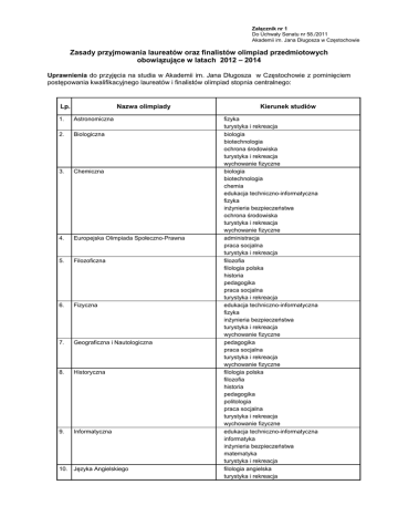 Załącznik nr 1 Do Uchwały Senatu nr 58./2011 Akademii im. Jana Długosza w Częstochowie Zasady przyjmowania laureatów oraz finalistów olimpiad przedmiotowych obowiązujące w latach 2012 – 2014 Uprawnienia do przyjęcia na studia w Akademii im. Jana Długosza w Częstochowie z pominięciem postępowania kwalifikacyjnego laureatów i finalistów olimpiad stopnia centralnego: Lp. Nazwa olimpiady 1. Astronomiczna 2. Biologiczna 3. Chemiczna 4. Europejska Olimpiada Społeczno-Prawna 5. Filozoficzna 6. Fizyczna 7. Geograficzna i Nautologiczna 8. Historyczna 9. Informatyczna 10. Języka Angielskiego Kierunek studiów fizyka turystyka i rekreacja biologia biotechnologia ochrona środowiska turystyka i rekreacja wychowanie fizyczne biologia biotechnologia chemia edukacja techniczno-informatyczna fizyka inŜynieria bezpieczeństwa ochrona środowiska turystyka i rekreacja wychowanie fizyczne administracja praca socjalna turystyka i rekreacja filozofia filologia polska historia pedagogika praca socjalna turystyka i rekreacja edukacja techniczno-informatyczna fizyka inŜynieria bezpieczeństwa turystyka i rekreacja wychowanie fizyczne pedagogika praca socjalna turystyka i rekreacja wychowanie fizyczne filologia polska filozofia historia pedagogika politologia praca socjalna turystyka i rekreacja wychowanie fizyczne edukacja techniczno-informatyczna informatyka inŜynieria bezpieczeństwa matematyka turystyka i rekreacja filologia angielska turystyka i rekreacja 11. Języka Łacińskiego 12. Języka Niemieckiego 13. Literatury i Języka Polskiego 14. „Losy Polaków na Wschodzie” 15. Matematyczna 16. Przedsiębiorczość 17. Wiedzy Ekologicznej 18. Wiedzy Ekonomicznej 19. Wiedzy Technicznej 20. Wiedzy o Polsce i Świecie Współczesnych 21. Wiedzy o Prawach Człowieka 22. Wiedza o Prawie 23. Wiedzy o Unii Europejskiej filologia polska historia turystyka i rekreacja filologia germańska turystyka i rekreacja filologia polska filozofia pedagogika praca socjalna turystyka i rekreacja historia turystyka i rekreacja edukacja techniczno-informatyczna fizyka informatyka inŜynieria bezpieczeństwa matematyka turystyka i rekreacja zarządzanie turystyka i rekreacja ochrona środowiska pedagogika praca socjalna turystyka i rekreacja wychowanie fizyczne pedagogika praca socjalna turystyka i rekreacja zarządzanie edukacja techniczno –informatyczna inŜynieria bezpieczeństwa turystyka i rekreacja historia pedagogika politologia praca socjalna turystyka i rekreacja wychowanie fizyczne administracja historia pedagogika politologia praca socjalna turystyka i rekreacja administracja turystyka i rekreacja administracja historia pedagogika politologia praca socjalna turystyka i rekreacja zarządzanie Ogólna liczba uprawnionych do przyjęcia na studia w Akademii im. Jana Długosza w Częstochowie z pominięciem postępowania kwalifikacyjnego (laureatów i finalistów olimpiad stopnia centralnego) nie moŜe przekroczyć 50 %. UCHWAŁA NR 58/2011 Senatu Akademii im Jana Długosza w Częstochowie z dnia 25 maja 2011 r. w sprawie „Zasad przyjmowania laureatów oraz finalistów olimpiad przedmiotowych obowiązujących w latach 2012-2014”. Na podstawie art. 62 ust 1pkt.2 i art. 169 ust. 6 ustawy z dnia 27 lipca 2005 r. Prawo o szkolnictwie wyŜszym (Dz.U. Nr 164, poz. 1365 z późn. zm.) oraz §22 ust 4 pkt 3 Statutu AJD w Częstochowie, Senat Uczelni postanawia co następuje: §1 Senat Akademii im. Jana Długosza w Częstochowie na posiedzeniu w dniu 25 maja 2011 r. podjął Uchwałę w sprawie „Zasad przyjmowania laureatów oraz finalistów olimpiad przedmiotowych obowiązujących w latach 2012-2014” stanowiących załącznik nr 1 do niniejszej uchwały. §2 Uchwała wchodzi w Ŝycie z dniem podjęcia