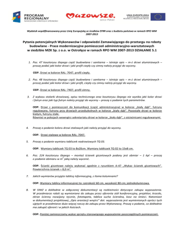 Wydatek współfinansowany przez Unię Europejską ze środków EFRR oraz z budżetu państwa w ramach RPO WM 2007-2013 Pytania potencjalnych Wykonawców i odpowiedzi Zamawiającego do przetargu na roboty budowlane - Prace modernizacyjne pomieszczeń administracyjno-warsztatowych w siedzibie MZK Sp. z o.o. w Ostrołęce w ramach RPO WM 2007-2013 DZIAŁANIE 5.1 1. Poz. 47 kosztorysu ślepego część budowlana i sanitarna – istnieje opis – m-ż drzwi aluminiowych – proszę podać jaki kolor drzwi i jaki profil ciepły czy zimny należy przyjąć do wyceny. ODP. Drzwi w kolorze RAL: 7047, profil ciepły. 2. Poz. 48 kosztorysu ślepego część budowlana i sanitarna – istnieje opis – m-ż drzwi aluminiowych – proszę podać jaki kolor drzwi i jaki profil, ciepły czy zimny należy przyjąć do wyceny. ODP. Drzwi w kolorze RAL: 7407, profil zimny. 3. Z wykazu stolarki drzwiowej, opisu technicznego oraz kosztorysu ślepego nie wynika jaki kolor drzwi i futryn oraz jaki typ futryn należy przyjąć do wyceny – proszę o podanie tych parametrów. ODP. Drzwi z pomieszczeń do komunikacji (część administracyjna) w kolorze „biały dąb”, futryny regulowane, futryny przy drzwiach przedszkolnych w kolorze „biały dąb”. Pozostałe drzwi w kolorze białym, futryny stałe. Również w pokojach wewnątrz sekretariatu drzwi w kolorze „biały dąb”, z ościeżnicami regulowanymi. 4. Proszę o podanie koloru drzwi stalowych jaki należy przyjąć do wyceny. ODP. Drzwi stalowe w kolorze RAL: 7047. 5. Proszę o podanie wymiaru tabliczek nadrzwiowych TQ 03. ODP. Wymiary tabliczek TQ 03 to 8x20cm. Wymiary tabliczek TQ 02 to 15x8 cm. 6. Poz. 224 kosztorysu ślepego – montaż ścianek giszetowych podany jest obmiar – 1 kpl – proszę 2 o podanie obmiaru w m jaką należy wycenić. ODP. Ścianki giszetowe należy wykonać zgodnie z rysunkiem A-47 „Wykaz ścianek giszetowych”. 2 Powierzchnia ścianek = 8,0 m . 7. Jakich wymiarów przyjęto tablicę informacyjną, z iloma kolumnami? ODP. Wymiary tablicy informacyjnej to: szerokość 60 cm, wysokość 80 cm; jednokolumnowa. 8. W SIWZ a dokładnie w załączonej dokumentacji są rozbieżności dotyczące zakupu wyposażenia. W przedmiarze robót są wymienione do zakupu przez oferenta stół konferencyjny, projektor, krzesło, ekran ścienny rozwijany ręcznie, fototapeta, tablica sucho ścieralna, kosz na śmieci. Natomiast w dokumentacji projektowej „Opis aranżacji wnętrz” dot. wyposażenia jest wymienionych oprócz tych ujętych w przedmiarze dużo więcej rzeczy do zakupu przez Wykonawcę. Proszę o podanie, co dokładnie ma zakupić oferent i w jakich ilościach. ODP. Poniżej zamieszczamy wykaz sprzętu stanowiącego wyposażenie poszczególnych pomieszczeń. Wykaz sprzętu stanowiącego wyposażenie poszczególnych pomieszczeń SPRZĘT EWENTUALNY OPIS ILOŚĆ SALA WYKŁADOWA Stół konferencyjny np. SIMPLE 120x60 21 szt. Krzesła np. SAMBA NET chrome 39 szt. Projektor np. NEC MX230 Sonako 1 szt. Ekran ścienny rozwijany np. 240x181,3cm Sonako 1 szt. Fototapeta Wymiary 381x320cm 1 szt. Tablica sucho ścieralna Wymiary 240x120cm 1 szt. Kosz na śmieci --2 szt. SZATNIA (nr 1-3) Szafka ubraniowa dwusegmentowa 1800x810x500 15 szt. Ławki Wymiary 160x44cm 2 szt. POKÓJ SOCJALNY (nr 1-3A) Stół Wymiary 80x80cm 2 szt. Krzesła --5 szt. Kosz na śmieci --1 szt. Umywalka Istniejąca, zmiana lokalizacji/materiał z odzysku Zlewozmywak Istniejący Szafka z przegródkami na jedzenie pracowników Istniejący Czajnik elektryczny --1 szt. Kuchenka mikrofalowa --1 szt. Dozownik na mydło --1 szt. Uchwyt na ręczniki papierowe --1 szt. NATRYSKI (nr 1-6) Podesty --Wieszak na ręczniki --2 szt. Półka na mydło --2 szt. Kosz na śmieci --1 szt. UMYWALNIA (nr 1-5) Podest --Wieszak na ręczniki --1 szt. Dozownik na mydło --1 szt. Kosz na śmieci --1 szt. Uchwyt na ręczniki papierowe --1 szt. WC Uchwyt na papier --1 szt. Kosz na śmieci --1 szt. Szczotka do WC --1 szt. PRZEDSIONKI WC I ŁAZIENEK Wieszak na ręczniki --1 szt. Dozownik na mydło --1 szt. Kosz na śmieci --1 szt. Suszarka do rąk --1 szt. POKÓJ KIEROWCÓW Szafki na jedzenie własne pracowników 60 sekcji 1 szt. Stoły i krzesła Istniejące Kosz na śmieci Istniejący Umywalka Istniejący Zlewozmywak Istniejący Czajnik elektryczny Istniejący Kuchenka mikrofalowa Istniejąca Dozownik na mydło 1 szt. Uchwyt na ręczniki papierowe 1 szt.