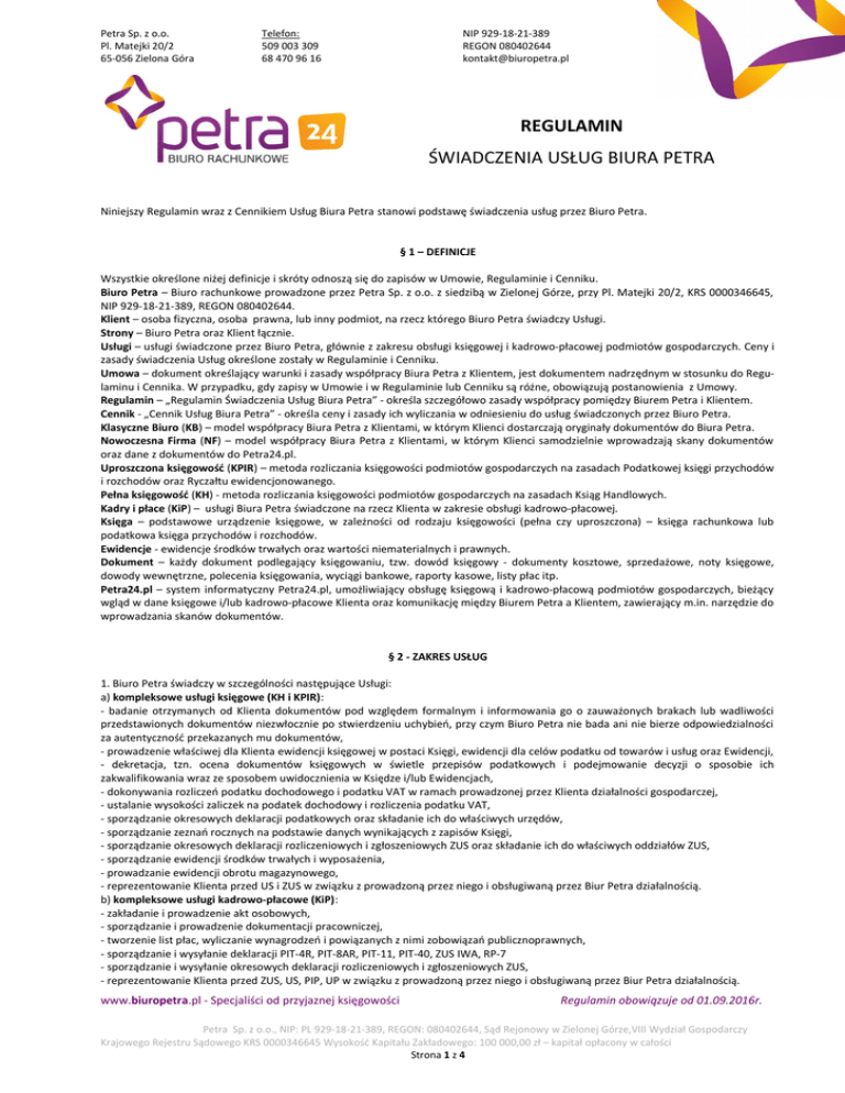 Petra Sp. z o.o. Pl. Matejki 20/2 65-056 Zielona Góra Telefon: 509 003 309 68 470 96 16 NIP 929-18-21-389 REGON 080402644 [email protected] REGULAMIN ŚWIADCZENIA USŁUG BIURA PETRA Niniejszy Regulamin wraz z Cennikiem Usług Biura Petra stanowi podstawę świadczenia usług przez Biuro Petra. § 1 – DEFINICJE Wszystkie określone niżej definicje i skróty odnoszą się do zapisów w Umowie, Regulaminie i Cenniku. Biuro Petra – Biuro rachunkowe prowadzone przez Petra Sp. z o.o. z siedzibą w Zielonej Górze, przy Pl. Matejki 20/2, KRS 0000346645, NIP 929-18-21-389, REGON 080402644. Klient – osoba fizyczna, osoba prawna, lub inny podmiot, na rzecz którego Biuro Petra świadczy Usługi. Strony – Biuro Petra oraz Klient łącznie. Usługi – usługi świadczone przez Biuro Petra, głównie z zakresu obsługi księgowej i kadrowo-płacowej podmiotów gospodarczych. Ceny i zasady świadczenia Usług określone zostały w Regulaminie i Cenniku. Umowa – dokument określający warunki i zasady współpracy Biura Petra z Klientem, jest dokumentem nadrzędnym w stosunku do Regulaminu i Cennika. W przypadku, gdy zapisy w Umowie i w Regulaminie lub Cenniku są różne, obowiązują postanowienia z Umowy. Regulamin – „Regulamin Świadczenia Usług Biura Petra” - określa szczegółowo zasady współpracy pomiędzy Biurem Petra i Klientem. Cennik - „Cennik Usług Biura Petra” - określa ceny i zasady ich wyliczania w odniesieniu do usług świadczonych przez Biuro Petra. Klasyczne Biuro (KB) – model współpracy Biura Petra z Klientami, w którym Klienci dostarczają oryginały dokumentów do Biura Petra. Nowoczesna Firma (NF) – model współpracy Biura Petra z Klientami, w którym Klienci samodzielnie wprowadzają skany dokumentów oraz dane z dokumentów do Petra24.pl. Uproszczona księgowość (KPIR) – metoda rozliczania księgowości podmiotów gospodarczych na zasadach Podatkowej księgi przychodów i rozchodów oraz Ryczałtu ewidencjonowanego. Pełna księgowość (KH) - metoda rozliczania księgowości podmiotów gospodarczych na zasadach Ksiąg Handlowych. Kadry i płace (KiP) – usługi Biura Petra świadczone na rzecz Klienta w zakresie obsługi kadrowo-płacowej. Księga – podstawowe urządzenie księgowe, w zależności od rodzaju księgowości (pełna czy uproszczona) – księga rachunkowa lub podatkowa księga przychodów i rozchodów. Ewidencje - ewidencje środków trwałych oraz wartości niematerialnych i prawnych. Dokument – każdy dokument podlegający księgowaniu, tzw. dowód księgowy - dokumenty kosztowe, sprzedażowe, noty księgowe, dowody wewnętrzne, polecenia księgowania, wyciągi bankowe, raporty kasowe, listy płac itp. Petra24.pl – system informatyczny Petra24.pl, umożliwiający obsługę księgową i kadrowo-płacową podmiotów gospodarczych, bieżący wgląd w dane księgowe i/lub kadrowo-płacowe Klienta oraz komunikację między Biurem Petra a Klientem, zawierający m.in. narzędzie do wprowadzania skanów dokumentów. § 2 - ZAKRES USŁUG 1. Biuro Petra świadczy w szczególności następujące Usługi: a) kompleksowe usługi księgowe (KH i KPIR): - badanie otrzymanych od Klienta dokumentów pod względem formalnym i informowania go o zauważonych brakach lub wadliwości przedstawionych dokumentów niezwłocznie po stwierdzeniu uchybień, przy czym Biuro Petra nie bada ani nie bierze odpowiedzialności za autentyczność przekazanych mu dokumentów, - prowadzenie właściwej dla Klienta ewidencji księgowej w postaci Księgi, ewidencji dla celów podatku od towarów i usług oraz Ewidencji, - dekretacja, tzn. ocena dokumentów księgowych w świetle przepisów podatkowych i podejmowanie decyzji o sposobie ich zakwalifikowania wraz ze sposobem uwidocznienia w Księdze i/lub Ewidencjach, - dokonywania rozliczeń podatku dochodowego i podatku VAT w ramach prowadzonej przez Klienta działalności gospodarczej, - ustalanie wysokości zaliczek na podatek dochodowy i rozliczenia podatku VAT, - sporządzanie okresowych deklaracji podatkowych oraz składanie ich do właściwych urzędów, - sporządzanie zeznań rocznych na podstawie danych wynikających z zapisów Księgi, - sporządzanie okresowych deklaracji rozliczeniowych i zgłoszeniowych ZUS oraz składanie ich do właściwych oddziałów ZUS, - sporządzanie ewidencji środków trwałych i wyposażenia, - prowadzanie ewidencji obrotu magazynowego, - reprezentowanie Klienta przed US i ZUS w związku z prowadzoną przez niego i obsługiwaną przez Biur Petra działalnością. b) kompleksowe usługi kadrowo-płacowe (KiP): - zakładanie i prowadzenie akt osobowych, - sporządzanie i prowadzenie dokumentacji pracowniczej, - tworzenie list płac, wyliczanie wynagrodzeń i powiązanych z nimi zobowiązań publicznoprawnych, - sporządzanie i wysyłanie deklaracji PIT-4R, PIT-8AR, PIT-11, PIT-40, ZUS IWA, RP-7 - sporządzanie i wysyłanie okresowych deklaracji rozliczeniowych i zgłoszeniowych ZUS, - reprezentowanie Klienta przed ZUS, US, PIP, UP w związku z prowadzoną przez niego i obsługiwaną przez Biur Petra działalnością. www.biuropetra.pl - Specjaliści od przyjaznej księgowości Regulamin obowiązuje od 01.09.2016r. Petra Sp. z o.o., NIP: PL 929-18-21-389, REGON: 080402644, Sąd Rejonowy w Zielonej Górze,VIII Wydział Gospodarczy Krajowego Rejestru Sądowego KRS 0000346645 Wysokość Kapitału Zakładowego: 100 000,00 zł – kapitał opłacony w całości Strona 1 z 4 Petra Sp. z o.o. Pl. Matejki 20/2 65-056 Zielona Góra Telefon: 509 003 309 68 470 96 16 NIP 929-18-21-389 REGON 080402644 [email protected] c) usługi uzupełniające: - sporządzanie i wysyłanie deklaracji PFRON, - sporządzanie korekt deklaracji, - sporządzanie sprawozdań finansowych, - sporządzanie sprawozdań statystycznych dla GUS, - opracowanie polityki rachunkowości, - opracowanie zakładowego planu kont, - wsparcie Klienta w kontaktach z innymi podmiotami, w tym przy aktualizacji danych 