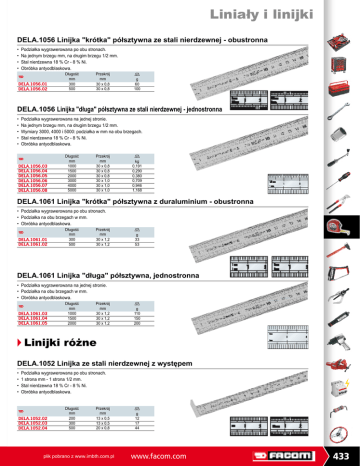 Liniały i linijki DELA.1056 Linijka "krótka" półsztywna ze stali nierdzewnej - obustronna • • • • Podziałka wygrawerowana po obu stronach. Na jednym brzegu mm, na drugim brzegu 1/2 mm. Stal nierdzewna 18 % Cr - 8 % Ni. Obróbka antyodblaskowa. F DELA.1056.01 DELA.1056.02 Długość mm 300 500 Przekrój mm 30 x 0,8 30 x 0,8 D g 60 100 DELA.1056 Linijka "długa" półsztywna ze stali nierdzewnej - jednostronna • • • • • Podziałka wygrawerowana na jednej stronie. Na jednym brzegu mm, na drugim brzegu 1/2 mm. Wymiary 3000, 4000 i 5000: podziałka w mm na obu brzegach. Stal nierdzewna 18 % Cr - 8 % Ni. Obróbka antyodblaskowa. F DELA.1056.03 DELA.1056.04 DELA.1056.05 DELA.1056.06 DELA.1056.07 DELA.1056.08 Długość mm 1000 1500 2000 3000 4000 5000 Przekrój mm 30 x 0,8 30 x 0,8 30 x 0,8 30 x 1,0 30 x 1,0 30 x 1,0 D kg 0,191 0,290 0,380 0,709 0,946 1,168 DELA.1061 Linijka "krótka" półsztywna z duraluminium - obustronna • Podziałka wygrawerowana po obu stronach. • Podziałka na obu brzegach w mm. • Obróbka antyodblaskowa. F DELA.1061.01 DELA.1061.02 Długość mm 300 500 Przekrój mm 30 x 1,2 30 x 1,2 D g 33 53 DELA.1061 Linijka "długa" półsztywna, jednostronna • Podziałka wygrawerowana na jednej stronie. • Podziałka na obu brzegach w mm. • Obróbka antyodblaskowa. F DELA.1061.03 DELA.1061.04 DELA.1061.05 Długość mm 1000 1500 2000 Przekrój mm 30 x 1,2 30 x 1,2 30 x 1,2 D g 110 150 200 u Linijki różne DELA.1052 Linijka ze stali nierdzewnej z występem • • • • Podziałka wygrawerowana po obu stronach. 1 strona mm - 1 strona 1/2 mm. Stal nierdzewna 18 % Cr - 8 % Ni. Obróbka antyodblaskowa. F DELA.1052.02 DELA.1052.03 DELA.1052.04 Długość mm 200 300 500 Przekrój mm 13 x 0,5 13 x 0,5 20 x 0,8 plik pobrano z www.imbth.com.pl D g 12 17 44 www.facom.com 433