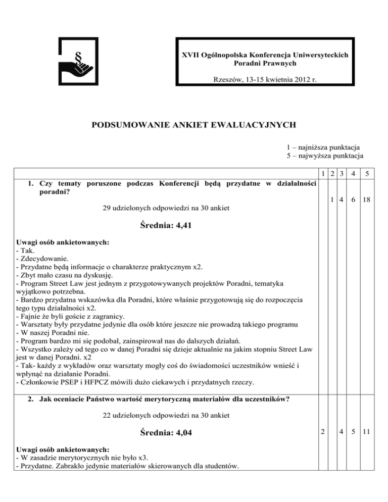 XVII Ogólnopolska Konferencja Uniwersyteckich Poradni Prawnych Rzeszów, 13-15 kwietnia 2012 r. PODSUMOWANIE ANKIET EWALUACYJNYCH 1 – najniższa punktacja 5 – najwyższa punktacja 1 2 3 4 5 1. Czy tematy poruszone podczas Konferencji będą przydatne w działalności poradni? 1 4 6 18 4 5 11 29 udzielonych odpowiedzi na 30 ankiet Średnia: 4,41 Uwagi osób ankietowanych: - Tak. - Zdecydowanie. - Przydatne będą informacje o charakterze praktycznym x2. - Zbyt mało czasu na dyskusję. - Program Street Law jest jednym z przygotowywanych projektów Poradni, tematyka wyjątkowo potrzebna. - Bardzo przydatna wskazówka dla Poradni, które właśnie przygotowują się do rozpoczęcia tego typu działalności x2. - Fajnie że byli goście z zagranicy. - Warsztaty były przydatne jedynie dla osób które jeszcze nie prowadzą takiego programu - W naszej Poradni nie. - Program bardzo mi się podobał, zainspirował nas do dalszych działań. - Wszystko zależy od tego co w danej Poradni się dzieje aktualnie na jakim stopniu Street Law jest w danej Poradni. x2 - Tak- każdy z wykładów oraz warsztaty mogły coś do świadomości uczestników wnieść i wpłynąć na działanie Poradni. - Członkowie PSEP i HFPCZ mówili dużo ciekawych i przydatnych rzeczy. 2. Jak oceniacie Państwo wartość merytoryczną materiałów dla uczestników? 22 udzielonych odpowiedzi na 30 ankiet Średnia: 4,04 Uwagi osób ankietowanych: - W zasadzie merytorycznych nie było x3. - Przydatne. Zabrakło jedynie materiałów skierowanych dla studentów. 2 - Brak notatników do pisania, ubogie i nieprzydatne. - Różnicowanie zawartości materiałów dla uczestników. - Trudno oceniać. - Przydatne. Warto było takie zorganizować materiały. 3. Jak oceniacie Państwo uroczystość otwarcia Konferencji ? 28 udzielonych odpowiedzi na 30 ankiet 1 7 11 9 Średnia: 4,0 Uwagi osób ankietowanych: - Miła. - Niestety nie byłam/em obecna x2. - Brak zaplanowanych wykładów x6. - Bardzo elegancka oprawa, piękna sala w Ratuszu, powitanie przez osobistości podniosło rangę Konferencji. - Zbyt dużo zmian w programie. - Tak jak zawsze. - Bardzo spodobał mi się pomysł spotkania wszystkich uczestników konferencji. - Na dość wysokim poziomie, bardzo prestiżowe miejsce. Rejestracja uczestników powinna odbyć się w hotelu. - Brak zastępstwa nieobecnych gości x2. - Pozytywnie, brakowało jednak wystąpienie prof. M. Płatek. - Miejsce bardzo ładne. 4. Jak oceniacie Państwo warsztaty dla nauczycieli klinicznych pt. „Dobór tematów zajęć i metod nauczania oraz sposób organizacji pracy podczas zajęć Street Lawdoświadczenia PSEP”, Dr Grzegorz Borek (Polskie Stowarzyszenie Edukacji Prawnej) 1 1 2 1 9 14 udzielonych odpowiedzi na 15 ankiet Średnia : 4,14 Uwagi osób ankietowanych: - Ciekawe przedstawienie aktywnych metod nauczania, szkoda że nie udało się przeprowadzić do końca części praktycznej. - Brak czasu na dyskusję. - Słabe zajęcia, nie wnoszące wiedzy dla uczestników. - Formuła była przemyślana i ciekawa. - Praktycznie i przystępnie przedstawione zostały zagadnienia nt. metod prowadzenia zajęć. - Była to prezentacja czym jest Street Law, a nie jak prowadzić program w Klinice. 5. Jak oceniacie Państwo warsztaty dla studentów pt. „Presentation skills in teaching Street Law”, Pani JUDr Lucia Madlenakova (Klinika Prawa Uniwersytetu w Ołomuńcu) 12 udzielonych odpowiedzi na 15 ankiet Średnia: 5,0 Uwagi osób ankietowanych: - Fajne. 12 - Warsztaty bardzo ciekawe i przydatne, ale mogły być zorganizowane bardziej pod kątem Street Law. - Ciekawy pomysł zastosowania kamery. - Bardzo przydatne, wykorzystam metodologię w moich warsztatach w przyszłym roku. - Warsztaty uświadomiły nam jak ważna jest prezentacja własnej osoby. - Ciekawe warsztaty, angażujące uczestników. Aktywne uczestnictwo, ciekawe metody. Było trochę za mało o Street Law. Dobrze przygotowane. - Bardzo fajny pomysł na nagrywanie. Skrępowanie językiem angielskim. 6. Jak Państwo oceniają stronę organizacyjną Konferencji? 30 udzielonych odpowiedzi na 30 ankiet 4 4 22 1 6 23 Średnia: 4,6 Uwagi osób ankietowanych: - Super. - Organizacja na najwyższym poziomie. Gratulacje ! - Dobrze przygotowana. Nie udało się uniknąć niewielkich niedociągnięć, jednak w żaden sposób nie rzutowały na odbiór. - Bardzo dobra, wielkie uznania i podziękowania x4 - Polskie wystąpienia nie były tłumaczone gościom z zagranicy. Widoczne były dobre chęci, ale wśród organizatorów brakowało lidera. - Świetna organizacja. Bardzo miła atmosfera, organizatorzy byli zawsze gotowi do pomocy. Gratulacje dziewczyny! - Widoczne uchybienia w organizacji. - Było kilka niedociągnięć, szczególnie w zakresie posiłków, ale doceniam starania organizatorów. - Znakomity kontakt z organizatorami, można było na bieżąco wyjaśniać wszelkie wątpliwości. - Brak decyzyjności organizatorów. - Bardzo duże zaangażowanie studentów – organizatorów. - Organizatorzy bardzo się starali, ich zaangażowanie pozwoliło na zniwelowanie mankamentów. - Organizacja rewelacyjna! - Organizacja była na dobrym poziomie. Brakowało jedynie informacji do punktualnego rozpoczynania zajęć. - Chciał(a)bym podziękować Joannie i Klaudii. To bardzo sympatyczne osoby. - Brak moderatorów dyskusji. 7. Jak oceniacie Państwo organizację czasu wolnego, w tym udział w imprezach integracyjnych? 29 udzielonych odpowiedzi na 30 ankiet Średnia: 4,89 Uwagi osób ankietowanych: - Bardzo dobra. - Super, bardzo ciekawa Trasa Podziemna. - Maksymalnie zadbano o czas wolny. - Nie każdy lubi kluby. - Super. - Świetna atmosfera. - Bardzo pozytywnie. - Pierwsza impreza bardzo fajna, druga gorsza generalnie było OK. - Bardzo zaciekawiła mnie Trasa Podziemna. Imprezy były w porządku, a jedzenie było pyszne! - Przerwy w zajęciach zostały dobrze zagospodarowane. - Bardzo dziękuję Joannie i Klaudii! - Piątkowa impreza bardzo fajna