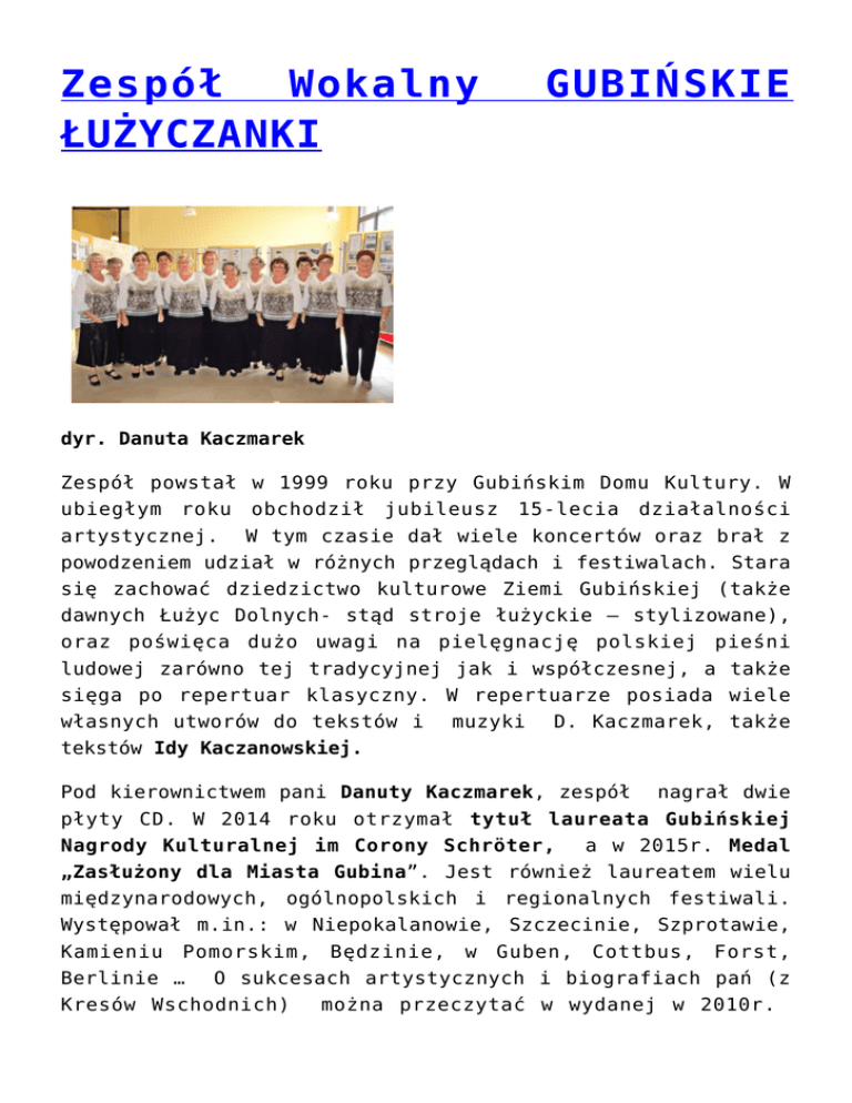 Zespół Wokalny ŁUŻYCZANKI GUBIŃSKIE dyr. Danuta Kaczmarek Zespół powstał w 1999 roku przy Gubińskim Domu Kultury. W ubiegłym roku obchodził jubileusz 15-lecia działalności artystycznej. W tym czasie dał wiele koncertów oraz brał z powodzeniem udział w różnych przeglądach i festiwalach. Stara się zachować dziedzictwo kulturowe Ziemi Gubińskiej (także dawnych Łużyc Dolnych- stąd stroje łużyckie – stylizowane), oraz poświęca dużo uwagi na pielęgnację polskiej pieśni ludowej zarówno tej tradycyjnej jak i współczesnej, a także sięga po repertuar klasyczny. W repertuarze posiada wiele własnych utworów do tekstów i muzyki D. Kaczmarek, także tekstów Idy Kaczanowskiej. Pod kierownictwem pani Danuty Kaczmarek, zespół nagrał dwie płyty CD. W 2014 roku otrzymał tytuł laureata Gubińskiej Nagrody Kulturalnej im Corony Schröter, a w 2015r. Medal „Zasłużony dla Miasta Gubina”. Jest również laureatem wielu międzynarodowych, ogólnopolskich i regionalnych festiwali. Występował m.in.: w Niepokalanowie, Szczecinie, Szprotawie, Kamieniu Pomorskim, Będzinie, w Guben, Cottbus, Forst, Berlinie … O sukcesach artystycznych i biografiach pań (z Kresów Wschodnich) można przeczytać w wydanej w 2010r. książce pt. „Tylko tu – Gubińskie Łużyczanki w 10-lecie działalności artystycznej”, którą napisała kierownik zespołu Danuta Kaczmarek. W skład zespołu śpiewaczego wchodzą panie (14 osób), wszystkie są emerytkami, których pasją jest śpiew. kategoria: zespoły wokalne Repertuar konkursowy: Gubińskie tango – Danuta Kaczmarek Kozak – Stanisław Moniuszko Dona nobis pacem – kanon Będę Jasieńkową Gospodynią – współczesna melodia ludowa, oprac. Danuta Kaczmarek Kolorowy świat – Danuta Kaczmarek