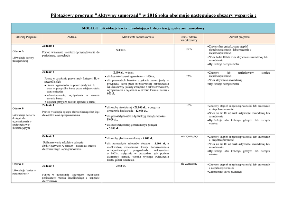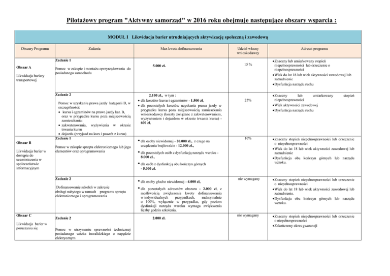Pilotażowy program "Aktywny samorząd" w 2016 roku obejmuje następujące obszary wsparcia : MODUŁ I Likwidacja barier utrudniających aktywizację społeczną i zawodową Obszary Programu Zadania Max kwota dofinansowania Udział własny wnioskodawcy Zadanie 1 Obszar A Likwidacja bariery transportowej Pomoc w zakupie i montażu oprzyrządowania do posiadanego samochodu Zadanie 2 Pomoc w uzyskaniu prawa jazdy kategorii B, w szczególności: kursu i egzaminów na prawo jazdy kat. B, oraz w przypadku kursu poza miejscowością zamieszkania: zakwaterowania, wyżywienia w okresie trwania kursu dojazdu (przyjazd na kurs i powrót z kursu) Zadanie 1 Obszar B Likwidacja barier w dostępie do uczestniczenia w społeczeństwie informacyjnym Pomoc w zakupie sprzętu elektronicznego lub jego elementów oraz oprogramowania • dla osoby niewidomej - 20.000 zł., z czego na 25% Znaczny lub umiarkowany stopień niepełnosprawności lub orzeczenie o niepełnosprawności Wiek do lat 18 lub wiek aktywności zawodowej lub zatrudnienie Dysfunkcja narządu ruchu Znaczny lub umiarkowany niepełnosprawności Wiek aktywności zawodowej Dysfunkcja narządu ruchu stopień 10% Znaczny stopień niepełnosprawności lub orzeczenie o niepełnosprawności Wiek do lat 18 lub wiek aktywności zawodowej lub zatrudnienie Dysfunkcja obu kończyn górnych lub narządu wzroku. nie wymagany Znaczny stopień niepełnosprawności lub orzeczenie o niepełnosprawności Wiek do lat 18 lub wiek aktywności zawodowej lub zatrudnienie. Dysfunkcja obu kończyn górnych lub narządu wzroku. nie wymagany Znaczny stopień niepełnosprawności lub orzeczenie o niepełnosprawności Zakończony okres gwarancji urządzenia brajlowskie - 12.000 zł., • dla pozostałych osób z dysfunkcją narządu wzroku • dla osób z dysfunkcją obu kończyn górnych - 5.000 zł. Dofinansowanie szkoleń w zakresie obsługi nabytego w ramach programu sprzętu elektronicznego i oprogramowania Likwidacja barier w poruszaniu się 2.100 zł., w tym : dla kosztów kursu i egzaminów - 1.500 zł, dla pozostałych kosztów uzyskania prawa jazdy w przypadku kursu poza miejscowością zamieszkania wnioskodawcy (koszty związane z zakwaterowaniem, wyżywieniem i dojazdem w okresie trwania kursu) 600 zł, 8.000 zł., Zadanie 2 Obszar C 15 % 5.000 zł. Adresat programu Zadanie 2 Pomoc w utrzymaniu sprawności technicznej posiadanego wózka inwalidzkiego o napędzie elektrycznym • dla osoby głucho niewidomej - 4.000 zł, • dla pozostałych adresatów obszaru - 2.000 zł, z możliwością zwiększenia kwoty dofinansowania w indywidualnych przypadkach, maksymalnie o 100%, wyłącznie w przypadku, gdy poziom dysfunkcji narządu wzroku wymaga zwiększenia liczby godzin szkolenia. 2.000 zł. Stopień niepełnosprawności Po amputacji: Zadanie 3 Pomoc w zakupie protezy kończyny, w której zastosowano nowoczesne rozwiązania techniczne, tj. protezy co najmniej na III poziomie jakości • w zakresie ręki – 9.000 zł, • przedramienia – 20.000 zł, • ramienia i wyłuszczeniu w stawie barkowym – 10% Wiek aktywności zawodowej lub zatrudnienie Potwierdzona opinią eksperta PFRON stabilność procesu chorobowego 26.000 zł, • na poziomie podudzia – 14.000 zł, • na wysokości uda (także przez staw kolanowy) – Potwierdzona opinią eksperta PFRON rokowania uzyskania zdolności do pracy w wyniku wsparcia udzielonego w programie. 20.000 zł, • uda i wyłuszczeniu w stawie biodrowym – 25.000 zł, z możliwością zwiększenia kwoty dofinansowania w wyjątkowych przypadkach i wyłącznie wtedy, gdy celowość zwiększenia jakości protezy do poziomu IV (dla zdolności do pracy wnioskodawcy), zostanie zarekomendowana przez eksperta PFRON Zadanie 4 do 30% kwot z Zadania 3 Stopień niepełnosprawności 10% Pomoc w utrzymaniu sprawności technicznej posiadanej protezy kończyny, w której zastosowano nowoczesne rozwiązania techniczne, (co najmniej na III poziomie jakości) Wiek aktywności zawodowej lub zatrudnienie Potwierdzona opinią eksperta PFRON stabilność procesu chorobowego Potwierdzona opinią eksperta PFRON rokowania uzyskania zdolności do pracy w wyniku wsparcia udzielonego w programie. Pomoc może być udzielana po zakończeniu okresu gwarancji na wnioskowaną część. W zad 3 i 4 istnieje możliwość refundacji kosztów dojazdu na spotkanie z ekspertem PFRON w zależności od poniesionych kosztów nie więcej niż 200 zł. Obszar D Pomoc w utrzymaniu aktywności zawodowej poprzez zapewnienie opieki dla osoby zależnej 200 zł miesięcznie, jednak nie więcej niż 2.400 zł w ciągu roku - tytułem kosztów opieki nad każdą (jedną) osobą zależną. 15% Znaczny lub umiarkowany stopień niepełnosprawności – każdy rodzaj dysfunkcji Aktywność zawodowa Pełnienie roli opiekuna prawnego dziecka. Treść programu została opublikowana na witrynie internetowej PFRON: www.pfron.org.pl Zasady uczestnictwa w programie oraz wnioski są dostępne na stronie internetowej www.pcprwolomin.pl. Szczegółowe informacje można uzyskać w Biurze Obsługi Powiatowego Centrum Pomocy Rodzinie w Wołominie, przy ul. Legionów 78 lub pod nr tel. 22 776-44-95/96 MODUŁ II Moduł II Zadania Dofinansowanie 1. lub refundacja kosztów uzyskania 2. wykształcenia na poziomie wyższym 3. Opłata za naukę (czesne) Dodatek na uiszczenie opłaty za przeprowadzenie przewodu doktorskiego - w przypadku osób, które mają wszczęty przewód doktorski, a nie są uczestnikami studiów doktoranckich Dodatek na pokrycie kosztów kształcenia (nie podlega rozliczeniu) Pomoc w uzyskaniu wykształcenia na poziomie wyższym Max kwota dofinansowania Opłata za naukę (czesne) - równowartość kosztów czesnego w ramach jednej aktualnie realizowanej formy kształcenia na poziomie wyższym (na jednym kierunku) – niezależnie od daty poniesienia kosztów, przy czym dofinansowanie powyżej kwoty 3.000 zł. jest możliwe wyłącznie w przypadku, gdy wysokość przeciętnego mi