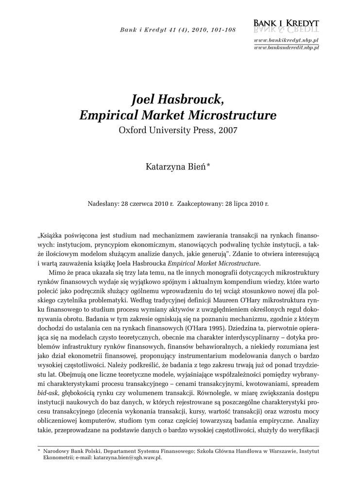 B a n k i K r e d y t 41 (4), 2010, 101-108 www.bankikredyt.nbp.pl www.bankandcredit.nbp.pl Joel Hasbrouck, Empirical Market Microstructure Oxford University Press, 2007 Katarzyna Bień Nadesłany: 28 czerwca 2010 r. Zaakceptowany: 28 lipca 2010 r. „Książka poświęcona jest studium nad mechanizmem zawierania transakcji na rynkach finansowych: instytucjom, pryncypiom ekonomicznym, stanowiących podwalinę tychże instytucji, a także ilościowym modelom służącym analizie danych, jakie generują”. Zdanie to otwiera interesującą i wartą zauważenia książkę Joela Hasbroucka Empirical Market Microstructure. Mimo że praca ukazała się trzy lata temu, na tle innych monografii dotyczących mikrostruktury rynków finansowych wydaje się wyjątkowo spójnym i aktualnym kompendium wiedzy, które warto polecić jako podręcznik służący ogólnemu wprowadzeniu do tej wciąż stosunkowo nowej dla polskiego czytelnika problematyki. Według tradycyjnej definicji Maureen O’Hary mikrostruktura rynku finansowego to studium procesu wymiany aktywów z uwzględnieniem określonych reguł dokonywania obrotu. Badania w tym zakresie ogniskują się na poznaniu mechanizmu, zgodnie z którym dochodzi do ustalania cen na rynkach finansowych (O’Hara 1995). Dziedzina ta, pierwotnie opierająca się na modelach czysto teoretycznych, obecnie ma charakter interdyscyplinarny – dotyka problemów infrastruktury rynków finansowych, finansów behawioralnych, a niekiedy rozumiana jest jako dział ekonometrii finansowej, proponujący instrumentarium modelowania danych o bardzo wysokiej częstotliwości. Należy podkreślić, że badania z tego zakresu trwają już od ponad trzydziestu lat. Obejmują one liczne teoretyczne modele, wyjaśniające współzależności pomiędzy wybranymi charakterystykami procesu transakcyjnego – cenami transakcyjnymi, kwotowaniami, spreadem bid-ask, głębokością rynku czy wolumenem transakcji. Równolegle, w miarę zwiększania dostępu instytucji naukowych do baz danych, w których rejestrowane są poszczególne charakterystyki procesu transakcyjnego (zlecenia wykonania transakcji, kursy, wartość transakcji) oraz wzrostu mocy obliczeniowej komputerów, studiom tym coraz częściej towarzyszą badania empiryczne. Analizy takie, przeprowadzane na podstawie danych o bardzo wysokiej częstotliwości, służyły do weryfikacji * Narodowy Bank Polski, Departament Systemu Finansowego; Szkoła Główna Handlowa w Warszawie, Instytut Ekonometrii; e-mail: [email protected]. 102 Recenzje postulatów i hipotez teoretycznych w odniesieniu do różnych rodzajów rynków, charakteryzujących się różnymi protokołami obrotu (trading protocol), czyli instytucjonalnymi uwarunkowaniami procesu transakcyjnego. Na rynku nie ma wielu pozycji książkowych podsumowujących i oceniających dorobek naukowy w tej dziedzinie. Studia dotyczące mikrostruktury rynku rozwijają się wyjątkowo prężnie przede wszystkim dzięki artykułom publikowanym w periodykach naukowych, a wyjątkowa aktualność i pozytywny skutek dociekań naukowych wynikają z dużej liczby artykułów dyskusyjnych i konferencji poświęconych tej tematyce. Wciąż najczęściej cytowana i aktualna jest monografia Maureen O’Hary Market Microstructure Theory z 1995 r., dokonująca przeglądu formułowanych do połowy lat 90. teoretycznych modeli opisujących scenariusz procesu transakcyjnego, a także ich kategoryzacji w zależności od przyjmowanych formalnych założeń koncepcyjnych. Przez kilka następnych lat książka ta stanowiła w zasadzie jedyne kompendium wiedzy z tego zakresu. W 2003 r. ukazała się bardzo odmienna pod względem koncepcyjnym pozycja Larry’ego Harrisa Trading and Exchanges, poświęcona problemom mikrostruktury rynków finansowych, aczkolwiek w ujęciu empirycznym. Książka ta skierowana była przede wszystkim do praktyków, ponieważ cechuje ją raczej intuicyjny i mało sformalizowany sposób prezentacji wywodu, poświęconego przede wszystkim instytucjonalnym uwarunkowaniom organizacji i funkcjonowania rynków finansowych. Spośród bardziej specjalistycznych pozycji należy wymienić pracę Richarda Lyonsa (2001), poświęconą mikrostrukturze rynku walutowego, oraz obszerną książkę Dacorogna i in. (2001). W tej ostatniej dokonano przeglądu narzędzi ilościowych wykorzystywanych w modelowaniu finansowych szeregów czasowych o bardzo wysokiej częstotliwości. W 2009 r. nakładem wydawnictwa Cambridge ukazała się monografia autorstwa Franka de Jonga i Barbary Rindi Microstructure of Financial Markets. Rozprawa ta, pomimo swej aktualności, ma jednak wyjątkowo teoretyczny charakter. Wydaje się również skierowana do bardziej zaawansowanych czytelników, głównie ze względu na niewielki nacisk położony na intuicyjną argumentację oraz stosunkowo skąpą interpretację licznie prezentowanych formuł matematycznych. W porównaniu z powyższymi pozycjami książka prof. Hasbroucka prezentuje się wyjątkowo atrakcyjnie, głównie dzięki swojemu interdyscyplinarnemu charakterowi. Autor omawia kolejne modele mikrostruktury wraz z opisem metod ich empirycznej weryfikacji, nie zaniedbując jednak spójnego intuicyjnego uzasadnienia, a także bardziej sformalizowanych uzasadnień prezentowanych kwestii. Głównie z tego powodu pozycję tę warto zarekomendować szerszemu gronu polskich czytelników. Książka składa się z piętnastu krótkich, ale treściwych rozdziałów. Rozdział pierwszy jest próbą syntetycznego wprowadzenia do tematyki mikrostruktury rynku, jej podstawowych pojęć, a także – w gruncie rzeczy ulotnych i trudnych do jednoznacznego zdefiniowania – kategorii oceny jakości rynków finansowych, jak płynność czy przejrzystość rynku. Autor formułuje tu również listę otwartych pytań, wytyczających kierunki obiecujących dalszych poszukiwań naukowych w tym zakresie. Rozdział drugi poświęcono instytucjonalnym ramom funkcjonowania rynk