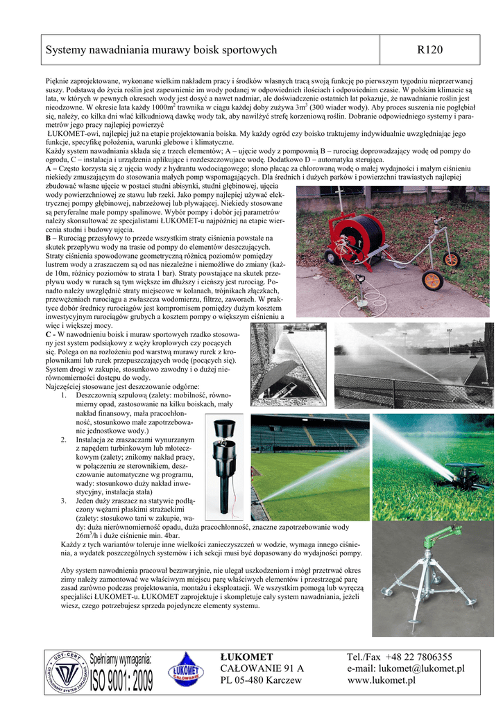 Systemy nawadniania murawy boisk sportowych R120 Pięknie zaprojektowane, wykonane wielkim nakładem pracy i środków własnych tracą swoją funkcję po pierwszym tygodniu nieprzerwanej suszy. Podstawą do życia roślin jest zapewnienie im wody podanej w odpowiednich ilościach i odpowiednim czasie. W polskim klimacie są lata, w których w pewnych okresach wody jest dosyć a nawet nadmiar, ale doświadczenie ostatnich lat pokazuje, że nawadnianie roślin jest nieodzowne. W okresie lata każdy 1000m2 trawnika w ciągu każdej doby zużywa 3m3 (300 wiader wody). Aby proces suszenia nie pogłębiał się, należy, co kilka dni wlać kilkudniową dawkę wody tak, aby nawilżyć strefę korzeniową roślin. Dobranie odpowiedniego systemy i parametrów jego pracy najlepiej powierzyć ŁUKOMET-owi, najlepiej już na etapie projektowania boiska. My każdy ogród czy boisko traktujemy indywidualnie uwzględniając jego funkcje, specyfikę położenia, warunki glebowe i klimatyczne. Każdy system nawadniania składa się z trzech elementów; A – ujęcie wody z pompownią B – rurociąg doprowadzający wodę od pompy do ogrodu, C – instalacja i urządzenia aplikujące i rozdeszczowujace wodę. Dodatkowo D – automatyka sterująca. A – Często korzysta się z ujęcia wody z hydrantu wodociągowego; słono płacąc za chlorowaną wodę o małej wydajności i małym ciśnieniu niekiedy zmuszającym do stosowania małych pomp wspomagających. Dla średnich i dużych parków i powierzchni trawiastych najlepiej zbudować własne ujęcie w postaci studni abisynki, studni głębinowej, ujęcia wody powierzchniowej ze stawu lub rzeki. Jako pompy najlepiej używać elektrycznej pompy głębinowej, nabrzeżowej lub pływającej. Niekiedy stosowane są peryferalne małe pompy spalinowe. Wybór pompy i dobór jej parametrów należy skonsultować ze specjalistami ŁUKOMET-u najpóźniej na etapie wiercenia studni i budowy ujęcia. B – Rurociąg przesyłowy to przede wszystkim straty ciśnienia powstałe na skutek przepływu wody na trasie od pompy do elementów deszczujących. Straty ciśnienia spowodowane geometryczną różnicą poziomów pomiędzy lustrem wody a zraszaczem są od nas niezależne i niemożliwe do zmiany (każde 10m, różnicy poziomów to strata 1 bar). Straty powstające na skutek przepływu wody w rurach są tym większe im dłuższy i cieńszy jest rurociąg. Ponadto należy uwzględnić straty miejscowe w kolanach, trójnikach złączkach, przewężeniach rurociągu a zwłaszcza wodomierzu, filtrze, zaworach. W praktyce dobór średnicy rurociągów jest kompromisem pomiędzy dużym kosztem inwestycyjnym rurociągów grubych a kosztem pompy o większym ciśnieniu a więc i większej mocy. C - W nawodnieniu boisk i muraw sportowych rzadko stosowany jest system podsiąkowy z węży kroplowych czy pocących się. Polega on na rozłożeniu pod warstwą murawy rurek z kroplownikami lub rurek przepuszczających wodę (pocących się). System drogi w zakupie, stosunkowo zawodny i o dużej nierównomierności dostępu do wody. Najczęściej stosowane jest deszczowanie odgórne: 1. Deszczownią szpulową (zalety: mobilność, równomierny opad, zastosowanie na kilku boiskach, mały nakład finansowy, mała pracochłonność, stosunkowo małe zapotrzebowanie jednostkowe wody.) 2. Instalacja ze zraszaczami wynurzanym z napędem turbinkowym lub młoteczkowym (zalety; znikomy nakład pracy, w połączeniu ze sterownikiem, deszczowanie automatyczne wg programu, wady: stosunkowo duży nakład inwestycyjny, instalacja stała) 3. Jeden duży zraszacz na statywie podłączony wężami płaskimi strażackimi (zalety: stosukowo tani w zakupie, wady: duża nierównomierność opadu, duża pracochłonność, znaczne zapotrzebowanie wody 26m3/h i duże ciśnienie min. 4bar. Każdy z tych wariantów toleruje inne wielkości zanieczyszczeń w wodzie, wymaga innego ciśnienia, a wydatek poszczególnych systemów i ich sekcji musi być dopasowany do wydajności pompy. Aby system nawodnienia pracował bezawaryjnie, nie ulegał uszkodzeniom i mógł przetrwać okres zimy należy zamontować we właściwym miejscu parę właściwych elementów i przestrzegać parę zasad zarówno podczas projektowania, montażu i eksploatacji. We wszystkim pomogą lub wyręczą specjaliści ŁUKOMET-u. ŁUKOMET zaprojektuje i skompletuje cały system nawadniania, jeżeli wiesz, czego potrzebujesz sprzeda pojedyncze elementy systemu. ŁUKOMET CAŁOWANIE 91 A PL 05-480 Karczew Tel./Fax +48 22 7806355 e-mail: [email protected] www.lukomet.pl