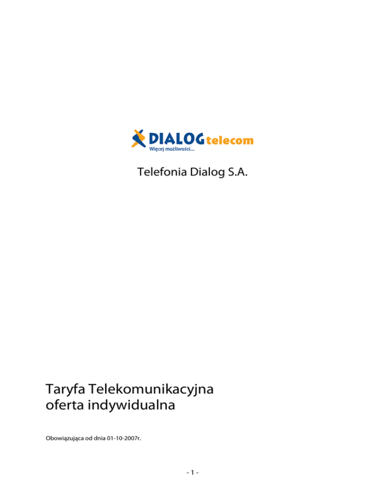 Telefonia Dialog S.A. Taryfa Telekomunikacyjna oferta indywidualna Obowiązująca od dnia 01-10-2007r. -1- Taryfa Telekomunikacyjna Spis treści SPIS TREŚCI: TARYFA DARMOWE ROZMOWY – MAX ............................................................................................................................4 1. 1.1. 1.2. 1.3. 1.4. 2. TARYFA DOMOWA .............................................................................................................................................................. 10 2.1. 2.2. 2.3. 2.4. 3. JEDNORAZOWE OPŁATY PODSTAWOWE..................................................................................................................... 10 STAŁE OPŁATY MIESIĘCZNE .............................................................................................................................................. 11 OPŁATY ZA POŁĄCZENIA TELEKOMUNIKACYJNE ...................................................................................................... 12 OPŁATY ZA USŁUGI I CZYNNOŚCI DODATKOWE........................................................................................................ 18 TARYFA ATUT ........................................................................................................................................................................ 20 3.1. 3.2. 3.3. 3.4. 4. JEDNORAZOWE OPŁATY PODSTAWOWE........................................................................................................................4 STAŁE OPŁATY MIESIĘCZNE .................................................................................................................................................4 OPŁATY ZA POŁĄCZENIA TELEKOMUNIKACYJNE .........................................................................................................5 OPŁATY ZA USŁUGI I CZYNNOŚCI DODATKOWE...........................................................................................................8 JEDNORAZOWE OPŁATY PODSTAWOWE..................................................................................................................... 20 STAŁE OPŁATY MIESIĘCZNE .............................................................................................................................................. 20 OPŁATY ZA POŁĄCZENIA TELEKOMUNIKACYJNE ...................................................................................................... 21 OPŁATY ZA USŁUGI I CZYNNOŚCI DODATKOWE........................................................................................................ 25 ZAŁĄCZNIKI ........................................................................................................................................................................... 30 4.1. OPIS USŁUG DODATKOWYCH .......................................................................................................................................... 30 4.2. BEZPŁATNE POŁĄCZENIA TELEFONICZNE.................................................................................................................... 31 4.3. OPŁATY ZA POŁĄCZENIA Z NUMERACJĄ SKRÓCONĄ.............................................................................................. 31 4.4. OPŁATY ZA POŁĄCZENIA DO SIECI TELEINFORMATYCZNYCH INNYCH OPERATORÓW, POŁACZENIA INTELIGENTNE ORAZ POŁĄCZENIA DO SIECI PRZYWOŁAWCZYCH.............................................................................. 32 4.5. OPŁATY ZA USŁUGI I CZYNNOŚCI DODATKOWE........................................................................................................ 34 4.6. WYKAZ NUMERÓW STREF TARYFOWYCH W POŁĄCZENIACH MIĘDZYNARODOWYCH W RUCHU AUTOMATYCZNYM....................................................................................................................................................................... 40 4.7. TABELA TARYFIKACJI ........................................................................................................................................................... 44 4.8. POCZTA GŁOSOWA W TELEFONII DIALOG S.A. ........................................................................................................... 46 4.9. OPŁATY ZA POŁĄCZENIA Z APARATÓW PUBLICZNYCH .......................................................................................... 48 -2- Taryfa Telekomunikacyjna Taryfa Darmowe Rozmowy – MAX Plan taryfowy Rozmowy w dobrej cenie Taryfa Darmowe rozmowy – MAX -3- Taryfa Telekomunikacyjna Taryfa Darmowe Rozmowy – MAX 1. TARYFA DARMOWE ROZMOWY – MAX Taryfa Darmowe Rozmowy MAX dostępna jest zarówno dla klientów indywidualnych i biznesowych. 1.1. JEDNORAZOWE OPŁATY PODSTAWOWE Lp. Rodzaj opłaty Cena netto Kwota VAT Cena brutto 1. Opłata za uzyskanie dostępu do sieci telekomunikacyjnej (1) 100,00 zł 22,00 zł 122,00 zł 2. Jednorazowa opłata za przejęcie uprawnień do korzystania z usługi w wyniku umowy cesji (2) 32,00 zł 7,04 zł 39,04 zł 3. Opłata za uzyskanie dostępu do sieci telekomunikacyjnej w przypadku zmiany sieci (zmiany operatora) (3) 1,00 zł 0,22 zł 1,22 zł 4. Opłata za instalację kolejnej linii abonenckiej (4) 1,00 zł 0,22 zł 1,22 zł 5. Opłata za zmianę rodzaju dostępu do sieci (5) 100,00 zł 22,00 zł 122,00 zł 6. Wybrany numer abonencki z grupy numerów łatwych do zapamiętania: Złoty numer – jednorazowa opłata za dostęp do usługi 150,00 zł 33,00 zł 183,00 zł Srebrny numer – jednorazowa opłata za dostęp do usługi 100,00 zł 22,00 zł 122,00 zł 20,00 zł 4,40 zł 24,40 zł 7. Opłata za zmianę taryfy Darmowe rozmowy - MAX Na taryfę Atut - za każdorazowe skorzystanie z usługi Na inną taryfę (6) W ramach abonamentu - za każdorazowe skorzystanie z usługi Objaśnienia (1) Opłata dotyczy aktywacji linii analogowej lub linii ISDN 2B+D (2) W przypadku linii ISDN 2B+D opłata zawiera również numery MSN. (3) Oferta dotyczy zmiany do