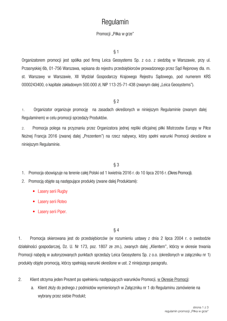 Regulamin Promocji „Piłka w grze” §1 Organizatorem promocji jest spółka pod firmą Leica Geosystems Sp. z o.o. z siedzibą w Warszawie, przy ul. Przasnyskiej 6b, 01-756 Warszawa, wpisana do rejestru przedsiębiorców prowadzonego przez Sąd Rejonowy dla. m. st. Warszawy w Warszawie, XII Wydział Gospodarczy Krajowego Rejestru Sądowego, pod numerem KRS 0000243400, o kapitale zakładowym 500.000 zł, NIP 113-25-71-438 (zwanym dalej „Leica Geosystems”). §2 1. Organizator organizuje promocję na zasadach określonych w niniejszym Regulaminie (zwanym dalej Regulaminem) w celu promocji sprzedaży Produktów. 2. Promocja polega na przyznaniu przez Organizatora jednej repliki oficjalnej piłki Mistrzostw Europy w Piłce Nożnej Francja 2016 (zwanej dalej „Prezentem”) na rzecz nabywcy, który spełni warunki Promocji określone w niniejszym Regulaminie. §3 1. Promocja obowiązuje na terenie całej Polski od 1 kwietnia 2016 r. do 10 lipca 2016 r. (Okres Promocji). 2. Promocją objęte są następujące produkty (zwane dalej Produktami): • Lasery serii Rugby • Lasery serii Roteo • Lasery serii Piper. §4 1. Promocja skierowana jest do przedsiębiorców (w rozumieniu ustawy z dnia 2 lipca 2004 r. o swobodzie działalności gospodarczej, Dz. U. Nr 173, poz. 1807 ze zm.), zwanych dalej „Klientem”, którzy w okresie trwania Promocji nabędą w autoryzowanych punktach sprzedaży Leica Geosystems Sp. z o.o. (określonych w załączniku nr 1) produkty objęte promocją, którzy spełniają warunki określone w ust. 2 niniejszego paragrafu. 2. Klient otrzyma jeden Prezent po spełnieniu następujących warunków Promocji, w Okresie Promocji: a. Klient złoży do jednego z podmiotów wymienionych w Załączniku nr 1 do Regulaminu zamówienie na wybrany przez siebie Produkt; strona 1 z 3 regulamin promocji „Piłka w grze” b. Klient prześle na adres [email protected] kopię faktury dokumentującej nabycie Produktu w Okresie Promocji wraz ze wskazaniem adresu do korespondencji (ta sama faktura może być podstawą uzyskania jednego Prezentu); c. Klient prześle na adres [email protected] podpisane oświadczenie o zgodzie na przetwarzanie danych osobowych dla celów udziału w Promocji o treści: „Wyrażam zgodę na przetwarzanie moich danych osobowych dla celów udziału w Promocji organizowanej przez Leica Geosystems sp. z o.o.”. d. Klient prześle na adres [email protected] podpisane oświadczenie o zgodzie na otrzymywanie informacji handlowych o treści: „Wyrażam zgodę na otrzymywanie od Leica Geosystems sp. z o.o. informacji handlowych drogą elektroniczną zgodnie z ustawą z dnia 18.07.2002 r. o świadczeniu usług drogą elektroniczną”; e. Klient prześle na adres [email protected] oświadczenie o akceptacji niniejszego Regulaminu. 3. Prezent zostanie wysłany do Klienta w terminie 7 dni od daty spełnienia przez Klienta warunków Promocji określonych w ust. 2 niniejszego paragrafu. Prezent wysyłany jest przesyłką kurierską lub za pośrednictwem Poczty Polskiej na adres wskazany przez Klienta. §5 1. Koszty dostarczenia Prezentu ponosi Organizator. 2. Klient nie może przenieść prawa do Prezentu na osobę trzecią lub żądać wymiany Prezentu na ekwiwalent pieniężny. 3. W przypadku odstąpienia od umowy sprzedaży Produktu z przyczyn leżących po stronie Klienta, po dostarczeniu Prezentu do Klienta, Klient zostanie obciążony karą umowną stanowiącą równowartość Prezentu i kosztów przesyłki. §6 1. Reklamacje z powodu widocznych wad fizycznych Prezentu Klient może zgłaszać w momencie jego odbioru. Wszystkie czynności związane ze sprawdzeniem Prezentu powinny być wykonane przy odbiorze Prezentu. W momencie odbioru Prezentu Uczestnik zobowiązany jest sprawdzić, czy Prezent nie ma widocznych uszkodzeń. 2. Reklamacje z powodu wad ukrytych i jakościowych Prezentu, które ujawnią się po dacie ich wydania, Klient jest zobowiązany zgłosić niezwłocznie. 3. W przypadku uznania reklamacji za uzasadnioną przez Organizatora Prezent zostanie wymieniony na wolny od wad. Wymiana Prezentu może nastąpić pod warunkiem uprzedniego zwrotu przez Klienta wadliwego Prezentu. 4. Reklamacje co do przebiegu Promocji mogą być zgłaszane pisemnie na adres korespondencyjny Organizatora: strona 2 z 3 regulamin promocji „Piłka w grze” Leica Geosystems sp. z o.o., ul. Przasnyska 6b, 01-756 Warszawa. 5. Pisemna reklamacja powinna zawierać oznaczenie Klienta, dokładny adres korespondencyjny, adres email oraz telefon kontaktowy, jak również dokładny opis i wskazanie przyczyny reklamacji. §7 1. Dane osobowe Klientów będą przetwarzane przez Organizatora zgodnie z Ustawą z dnia 29 sierpnia 1997 r. o ochronie danych osobowych (Dz. U. 2002 r., Nr 101, poz. 926 ze zm.) w celu realizacji Promocji oraz w celu marketingu bezpośredniego własnych produktów lub usług. 2. Klient ma prawo dostępu do treści swoich danych osobowych oraz ich poprawiania, a także ma prawo wnieść pisemne żądanie zaprzestania przetwarzania danych oraz wnieść sprzeciw wobec przetwarzania jego danych w przypadkach wskazanych przez przepisy prawa. 3. Podanie danych osobowych jest dobrowolne, ale niezbędne do realizacji Promocji przez Organizatora. §8 1. Regulamin dostępny jest na witrynie internetowej pod adresem www.leica-geosystems.pl oraz w siedzibie Leica Geosystems Sp. z o.o. ul. Przasnyska 6b, 01-756 Warszawa. 2. Wszelkie spory związane z Promocją będą rozpatrywane przez sąd powszechny właściwy miejscowo dla Leica Geosystems Sp. z o.o. w Warszawie. 3. Regulamin obowiązuje od dnia 01.04.2016 strona 3 z 3 regulamin promocji „Piłka w grze”