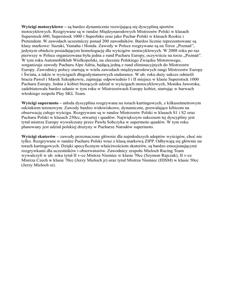 Wyścigi motocyklowe – są bardzo dynamicznie rozwijającą się dyscypliną sportów motocyklowych. Rozgrywane są w randze Międzynarodowych Mistrzostw Polski w klasach Superstock 600, Superstock 1000 i Superbike oraz jako Puchar Polski w klasach Rookie i Pretendent. W zawodach uczestniczy ponad 200 zawodników. Bardzo licznie reprezentowane są klasy markowe: Suzuki, Yamaha i Honda. Zawody w Polsce rozgrywane są na Torze „Poznań”, jedynym obiekcie posiadającym homologację dla wyścigów motocyklowych. W 2008 roku po raz pierwszy w Polsce organizowana była jedna z rund Pucharu Europy, oczywiście na torze „Poznań”. W tym roku Automobilklub Wielkopolski, na zlecenie Polskiego Związku Motorowego, zorganizuje zawody Pucharu Alpe Adria, będącą jedną z rund eliminacyjnych do Mistrzostw Europy. Zawodnicy polscy startują w wielu zawodach międzynarodowych rangi Mistrzostw Europy i Świata, a także w wyścigach długodystansowych endurance. W ub. roku duży sukces odnieśli bracia Paweł i Marek Szkopkowie, zajmując odpowiednio I i II miejsce w klasie Superstock 1000 Pucharu Europy. Jedna z kobiet biorących udział w wyścigach motocyklowych, Monika Jaworska, zadebiutowała bardzo udanie w tym roku w Mistrzostwach Europy kobiet, startując w barwach włoskiego zespołu Play SKL Team. Wyścigi supermoto – młoda dyscyplina rozgrywana na torach kartingowych, z kilkusetmetrowym odcinkiem terenowym. Zawody bardzo widowiskowe, dynamiczne, pozwalające kibicom na obserwację całego wyścigu. Rozgrywane są w randze Mistrzostw Polski w klasach S1 i S2 oraz Pucharu Polski w klasach 250cc, otwartej i quadów. Największym sukcesem tej dyscypliny jest tytuł mistrza Europy wywalczony przez Pawła Sobczyka w supermoto quadów. W tym roku planowany jest udział polskiej drużyny w Pucharze Narodów supermoto. Wyścigi skuterów – zawody przeznaczone głównie dla najmłodszych adeptów wyścigów, choć nie tylko. Rozgrywane w randze Pucharu Polski wraz z klasą markową ZIPP. Odbywają się głównie na torach kartingowych. Dzięki specyficznym właściwościom skuterów, są bardzo emocjonującymi rozgrywkami dla uczestników i obserwatorów. Zawodnicy zespołu Mieloch Racing Team wywalczyli w ub. roku tytuł II v-ce Mistrza Niemiec w klasie 70cc (Szymon Rajczak), II v-ce Mistrza Czech w klasie 70cc (Jerzy Mieloch jr) oraz tytuł Mistrza Niemiec (IDSM) w klasie 50cc (Jerzy Mieloch sr).