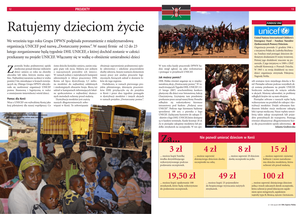 12 PROJEKTY 13 Ratujemy dzieciom życie We wrześniu tego roku Grupa DPWN podpisała porozumienie z międzynarodową organizacją UNICEF pod nazwą „Dostarczamy pomoc”. W naszej firmie od 12 do 23 lutego zorganizowane będą tygodnie DHL UNICEF, z której dochód zostanie w całości przekazany na projekt UNICEF. Włączamy się w walkę o obniżenie umieralności dzieci powodu braku podstawowej opieki medycznej ponad dziesięć milionów dzieci umiera co roku na choroby uleczalne lub takie, którym można zapobiec. Najbardziej narażone są dzieci w wieku poniżej 5 lat, mieszkające w krajach rozwijających się. Dlatego Grupa DPWN zdecydowała się zaoferować organizacji UNICEF pomoc finansową i logistyczną w walce o zmniejszenie śmiertelności wśród dzieci. Z Pomoc dla Kenii Wraz z UNICEF-em wybraliśmy Kenię jako kraj pilotażowy dla naszej współpracy. Co xxxxxxxxxx xxxxxxxxxx xxxxxxxxxx xxxxxxxxx xxxxxxxxx xxxxxxxx xxxxx xxxx xxxxxxxx ósme dziecko kenijskie umiera, zanim osią- obejmuje usprawnienie podstawowej opiegnie piąty rok życia. Malaria jest jednym ki zdrowotnej i szkolenie pracowników z najczęstszych powodów ich śmierci. służby zdrowia. Innym ważnym elementem W ramach jednej z największych kampanii naszej pracy jest analiza procesów logizdrowotnych w Afryce pracownicy DHL stycznych, biorących udział w dostawie leKenia od lipca dystrybuują 3,5 milio- ków do tego regionu. na moskitier do najbardziej oddalonych Dodatkowo, w ramach pierwszego proi niedostępnych obszarów kraju. Biorą też jektu pilotażowego, dziesięciu pracowniudział w kampaniach informujących lokal- ków DHL przyłączyło się do projektu ne społeczeństwo o najbardziej skutecz- w Kenii i przez dwa tygodnie pomagało nych metodach ochrony przed malarią. w dystrybucji moskitier i innych akcjach Dystrybucja moskitier jest częścią w ramach projektu „Dostarczamy pomoc”. xxxxxxxxxx naszych długoterminowych zoboxxxxxxxxxx wiązań w Kenii. To zobowiązanie xxxxxxxxxx xxxxxxxxx xx x FUNDUSZ ONZ United Nations International Childern's Emergency Fund – Fundusz Narodów Zjednoczonych Pomocy Dzieciom. Organizacja powstała 11 grudnia 1946 r. z inicjatywy Polaka dr. Ludwika Reichmana. Fundusz miał pomagać dzieciom dotkniętym działaniami II wojny światowej. Później jego działalność znacznie się poszerzyła. Z jego inicjatywy w 1989 r. ONZ uchwalił Konwencję o Prawach Dziecka. W 1965 r. za swoją działalność na rzecz dzieci organizacja otrzymała Pokojową Nagrodę Nobla. xxxxxxxxxx xxxxxxxxxx xxxxxxxxxx xxxxxxxxx xxxxxxxxx xxxxxxxx xxxxx xxxx xxxxxxxx W tym roku każdy pracownik DPWN będzie mógł zgłosić się jako wolontariusz i pomagać w projektach UNICEF. Jak mo˝esz pomóc? DHL Polska również angażuje się w międzynarodową akcję „Dostraczamy pomoc”. W ramach trwających Tygodni DHL-UNICEF (1223 lutego 2007) uruchomiliśmy konkurs plastyczny dla dzieci oraz Intranetową Aukcję Charytatywną. Licytujemy tam przedmioty przekazane przez zarząd naszej firmy. Ponadto odbędzie się walentynkowy kiermasz intranetowy pod hasłem: „Podaruj serce UNICEF”. Podczas tego kiermaszu będzemy sprzedawać 100 serc z piernika z logo UNICEF. Zachęcamy kurierów do zakupu T-shirtów z logo DHL-UNICEF, które dostępne są w każdym terminalu. Każdy kosztuje 20 zł. Za te pieniądze zakupimy moskitierę lub pudełko strzykawek na szczepionki. W ten spo- Za... Nie pozwól umieraç dzieciom w Kenii 3 zł ... możesz kupić butelkę środka dezynfekującego wykorzystywanego podczas podawania szczepionek. xxxxxxxxxx xxxxxxxxxx xxxxxxxxxx xxxxxxxxx sób uratujesz życie niejednego dziecka w Kenii! Pieniądze zebrane podczas wszystkich akcji zostaną przekazane na projekt UNICEF. Serdecznie zachęcamy do wzięcia udziału w akcjach. Możemy udowodnić, że problemy odległych krajów nie są nam obojętne. Pieniądze zebrane z naszych wpłat będą wykorzystane na przykład do zakupu i dystrybucji moskitier. Dzięki zebranym funduszom lokalne stacje medyczne zakupią leki i sprzęt medyczny. Nasze wpłaty umożliwią także zakup szczepionek lub pojazdów potrzebnych do transportu. Pomogą również sfinansować długoterminowe kursy dla pracowników opieki zdrowotnej. ■ Jolanta Grabowska 4 zł 8 zł ... możesz zapewnić dziesięciorgu dzieciom dawkę szczepionki na odrę. ... możesz zapewnić 20 dzieciom dawkę szczepionki na polio. 19,50 zł ... możesz kupić opakowanie 100 strzykawek, które będą wykorzystane do podawania szczepionek. 49 zł ... możesz kupić 25 pojemników do bezpiecznego wyrzucania zużytych strzykawek. 15 zł ... możesz zapewnić ciężarnej kobiecie i nowo narodzonemu dziecku moskitierę, która ochroni ich przed malarią. 100 zł ... możesz zapewnić dziesięciorgu dzieciom jedną z trzech zalecanych dawek szczepionki, która ochroni je przed dziecięcym zapaleniem opon mózgowych, zapaleniem wątroby typu B, błonicą, tężcem i krztuścem. nr 1 (36) styczeƒ 2007 DHL Express Polska PROJEKTY 14 15 Wspieraj UNICEF! Wpłać dowolną kwotę na konto polskiego oddziału UNICEF, który przekaże pieniądze na projekt DHL i UNICEF. Polski Komitet Narodowy UNICEF Pl. Defilad 1, 00-901 Warszawa. Numer konta: PKO BP S.A. I O/Warszawa, nr 71 1020 1013 0000 0902 0135 4919 xxxxxxxxxx xxxxxxxxxx xxxxxxxxxx xxxxxxxxx xxxxxxxxx xxxxxxxx xxxxx xxxx xxxxxxxx Z dopiskiem: xxxxxxxxxx xxxxxxxxxx xxxxxxxxxx xxxxxxxxx xxxxxxxxx xxxxxxxx xxxxx xxxx xxxxxxxx „Dostarczamy pomoc dzieciom w Kenii” Szkoła pod żaglami Możesz również wysłać specjalne oświadczenie do Ireny Wasiak z Działu HR o odpisaniu dowolnej kwoty ze swojej pensji. Gotowy formularz oświadcze- nia dostępny jest na stronie UNICEF w intranecie korporacyjnym. Więcej informacji na temat współpracy DHL-UNICEF znajdziesz w intranecie. Projektem Tomka Januszewicza z Torunia w ramach Programu Wolontariatu Pracowniczego pod hasłem „Dostrzegamy Innych Ludzi” otworzyliśmy