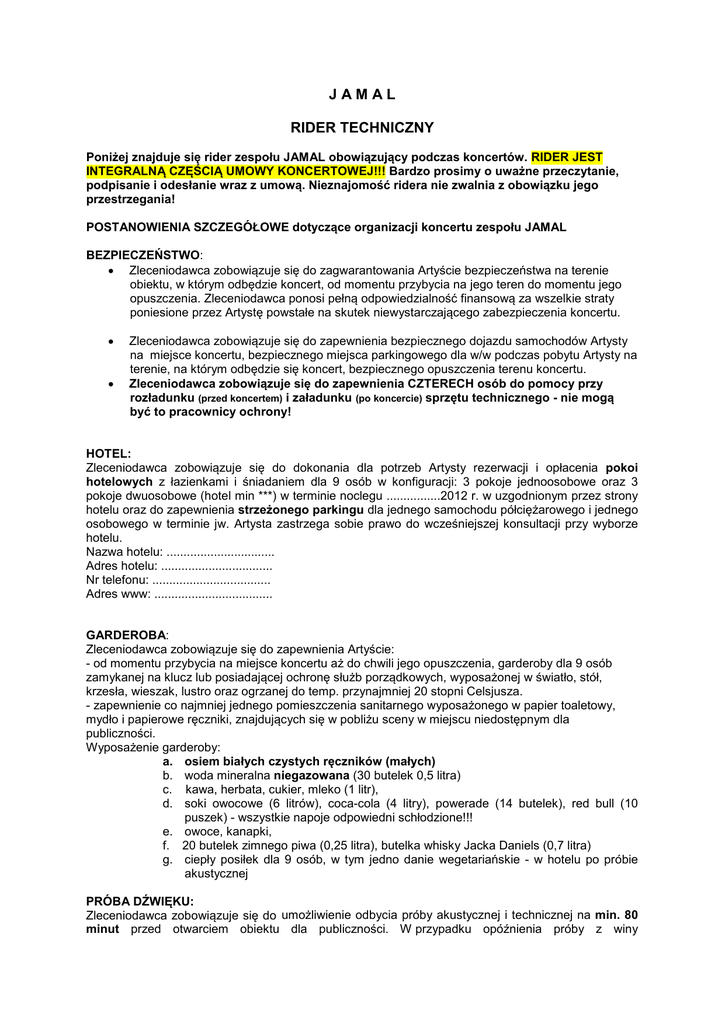 JAMAL RIDER TECHNICZNY Poniżej znajduje się rider zespołu JAMAL obowiązujący podczas koncertów. RIDER JEST INTEGRALNĄ CZĘŚCIĄ UMOWY KONCERTOWEJ!!! Bardzo prosimy o uważne przeczytanie, podpisanie i odesłanie wraz z umową. Nieznajomość ridera nie zwalnia z obowiązku jego przestrzegania! POSTANOWIENIA SZCZEGÓŁOWE dotyczące organizacji koncertu zespołu JAMAL BEZPIECZEŃSTWO: • Zleceniodawca zobowiązuje się do zagwarantowania Artyście bezpieczeństwa na terenie obiektu, w którym odbędzie koncert, od momentu przybycia na jego teren do momentu jego opuszczenia. Zleceniodawca ponosi pełną odpowiedzialność finansową za wszelkie straty poniesione przez Artystę powstałe na skutek niewystarczającego zabezpieczenia koncertu. • • Zleceniodawca zobowiązuje się do zapewnienia bezpiecznego dojazdu samochodów Artysty na miejsce koncertu, bezpiecznego miejsca parkingowego dla w/w podczas pobytu Artysty na terenie, na którym odbędzie się koncert, bezpiecznego opuszczenia terenu koncertu. Zleceniodawca zobowiązuje się do zapewnienia CZTERECH osób do pomocy przy rozładunku (przed koncertem) i załadunku (po koncercie) sprzętu technicznego - nie mogą być to pracownicy ochrony! HOTEL: Zleceniodawca zobowiązuje się do dokonania dla potrzeb Artysty rezerwacji i opłacenia pokoi hotelowych z łazienkami i śniadaniem dla 9 osób w konfiguracji: 3 pokoje jednoosobowe oraz 3 pokoje dwuosobowe (hotel min ***) w terminie noclegu ................2012 r. w uzgodnionym przez strony hotelu oraz do zapewnienia strzeżonego parkingu dla jednego samochodu półciężarowego i jednego osobowego w terminie jw. Artysta zastrzega sobie prawo do wcześniejszej konsultacji przy wyborze hotelu. Nazwa hotelu: ................................ Adres hotelu: ................................. Nr telefonu: ................................... Adres www: ................................... GARDEROBA: Zleceniodawca zobowiązuje się do zapewnienia Artyście: - od momentu przybycia na miejsce koncertu aż do chwili jego opuszczenia, garderoby dla 9 osób zamykanej na klucz lub posiadającej ochronę służb porządkowych, wyposażonej w światło, stół, krzesła, wieszak, lustro oraz ogrzanej do temp. przynajmniej 20 stopni Celsjusza. - zapewnienie co najmniej jednego pomieszczenia sanitarnego wyposażonego w papier toaletowy, mydło i papierowe ręczniki, znajdujących się w pobliżu sceny w miejscu niedostępnym dla publiczności. Wyposażenie garderoby: a. osiem białych czystych ręczników (małych) b. woda mineralna niegazowana (30 butelek 0,5 litra) c. kawa, herbata, cukier, mleko (1 litr), d. soki owocowe (6 litrów), coca-cola (4 litry), powerade (14 butelek), red bull (10 puszek) - wszystkie napoje odpowiedni schłodzione!!! e. owoce, kanapki, f. 20 butelek zimnego piwa (0,25 litra), butelka whisky Jacka Daniels (0,7 litra) g. ciepły posiłek dla 9 osób, w tym jedno danie wegetariańskie - w hotelu po próbie akustycznej PRÓBA DŹWIĘKU: Zleceniodawca zobowiązuje się do umożliwienie odbycia próby akustycznej i technicznej na min. 80 minut przed otwarciem obiektu dla publiczności. W przypadku opóźnienia próby z winy Zleceniodawcy lub problemów technicznych nie leżących po stronie Artysty, zastrzega sobie on możliwość przedłużenia próby dźwiękowej o czas opóźnienia lub do czasu usunięcia usterek technicznych. SCENA: Zleceniodawca zobowiązuje się do zapewnienia posiadającej odpowiednie atesty sceny o wymiarach min. 8m x 10m, odpowiednich parametrów sieci elektrycznej w obiekcie będącym miejscem imprezy: 3 fazy, niezmienne napięcie 220-230 V (granica tolerancji: 5%) w czasie od udostępnienia Artyście obiektu aż do końca imprezy i złożenia sprzętu technicznego. SYSTEM NAGŁOŚNIENIOWY F.O.H. Strony ustalają, że obowiązek nagłośnienia koncertu spoczywa na Zleceniodawcy. Poprzez obowiązek nagłośnienia rozumie się : a) Zagwarantowanie profesjonalnej aparatury nagłośnieniowej opisanej w riderze technicznym b) Zagwarantowanie profesjonalnej aparatury oświetleniowej opisanej w riderze technicznym c) Zagwarantowanie akustyka, elektryka oraz pozostałej obsługi technicznej oraz porządkowej zarówno w trakcie próby jak i trwania koncertu. System nagłośnieniowy powinien mieć moc adekwatną do wielkości imprezy. System musi równomiernie pokrywać dźwiękiem cały obszar widowni, musi być bezwzględnie uziemiony, wolny od szumów i przydźwięków sieciowych. Do klubów i małych pomieszczeń zamkniętych: co najmniej trójdrożny system nagłaśniający o mocy odpowiedniej dla danego miejsca, jednak nie mniej niż 10 kW Imprezy plenerowe, hale, sale koncertowe: co najmniej trójdrożny system nagłaśniający o mocy odpowiedniej dla danego miejsca, jednak nie mniej niż 20 kW Zespół gra dużą ilością niskich tonów do tego potrzebne są mocne i sprawne zestawy niskotonowe (SUBBASSY), prosimy o zapewnienie dużej ilości takich zestawów . Preferujemy firmy o uznanej reputacji: L-acoustics, EAW, HK-audio, Nexo, Meyer Sound, d&b. KONSOLA F.O.H. Preferujemy konsole analogowe: MIDAS, SOUNDCRAFT, YAMAHA seria PM Konsola powinna mieć minimum 36 kanałów, w każdym kanale: zasilanie phantom +48V, pad 20 dB, odwracanie polaryzacji, przestrajalny filtr górno przepustowy, czteropunktowa korekcja EQ w tym minimum dwa pełne filtry parametryczne (dobroć, częstotliwość, gain) (miło by było jak by były cztery takie filtry),10 grup BUS (minimum 8), 10 grup VCA (minimum 8), minimum cztery przełączalne wysyłki AUX pre/post. Konsola powinna być ustawiona centralnie na osi sceny, wśród publiczności, odpowiednio zabezpieczona, na podeście o wysokości max. 30cm, niedopuszczalne jest ustawienie konsoli np.: pod balkonem, za barem, pod ścianą, za głośnikami itp. URZĄDZENIA PERYFERYJNE: - 31 pasmowy (tercjowy) Korektor Graficzny Stereo (insert sumy L/R) Klark-Technik DN-360, BSS. - 6 bramek, np.: Drawmer, BSS, - 10 kompresor