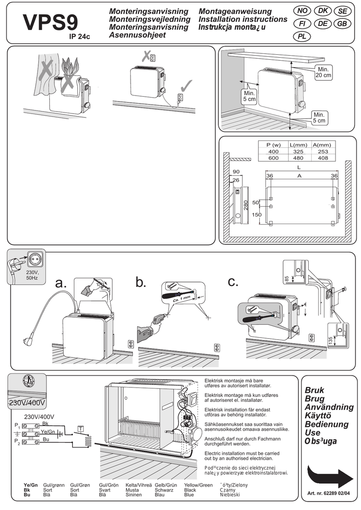 VPS9 IP 24c Monteringsanvisning Monteringsvejledning Monteringsanvisning Asennusohjeet Montageanweisung Installation instructions Instrukcja monta¿u NO DK SE FI DE GB PL Min. 20 cm Min. 5 cm Min. 5 cm P (w) 400 600 L(mm) 325 480 A(mm) 253 408 L 90 36 280 26 A 36 50 230V, 50Hz c. b. a. 85 150 135 1 mm Ca. Elektrisk montasje må bare utføres av autorisert installatør. Elektrisk montage må kun udføres af autoriseret el. installatør. 230V/400V Elektrisk installation får endast utföras av behörig installatör. 230V/400V Bk P1 Ye/Gn Bu P2 Sähköasennukset saa suorittaa vain asennusoikeudet omaava asennusliike. T Anschluß darf nur durch Fachmann durchgeführt werden. Bruk Brug Användning Käyttö Bedienung Use Obs³uga Electric installation must be carried out by an authorised electrician. Pod³¹czenie do sieci elektrycznej nale¿y powierzyæ elektroinstalatorowi. Ye/Gn Bk Bu Gul/grønn Sort Blå Gul/Grøn Sort Blå Gul/Grön Svart Blå Kelta/Vihreä Gelb/Grün Musta Schwarz Sininen Blau Yellow/Green Black Blue ¯ó³ty/Zielony Czarny Niebieski Art. nr. 62289 02/04 Bruksanvisning Brugsanvisning Bruksanvisning Käyttöohjeet VPS9 2. 1. Bedienungsanleitung Instruction for use Instrukcja obs³ugi NO DK SE FI DE GB PL 3. Oljerøk, i ca. 5 min. Olierøg, maks. 5 min. Oljerök, i ca. 5 min. Öljynkatkua, enintään 5 min. Öl verdunste, Max. 5 Min. Oil fumes, max. 5 min. Odparowanie oleju, max. 5 min. 230V, 50Hz 4. 5. 20°C click 6. Romtemperatur Rumtemperatur Rumstemperatur Huonelämpötila Raumtemperatur Room temperature Temperatura w pomieszczeniu 15 min. 20°C 20 20 25 25 Korrigering Justering Korrigering Asettelu Kalibrierung Adjustment Ustawienie Auto- rèset av overtemperatursikring. Auto-rèset af overtemperatursikring. Automatisk återställning av överhettningsskydd Ylikuumenemissuojan automaattinen palautus Auto-reset, Übertemperatursicherung Automatic reset of the overheating cut-out Automatyczne ustawienie zabezpieczenia przed przegrzaniem Rengjøres hver måned i fyringssesongen Rengøring hver måned i opvarmningsesonen Rengörs varje månad under användingsperioden Puhdistetaan kuukausittain käyttöaikana Reinigung, 1x im Monat während der Heizperiode Clean each month during period of use Czyszczenie, raz na miesi¹c w okresie grzewczym NO Service: Adax AS 3060 Svelvik, tlf.:+ 47 33771792 NB! - Ta vare på kvitteringen for dokumentasjon av kjøpsdato. DK Service: Appliance A/S, Blovstrød Teglværksvej 3, DK-3450 Allerød, tel. +45 70205701 NB! - Husk kvittering for købsdato. SE Service: El & Digital service AB, Ringvägen 17 S-10273 Stockholm, tel.:+ 46 (0)8845180 OBS! - Faktura/kvitto gäller som garantibevis. FI Huolto: Elektroskandia Oy, Varastokatu 9, 05800 Hyvinkää, puh.: + 358 10509311 Aronen J & K Oy, Ostuuskunnantie 54A, 00660 Helsinki, puh.: + 358 97247772 Huom! - Säilytä kuitti todistuksena ostopäivästä. DE Service: Adax AS N-3060 Svelvik, Norwegen, tlf. + 46 71240790 (+47 33 77 17 92) NB! - Quittung zum Nachweis des Kaufdatums aufheben. GB Service: Adax AS N-3060 Svelvik, Norway, phone: +47 33771792 NB! - Retain the receipt as proof of date of purchase. PL Serwis: Elektra, ul. Marynarska 14, 02-674 Warszawa, tel. (+22) 8433282 Prosimy zachowaæ rachunek zakupu oraz kartê gwarancyjn¹. Montering Montering Montering Asennus Montage Installation Instalacja www.adax.no Declaration of conformity We declare under our sole responsibility that this product is in conformity with the following standards: EN 60 335-1 (1988)+A2+A5+A6+A51+A52+A53+A54, EN 60 335-2-30 (1992), EN 55014 (1993), EN 60555-2/-3 (1991), EN 50082-1 (1992) following the provisions of Directives 73/23/EEC, 93/68/EEC, 89/336/EEC. Adax A/S, Svelvik, Norway, December 1996. ______________ Tor Åge Kverne