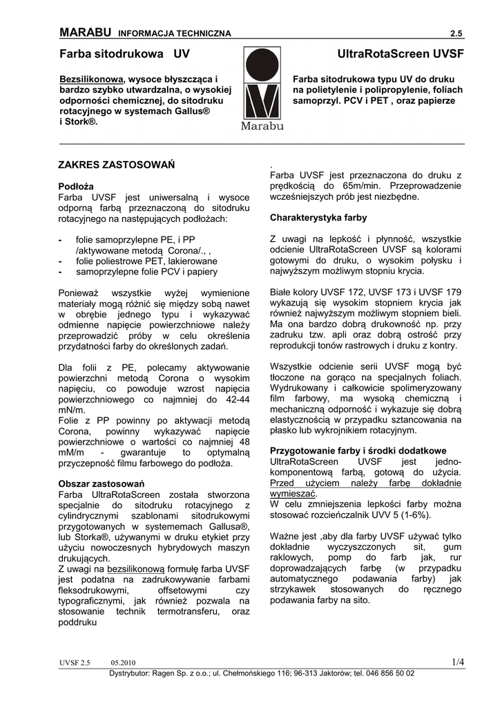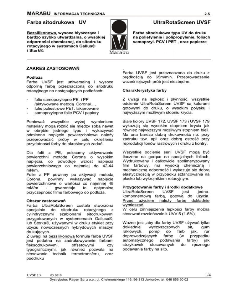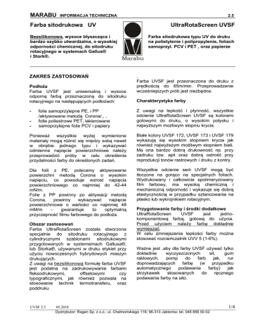 MARABU INFORMACJA TECHNICZNA Farba sitodrukowa UV Bezsilikonowa, wysoce błyszcząca i bardzo szybko utwardzalna, o wysokiej odporności chemicznej, do sitodruku rotacyjnego w systemach Gallus® i Stork®. ZAKRES ZASTOSOWAŃ Podłoża Farba UVSF jest uniwersalną i wysoce odporną farbą przeznaczoną do sitodruku rotacyjnego na następujących podłożach: - folie samoprzylepne PE, i PP /aktywowane metodą Corona/., , folie poliestrowe PET, lakierowane samoprzylepne folie PCV i papiery 2.5 UltraRotaScreen UVSF Farba sitodrukowa typu UV do druku na polietylenie i polipropylenie, foliach samoprzyl. PCV i PET , oraz papierze . Farba UVSF jest przeznaczona do druku z prędkością do 65m/min. Przeprowadzenie wcześniejszych prób jest niezbędne. Charakterystyka farby Z uwagi na lepkość i płynność, wszystkie odcienie UltraRotaScreen UVSF są kolorami gotowymi do druku, o wysokim połysku i najwyższym możliwym stopniu krycia. Ponieważ wszystkie wyżej wymienione materiały mogą różnić się między sobą nawet w obrębie jednego typu i wykazywać odmienne napięcie powierzchniowe należy przeprowadzić próby w celu określenia przydatności farby do określonych zadań. Białe kolory UVSF 172, UVSF 173 i UVSF 179 wykazują się wysokim stopniem krycia jak również najwyższym możliwym stopniem bieli. Ma ona bardzo dobrą drukowność np. przy zadruku tzw. apli oraz dobrą ostrość przy reprodukcji tonów rastrowych i druku z kontry. Dla folii z PE, polecamy aktywowanie powierzchni metodą Corona o wysokim napięciu, co powoduje wzrost napięcia powierzchniowego co najmniej do 42-44 mN/m. Folie z PP powinny po aktywacji metodą Corona, powinny wykazywać napięcie powierzchniowe o wartości co najmniej 48 mM/m gwarantuje to optymalną przyczepność filmu farbowego do podłoża. Wszystkie odcienie serii UVSF mogą być tłoczone na gorąco na specjalnych foliach. Wydrukowany i całkowicie spolimeryzowany film farbowy, ma wysoką chemiczną i mechaniczną odporność i wykazuje się dobrą elastycznością w przypadku sztancowania na płasko lub wykrojnikiem rotacyjnym. Obszar zastosowań Farba UltraRotaScreen została stworzona specjalnie do sitodruku rotacyjnego z cylindrycznymi szablonami sitodrukowymi przygotowanych w systememach Gallusa®, lub Storka®, używanymi w druku etykiet przy użyciu nowoczesnych hybrydowych maszyn drukujących. Z uwagi na bezsilikonową formułę farba UVSF jest podatna na zadrukowywanie farbami fleksodrukowymi, offsetowymi czy typograficznymi, jak również pozwala na stosowanie technik termotransferu, oraz poddruku UVSF 2.5 Przygotowanie farby i środki dodatkowe UltraRotaScreen UVSF jest jednokomponentową farbą, gotową do użycia. Przed użyciem należy farbę dokładnie wymieszać. W celu zmniejszenia lepkości farby można stosować rozcieńczalnik UVV 5 (1-6%). Ważne jest ,aby dla farby UVSF używać tylko dokładnie wyczyszczonych sit, gum raklowych, pomp do farb jak, rur doprowadzających farbę (w przypadku automatycznego podawania farby) jak strzykawek stosowanych do ręcznego podawania farby na sito. 05.2010 Dystrybutor: Ragen Sp. z o.o.; ul. Chełmońskiego 116; 96-313 Jaktorów; tel. 046 856 50 02 1/4 Jeśli czyszczenie jest przeprowadzane przy użyciu automatycznej maszyny do mycia sit, zalecamy, aby przed drukowaniem wykonać dodatkowe ręczne czyszczenie za pomocą środka, który nie miał wcześniej styczności z farbą zawierającą silikon. Aby w czasie druku uniknąć wielu problemów powstających z niedokładnego wyczyszczenia sita, lub rakla z farby silikonowej, należy dodatkowo przemyć je środkiem czyszczącym przed rozpoczęciem druku farbą bezsilikonową. W celu uniknięcia powstawania zjawiska tzw. „skórki pomarańczy” na zadruku farbowym, należy zapewnić optymalną ilość farby w cylindrze sitowym. Odporność mechaniczna Po dokładnym i całkowitym utwardzeniu film farbowy wykazuje się znakomitą odpornością na ścieranie, zdrapywanie i składowanie w stosie, jak również odporność na rozpuszczalniki, alkohol, pot, wodę i inne. SITA, WYDAJNOŚĆ Farba UVSF została opracowana w szczególności do sitodruku rotacyjnego systemem Gallusa® (typ KS, KM) i systemem Stork® ( RM 305 z 17, 13 lub 11% otwartej powierzchni. Jeden kilogram farby UVSF wystarcza na zadrukowanie 60–90m² powierzchni w zależności od rodzaju szablonu i podłoża. Utwardzanie UVSF jest szybko utwardzalną farbą UV do sitodruku rotacyjnego. Do utwardzenia wymagany jest promiennik, typu UV, z jedną lub dwoma średniociśnieniowymi lampami rtęciowymi o mocy 150-200 W/cm, przy szybkości taśmy 25-65 m/min. Przy druku farbą białą UVSF 170 i 173 do 85 m/min. Szybkość utwardzania farby jest zależna od rodzaju promiennika UV, liczby lamp, ich wieku i mocy, grubości warstwy farby, koloru, rodzaju podłoża, oraz szybkości przesuwu taśmy. Warstwa farby musi pomyślnie przejść test przyczepności z taśmą klejącą, wykonywany po schłodzeniu zadrukowanego przedmiotu do temperatury pokojowej. Proces utwardzania zachodzi w farbie jeszcze przez pewien czas po wyjściu z suszarki (polimeryzacja wtórna), dlatego pełną wytrzymałość osiąga ona po 24 godzinach. Trwałość koloru Jest ona uzależniona od koloru, pigmenty użyte do produkcji farb z serii UVSF wykazują się trwałością kolorów od niskiej do wysokiej. Oznacza to, że generalnie nie zaleca się stosowania farby na aplikacjach zewnętrznych. Na specjalne zamówienie są jednak dostępne odcienie o podwyższonej trwałości kolorów. UVSF 2.5 ASORTYMENT Kolory bazowe (patrz karta kolorów Sytemu Ultracolor) UVSF 922 j. żółty UVSF 924 żółty UVSF 926 pomarańczowy UVSF 932 czerwień flagowa UVSF 934 czerwień karmin. UVSF 936 magenta UVSF 950 fiolet UVSF 952 ultramaryna UVSF 956 niebieski UVSF 960 c. zielony UVSF 962 zielony UVSF 970 biały UVSF 980 czarny Wszystkie kolory bazowe można ze sobą mieszać. Aby zachować specjalną charakterystykę far