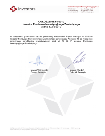OGŁOSZENIE 61/2010 Investor Funduszu Inwestycyjnego Zamkniętego z dnia 17/08/2010 W załączeniu przekazuje się do publicznej wiadomości Raport bieżący nr 57/2010 Investor Funduszu Inwestycyjnego Zamkniętego zawierający Aneks nr 16 do Prospektu emisyjnego certyfikatów inwestycyjnych serii M, N, O, P Investor Funduszu Inwestycyjnego Zamkniętego. Maciej Wiśniewski Prezes Zarządu Arnold Mardoń Członek Zarządu INVESTOR FIZ RB_FI_E 57 2010 korekta KOMISJANADZORUFINANSOWEGO Raport bieżący funduszu inwestycyjnego nr 57 / 2010 (numer kolejny raportu / rok) Data przekazania: 2010-08-17 Nazwa podmiotu: INVESTOR FUNDUSZ INWESTYCYJNY ZAMKNIĘTY Temat raportu: Aneks do Prospektu emisyjnego certyfikatów inwestycyjnyc h serii M, N, O, P Investor Funduszu Inwestyc yjnego Zamkniętego Podstawa prawna § 42 ust. 1 pkt 37 oie - inne zdarzenia, przewidziane statutem funduszu WIADOMOŚĆ W załączeniu przekazujemy Aneks nr 16 z dnia 6 sierpnia 2010 r. do Prospektu emisyjnego certyfikatów inwestycyjnych serii M, N, O, P Investor Funduszu Inwestycyjnego Zamkniętego zatwierdzony przez Komisję Nadzoru Finansowego. Plik Opis Aneks16.2010.08.06.pdf PODPISYOSÓBREPREZENTUJĄCYCHPODMIOT Data Imię i Nazwisko Stanowisko/Funkc ja 2010-08-17 Maciej Wiśniewski Prezes Zarządu 2010-08-17 Grzegorz Mielcarek Członek Zarządu Podpis Komisja Nadzoru Finansowego 1 Aneks nr 16 z dnia 6 sierpnia 2010 r. do Prospektu Emisyjnego Certyfikatów Inwestycyjnych serii M, N, O, P Investor Funduszu Inwestycyjnego Zamkniętego 1. W Prospekcie emisyjnym Certyfikatów Inwestycyjnych serii M, N, O, P Investor Funduszu Inwestycyjnego Zamkniętego zatwierdzonym przez Komisję Nadzoru Finansowego w dniu 20 sierpnia 2009 r. wprowadza się następujące zmiany: 1) w związku z umorzeniami Certyfikatów, w rozdziale 1 Podsumowanie w pkt 34 dodaje się zdanie w brzmieniu: W wyniku emisji i umorzeń łączna liczba Certyfikatów Funduszu na dzień 31 lipca 2010 r. wynosiła 184.543. (dane nieaudytowane) 2) w związku z ustaleniem wyceny Certyfikatów, w rozdziale 1 Podsumowanie w pkt 35 dodaje się zdanie w brzmieniu: Wartość Aktywów Netto na Certyfikat Inwestycyjny Funduszu na dzień 31 lipca 2010 r. wynosiła 2.222,62 zł, co oznacza wzrost o 122,26 % w stosunku do ceny emisyjnej Certyfikatów serii A (z uwzględnieniem podziału Certyfikatów 1:10 z dnia 1 czerwca 2006 r.). (dane nieaudytowane) 3) w związku z umorzeniami Certyfikatów, w rozdziale 4 w pkt 4.1.8 dodaje się punkt w brzmieniu: • W wyniku emisji i umorzeń łączna liczba Certyfikatów Funduszu na dzień 31 lipca 2010 r. wynosiła 184.543. (dane nieaudytowane) 4) w związku z przekazaniem raportu kwartalnego Funduszu za 2 kwartał 2010 r. w rozdziale 4 w pkt. 4.2.2 dodaje się tabele i akapity w brzmieniu: Na podstawie raportu kwartalnego Funduszu za okres od 1 kwietnia 2010 r. do 30 czerwca 2010 r. (dane nieaudytowane) Wybrane informacje finansowe Funduszu w tys. zł, chyba że wskazano inaczej. Pozycja bilansu 2010/06/30 415 142 Aktywa 2009/06/30 569 280 5 257 80 766 Aktywa netto 409 884 488 514 Kapitał funduszu 396 479 464 250 Zobowiązania Dochody zatrzymane 19 401 117 435 Wzrost (spadek) wartości lokat w odniesieniu do ceny nabycia - 5 996 - 93 171 Kapitał funduszu i zakumulowany wynik z operacji 409 884 488 514 Liczba zarejestrowanych certyfikatów inwestycyjnych 185 798 211 955 2 206,07 2 304,80 Wartość aktywów netto na certyfikat inwestycyjny Źródło: raport kwartalny Funduszu (dane nieaudytowane) 1 2010/06/30 Wartość według ceny nabycia w tys. SKŁADNIKI LOKAT 2009/06/30 Wartość według wyceny na dzień bilansowy w tys. Wartość według ceny nabycia w tys. 21,95 166 369 Akcje 123 898 Kwity depozytowe - - 0,00 Dłużne papiery wartościowe - - 0,00 Instrumenty pochodne 91 133 Procentowy udział w aktywach ogółem Wartość według wyceny na dzień bilansowy w tys. 428 - Procentowy udział w aktywach ogółem 94 538 16,61 463 0,08 - 0,00 1 310 156 0,04 4 243 2 242 0,39 Certyfikaty inwestycyjne 77 715 105 637 25,45 157 444 138 070 24,25 Depozyty 70 996 70 996 17,10 199 015 199 015 34,96 Razem 273 918 267 922 Źródło: raport kwartalny Funduszu (dane nieaudytowane) 64,54 527 499 434 328 76,29 od 2010/04/01 do 2010/06/30 Rachunek wyniku z operacji od 2009/04/01 do 2009/06/30 Przychody z lokat 9 013 1 726 Koszty funduszu 2 581 19 657 Koszty funduszu netto 2 581 19 657 Przychody z lokat netto 6 433 - 17 931 Zrealizowany i niezrealizowany zysk (strata) - 79 580 34 502 Wynik z operacji - 73 148 16 571 - 393,69 78,18 Wynik z operacji przypadający na certyfikat inwestycyjny w PLN Źródło: raport kwartalny Funduszu (dane nieaudytowane) od 2010/04/01 do 2010/06/30 Rachunek przepływów pieniężnych od 2009/04/01 do 2009/06/30 Przepływy środków pieniężnych z działalności operacyjnej 86 3010 102 761 Przepływy środków pieniężnych z działalności finansowej - 25 021 - 12 066 Skutki zmian kursów wymiany środków pieniężnych i ekwiwalentów środków pieniężnych 56 506 1 330 Zmiana stanu środków pieniężnych netto 61 280 90 695 Środki pieniężne i ekwiwalenty środków pieniężnych na początek okresu sprawozdawczego 71 979 227 767 133 259 318 462 Środki pieniężne i ekwiwalenty środków pieniężnych na koniec okresu sprawozdawczego Źródło: raport kwartalny Funduszu (dane nieaudytowane) 5) w związku z przekazaniem raportu kwartalnego Funduszu za 2 kwartał 2010 r., w rozdziale 4 w pkt 4.2.3 dodaje się akapity i tabele w brzmieniu: Na podstawie raportu kwartalnego Funduszu za okres od 1 kwietnia 2010 r. do 30 czerwca 2010 r. (dane nieaudytowane) Na dzień 30 czerwca 2010 r. Aktywa Funduszu wynosiły 415.142 tys. zł, na co składały się akcje o wartości 91.133 tys. zł, certyfikaty inwestycyjne o wartości 105.637 tys. zł, instrumenty pochodne o wartości 156 tys. zł, należności o wartości 4.854 tys. zł, transakcje przy zobowiązaniu się drugiej strony do odkupu o wartości 80.102 tys. zł oraz środ
