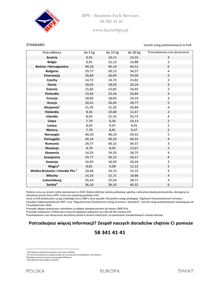 BPS – Business Pack Services 58 341 41 41 www.kurierbps.pl STANDARD Kraj odbioru Austria Belgia Bośnia i Hercegowina Bułgaria Chorwacja Czechy Dania Estonia Finlandia Francja Grecja Hiszpania1 Holandia Irlandia Litwa Łotwa Niemcy Norwegia Portugalia Rumunia Słowacja Słowenia Szwajcaria Szwecja Węgry2 Wielka Brytania i Irlandia Płn.3 Włochy Luksemburg Serbia4 Cennik usług podstawowych w EUR do 3 kg 9,91 9,91 40,10 29,77 26,84 14,72 18,03 15,82 23,56 18,03 20,41 21,35 8,36 8,92 7,70 8,92 7,70 40,10 40,10 29,77 8,70 14,33 29,77 16,93 8,81 10,46 14,33 25,54 36,10 do 10 kg 10,13 12,12 40,10 30,15 26,84 14,72 18,03 15,82 23,56 18,03 26,45 21,35 10,68 21,35 8,36 9,47 8,81 40,10 40,10 30,15 8,92 14,33 30,15 16,93 9,08 14,72 15,71 25,54 36,10 do 30 kg 14,33 14,88 44,52 34,57 29,05 15,82 20,24 16,93 26,84 19,14 29,77 26,84 12,67 25,73 10,13 9,91 9,47 44,52 44,52 34,57 12,67 18,75 34,57 20,24 12,12 14,72 19,86 28,71 40,32 Przewidywany czas doręczenia 3 2 6 4 4 2 3 2 4 3 5 4 2 4 2 2 2 5 4 3 2 4 4 3 2 3 4 4 6 Podane ceny są cenami netto wyrażonymi w EUR. Należy doliczyć opłatę paliwową, zgodną z aktualną stawką przewoźnika, dostępną na oficjalnej stronie firmy DPD. Ceny nie zawierają podatku VAT. Ceny w EUR przeliczane są wg średniego kursu NBP z dnia wysyłki. Wszystkie usługi podlegają "Ogólnym Postanowieniom Umowy i Zasadom Odpowiedzialności BPS" oraz "Regulaminowi Świadczenia Usług Economy i Standard". Cennik usług podstawowych obowiązuje od 13 października 2016. Przesyłki objęte powyższym cennikiem są objęte ubezpieczeniem do kwoty 1000 PLN. Przesyłki nadawane z Polski poza Unię Europejską nadawane są z 0% lub NP stawką VAT. Przewidywane czas doręczenia wyrażony został w dniach roboczych, na podstawie standardowych czasów dostaw. Potrzebujesz więcej informacji? Zespół naszych doradców chętnie Ci pomoże 58 341 41 41 1 Nie obejmuje Wysp Kanaryjskich oraz Ceuty i Mellila. W ramach powyższych usług przesyłki nie sa doręczane do Watykanu i San Marino Dodatkowy dzień tranzytu w przypadku Offshores. 4 Nie obejmuje Czarnogóry i Kosowa. 2 3 BPS – Business Pack Services 58 341 41 41 www.kurierbps.pl Wymiary przesyłki standardowej Przesyłka niestandardowa, spełniająca przynajmniej jeden z poniższych warunków Paczka o kształcie cylindrycznym, okrągłym, owalnym np. tuba, wałek z tkaniną Paczka o nieregularnych kształtach, w tym paczki, które nie są zapakowane w karton/opakowanie o regularnych kształtach Paczka z wystającymi elementami lub owinięta w materiał uniemożliwiający swobodne przesuwanie po sorterze takie jak guma, itp. Opony, jeśli są zapakowane niezgodnie z wytycznymi DPD Polska (szczegółowe informacje zawiera - Instrukcja prawidłowego pakowania opon w DPD Polska Paczka, której najdłuższy bok przekracza maksymalną długość. Paczka, której suma wymiarów przekracza dopuszczalne gabaryty Paczka ważąca więcej niż 30 kg Paczka składająca się z dwóch odrębnych części połączonych w jedną nieregularną całość np. za pomocą folii stretch, taśmy Opłaty dodatkowe Nazwa usługi / opłaty dodatkowej Zwrot do nadawcy Dodatkowa ochrona ubezpieczeniowa - powyżej 1000 PLN do 2000 PLN - powyżej 2000 PLN do 3000 PLN - powyżej 3000 PLN do 4000 PLN - powyżej 4000 PLN do 5000 PLN - powyżej 5000 PLN Przesyłka niestandardowa Opony bez znacznika Dodatkowy Kod Taryfy Celnej Potwierdzenie doręczenia przesyłki List wypisywany ręcznie Przekroczenie ograniczeń technicznych Pusty podjazd CENA wg cennika usług podstawowych 1,20 PLN 2,20 PLN 3,50 PLN 5,00 PLN 0,2% zadeklarowanej wartości 26 EUR za paczkę 1,00 EUR za każdą pozycję 1,50 EUR za każdą pozycję 3,00 EUR za list przewozowy 20,00 PLN 26,00 EUR za paczkę 10,00 PLN Odprawa celna - należy doliczyć dodatkowe 2 dni co czasu dostawy - Bośnia i Hercegowina 40 EUR za przesyłkę - Lichtenstein 40 EUR za przesyłkę - Norwegia 40 EUR za przesyłkę - Serbia 40 EUR za przesyłkę - Szwajcaria 40 EUR za przesyłkę Nazwa usługi / opłaty dodatkowej Dopłata strefowa Dania Estonia Finlandia Francja Grecja Hiszpania Holandia Niemcy Niemcy - Busingen Norwegia Portugalia Szwajcaria CENA 10 EUR 10 EUR 20 EUR 10 EUR 15 EUR 15 EUR 10 EUR 10 EUR 50 EUR 60 EUR 20 EUR 45 EUR Szwecja Wielka Brytania i Irlandia Płn. Włochy Włochy - Livigno i Campione d'Italia 15 EUR 10 EUR 15 EUR 100 EUR Opłata za anulowanie zlecenia Zwrot zapłaty dokonanej za pośrednictwem PayU PayPal 10 PLN 1% 3% Podane ceny są cenami netto wyrażonymi w EUR. Należy doliczyć opłatę paliwową, zgodną z aktualną stawką przewoźnika, dostępna na oficjalnej stronie internetowej DPD. Ceny nie zawierają podatku VAT. Ceny w EUR przeliczane są wg średniego kursu NBP z dnia wysyłki. BPS – Business Pack Services 58 341 41 41 www.kurierbps.pl Tabela dopłat strefowych Kraj doręczenia Dania Estonia Finlandia - Wyspy Alandzkie Francja Grecja Hiszpania Niemcy Norwegia Portugalia Szwajcaria Szwecja Wielka Brytania Włochy Kody pocztowe obejmujące strefę dopłaty 3700 3720 3730 3740 88001 do 88005 96027 22000-22999 3751 3760 3770 3782 91301 do 91320 96098 3790 4592 5960 5970 92001 do 92420 5985 6720 7884 8305 93001 do 94799 8592 9940 9950 9960 17410 17580 17590 17630 180xx 189xx 07000 do 07999 18565 25845 25846 do 25847 17670 17740 17880 17940 49xxx 34003 do 37005 22870 29242 29253 29259 28xxx do 29xxx 70xxx do 74xxx 56360 56590 56780 85330 80xxx do 85xxx 85350 20000 do 20999 25869 25929 do 25933 25938 do 25942 25980 25985 do 25986 25988 do 25990 26474 26486 26548 27498 Helgoland 83256 78263 do 78266 Busingen 25849 25859 25863 9170 do 9179 9500xxx do 9690xxx 6911 Campione d'Italia 10005 13025 13033 13034 BTxx-xx FK17-21 GYxx-xx HSxx-xx 04020 25946 do 25949 25952 do 25955 25961 do 25970 8099 9700xxx do 9950xxx 7562 - 7563 Samnan 13036 13038 13039 13042 Imxx-xx IVxx-xx JExx-xx KA27-28 30121 do 30126 25992 do 25994 25996 do 25999 26465 26571 26579 26757 9960xxx do 9980xxx 7560 Mart