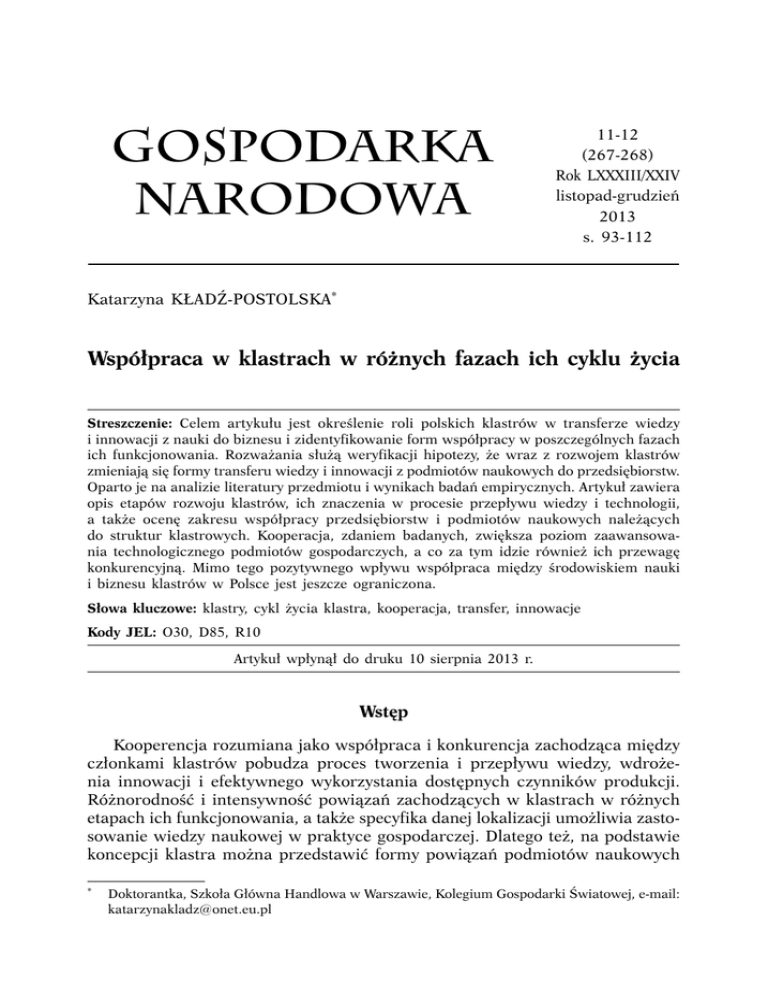 GOSPODARKA NARODOWA 11-12 (267-268) Rok LXXXIII/XXIV listopad-grudzień 2013 s. 93-112 Katarzyna KŁADŹ-POSTOLSKA* Współpraca w klastrach w różnych fazach ich cyklu życia Streszczenie: Celem artykułu jest określenie roli polskich klastrów w transferze wiedzy i innowacji z nauki do biznesu i zidentyfikowanie form współpracy w poszczególnych fazach ich funkcjonowania. Rozważania służą weryfikacji hipotezy, że wraz z rozwojem klastrów zmieniają się formy transferu wiedzy i innowacji z podmiotów naukowych do przedsiębiorstw. Oparto je na analizie literatury przedmiotu i wynikach badań empirycznych. Artykuł zawiera opis etapów rozwoju klastrów, ich znaczenia w procesie przepływu wiedzy i technologii, a także ocenę zakresu współpracy przedsiębiorstw i podmiotów naukowych należących do struktur klastrowych. Kooperacja, zdaniem badanych, zwiększa poziom zaawansowania technologicznego podmiotów gospodarczych, a co za tym idzie również ich przewagę konkurencyjną. Mimo tego pozytywnego wpływu współpraca między środowiskiem nauki i biznesu klastrów w Polsce jest jeszcze ograniczona. Słowa kluczowe: klastry, cykl życia klastra, kooperacja, transfer, innowacje Kody JEL: O30, D85, R10 Artykuł wpłynął do druku 10 sierpnia 2013 r. Wstęp Kooperencja rozumiana jako współpraca i konkurencja zachodząca między członkami klastrów pobudza proces tworzenia i przepływu wiedzy, wdrożenia innowacji i efektywnego wykorzystania dostępnych czynników produkcji. Różnorodność i intensywność powiązań zachodzących w klastrach w różnych etapach ich funkcjonowania, a także specyfika danej lokalizacji umożliwia zastosowanie wiedzy naukowej w praktyce gospodarczej. Dlatego też, na podstawie koncepcji klastra można przedstawić formy powiązań podmiotów naukowych * Doktorantka, Szkoła Główna Handlowa w Warszawie, Kolegium Gospodarki Światowej, e-mail: [email protected] 94 GOSPODARKA NARODOWA Nr 11-12/2013 zajmujących się pracami badawczo-rozwojowymi i przedsiębiorstwami wykorzystującymi wyniki tych prac. Celem artykułu jest określenie roli polskich klastrów w transferze wiedzy i innowacji z nauki do biznesu i zidentyfikowanie form współpracy w poszczególnych fazach ich funkcjonowania. Rozważania służą weryfikacji hipotezy, że wraz z rozwojem klastrów zmieniają się formy transferu wiedzy i innowacji z podmiotów naukowych do przedsiębiorstw. Rozważaniom opartym na wynikach badań ankietowych towarzyszy przegląd literatury przedmiotu. Cykl życia klastra W znaczeniu ekonomicznym termin klaster został upowszechniony w 1990 r. przez amerykańskiego ekonomistę Portera, który zdefiniował go jako geograficzne skupisko wzajemnie powiązanych firm, wyspecjalizowanych dostawców, jednostek świadczących usługi, firm działających w pokrewnych sektorach i związanych z nimi instytucji (uniwersytetów, jednostek normalizacyjnych i stowarzyszeń branżowych) w poszczególnych dziedzinach, konkurujących między sobą, ale także współpracujących [Porter, 2001, s. 246]. Mimo, że rosnące zainteresowanie koncepcją klastra pojawiło się w naukach ekonomicznych na początku lat 90. XX w., to pierwowzorem dzisiejszych klastrów są dystrykty przemysłowe [Marshall, 1920]. Koncepcja klastra nawiązuje również do teorii biegunów wzrostu [Perroux, 1964], koncepcji stref wzrostu [Dahmén, 1988], teorii wzrostu endogenicznego [Romer, 1990] oraz nowej geografii ekonomicznej [Krugman, 1991]. Klastry powstają we wszystkich sektorach gospodarki. Występują zarówno w przemyśle i usługach, w sektorach wysokich technologii, jak i sektorach tradycyjnych. Charakteryzują się różnym poziomem innowacyjności i zaawansowania technologicznego, a tym samym odmiennymi strategiami i perspektywami rozwoju [Brodzicki, Szultka, Tamowicz, 2004, s. 8]. Tworzone są przez przedsiębiorstwa, instytucje naukowe lub władze lokalne, a podejmowane rozwiązania organizacyjne służą realizacji co najmniej jednej inicjatywy klastrowej1. W literaturze przedmiotu można odnaleźć liczne opisy procesu powstania klastra, często ściśle związane z fazami jego funkcjonowania. Rozwój klastra można zobrazować za pomocą jego cyklu życia przedstawionego na rysunku 1. W fazie embrionalnej klastra (ang. embryonic clusters) zainteresowane współpracą przedsiębiorstwa realizują wspólne przedsięwzięcia. Powstaniu klastra sprzyja koncentracja przestrzenna podmiotów gospodarczych tego samego sektora. Istotną rolę na tym etapie rozwoju przypisuje się również liderom w branży, a nawet działaniom rządu i instytucjom wspierającym klastry, w ramach promowania korzyści kooperacji i transferu innowacji. 1 Inicjatywa klastrowa to zorganizowane działania zainteresowanych podmiotów (przedsiębiorstw, władz publicznych i środowiska naukowego) mające na celu przyspieszenie rozwoju oraz wzrostu konkurencyjności klastrów w regionie [Sölvell, Lindqvist, Ketels, 2003, s. 17]. Katarzyna Kładź-Postolska, Współpraca w klastrach w różnych fazach ich cyklu życia 95 Rysunek 1 Cykl życia klastra Klaster embrionalny Klaster schyłkowy Klaster wzrostowy Klaster dojrzały Źródło: A Practical Guide…, 2004, s. 11 Klastry wzrostowe (ang. established clusters) skupiają kolejne przedsiębiorstwa, instytucje otoczenia biznesu i jednostki naukowe. Rosnąca, lokalna przewaga konkurencyjna tychże podmiotów umożliwia kontynuację podjętych działań innowacyjnych. Jednak relatywnie duża liczba członków klastra ułatwia imitację wyrobów. W fazie dojrzałości klastra (ang. mature clusters) liczba jego uczestników maleje bądź utrzymuje się na stabilnym poziomie. Upowszechnienie rozwiązań wykorzystywanych przez przedsiębiorstwa przekłada się na ich kopiowanie. Dlatego też, standardowy charakter procesów produkcyjnych i usług oferowanych na rynku wymaga znalezienia nisz rynkowych lub zwiększenia produktywności firm. Niektóre klastry 