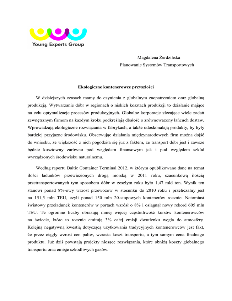 Magdalena Żerdzińska Planowanie Systemów Transportowych Ekologiczne kontenerowce przyszłości W dzisiejszych czasach mamy do czynienia z globalnym zaopatrzeniem oraz globalną produkcją. Wytwarzanie dóbr w regionach o niskich kosztach produkcji to działanie mające na celu optymalizacje procesów produkcyjnych. Globalne korporacje zlecające wiele zadań zewnętrznym firmom na każdym kroku podkreślają dbałość o zrównoważony łańcuch dostaw. Wprowadzają ekologiczne rozwiązania w fabrykach, a także udoskonalają produkty, by były bardziej przyjazne środowisku. Obserwując działania międzynarodowych firm można dojść do wniosku, że większość z nich pogodziła się już z faktem, że transport dóbr jest i zawsze będzie kosztowny zarówno pod względem finansowym jak i pod względem szkód wyrządzonych środowisku naturalnemu. Według raportu Baltic Container Terminal 2012, w którym opublikowano dane na temat ilości ładunków przewiezionych drogą morską w 2011 roku, szacunkową ilością przetransportowanych tym sposobem dóbr w zeszłym roku było 1,47 mld ton. Wynik ten stanowi ponad 8%-owy wzrost przewozów w stosunku do 2010 roku i przeliczalny jest na 151,5 mln TEU, czyli ponad 150 mln 20-stopowych kontenerów rocznie. Natomiast światowy przeładunek kontenerów w portach wzrósł o 8% i osiągnął nowy rekord 605 mln TEU. Te ogromne liczby obrazują mniej więcej częstotliwość kursów kontenerowców na świecie, które to rocznie emitują 3% całej emisji dwutlenku węgla do atmosfery. Kolejną negatywną kwestią dotyczącą użytkowania tradycyjnych kontenerowców jest fakt, że przez ciągły wzrost cen paliw, wzrasta koszt transportu, a tym samym cena finalnego produktu. Już dziś powstają projekty niosące rozwiązania, które obniżą koszty globalnego transportu oraz emisje szkodliwych gazów. 1. Cargo-żaglowiec projektu B9 Shipping Irlandzka firma B9 Shipping będąca częścią B9 ENERGY GROUP, przedstawiła projekt, który z pewnością zainteresuje nie jednego armatora. Kontenerowiec napędzany w 60% energią wiatrową, to połączenie starodawnego żaglowca z nowocześnie wyposażonym statkiem do przewożenia kontenerów. Na wypadek gdyby darmowa energia wiatrowa chwilowo była zbyt słaba do utrzymania optymalnej prędkości, a także podczas manewrów przy portach morskich, statek będzie korzystał z silników Rolls Royce’a napędzanych biogazem. Produkcją biogazu ze śmieci zajmie się spółka B9 Organic Energy, która również wchodzi w skład grupy. Rysunek 1. Cargo-żaglowiec projektu B9 Shipping Źródło: http://www.b9energy.com Nowoczesny 3000-tonowy cargo-żaglowiec ma długość prawie 100 metrów, posiada trzy maszty, każdy wysokości około 55 metrów. Grupa B9 zamierza pozyskać surowce do wytworzenia nowych cargo-żaglowców ze starych, tradycyjnych kontenerowców. Szacowany koszt wytworzenia pierwszego statku to 45 mln dolarów, a jego budowa ma zająć trzy lata. Specjalistyczne ożaglowanie (Dyna-rig) zaprojektowane przez niemieckiego architekta Wilhelma Prollsa oraz nowy model kadłuba od kilku miesięcy są testowane na Uniwersytecie w Southampton i z dostępnych informacji wynika, że badania przebiegają pomyślnie. Grupa B9 podkreśla, że w ich statku wszystko zostało skonstruowane tak, aby nie było potrzeby korzystania z tradycyjnych paliw, tym samym ograniczając emisję dwutlenku węgla niemalże do zera. Co stanowi ogromną różnice w porównaniu do tradycyjnego kontenerowca, który dziennie emituje średnio 16 ton dwutlenku węgla. 2. Projekt UT Wind Challenger Kolejnym projektem kontenerowca przyszłości pochwalił się Uniwersytet w Tokio podczas tegorocznych targów morskich w Japonii. UT Wind Challenger to ekologiczny kontenerowiec zbudowany głównie z tworzywa sztucznego i aluminium. Posiada dziewięć pustych w środku masztów, każdy o wysokości prawie 50 metrów i szerokości około 20 metrów. Rysunek 2. UT Wind Challenger Źródło: http://www.gizmag.com/next-gen-ships-sails-lower-fuel-use/22289/ Żagle dzięki nowoczesnej technologii sterowane będą automatycznie, aby w razie sztormu mogły zostać złożone. Każdy z dziewięciu masztów składa się z pięciu elementów i kosztuje ok. 2,5 mln dolarów. Głównym atutem powyższego kontenerowca jest redukcja zużycia tradycyjnego paliwa o 30% dzięki wykorzystaniu energii wiatru. Według ekspertów z tokijskiego Uniwersytetu inwestycja powinna się zwrócić w przeciągu od 5 do 10 lat. Pierwszy statek ma wypłynąć już w 2016 roku, jednak początkowo będzie to model nieco mniejszych rozmiarów, przeznaczony do testów na pełnym morzu. 3. SkySails Specjaliści z firmy Beluga Shipping już kilka lat temu wpadli na pomysł wykorzystania siły wiatru w celu zredukowania zużycia paliwa przez kontenerowce. Projekt ten jest dużo tańszą inwestycją, a pozwala na zaoszczędzenie od 15% do 50% kosztów paliwa. Urządzenie SkySails to latawiec o powierzchni około 160 metrów kwadratowych, który po przymocowaniu do statku napędza go dzięki energii wiatru. Do zamontowania go potrzeba około 13 ludzi, całą obsługę oferuje firma. Koszt jednego latawca waha się od 300 tysięcy do 600 tysięcy euro. Rysunek 3. SkySails Źródło: http://www.przejdznaswoje.pl/artykuly/energia-wiatru-napedza-wielkie-lodzie 4. Projekty łączące energie wiatrową oraz słoneczną Patrząc na projekty nowoczesnych kontenerowców B9 Shipping oraz UT Wind Challenger można zauważyć, że w obu przypadkach mamy do czynienia z dużą powierzchnią żagli. Pierwsze co się nasuwa na myśl to „a może by tą powierzchnię wykorzystać?”. I tak właśnie pomyślały między innymi dwie firmy: australijska SolarSailor oraz japońska Eco Marine Power. Przedsiębiorstwa zajmują się montowaniem paneli słonecznych na statkach. Eco Marine Power przedstawiła projekt, który łączy dwa alternatywne źródła pozyskiwania energii przez kontenerowiec.
