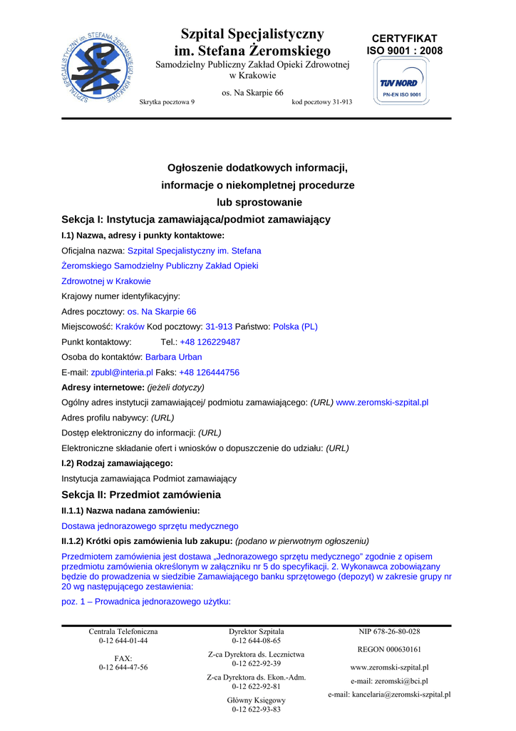 Szpital Specjalistyczny im. Stefana Żeromskiego CERTYFIKAT ISO 9001 : 2008 Samodzielny Publiczny Zakład Opieki Zdrowotnej w Krakowie os. Na Skarpie 66 Skrytka pocztowa 9 kod pocztowy 31-913 Ogłoszenie dodatkowych informacji, informacje o niekompletnej procedurze lub sprostowanie Sekcja I: Instytucja zamawiająca/podmiot zamawiający I.1) Nazwa, adresy i punkty kontaktowe: Oficjalna nazwa: Szpital Specjalistyczny im. Stefana Żeromskiego Samodzielny Publiczny Zakład Opieki Zdrowotnej w Krakowie Krajowy numer identyfikacyjny: Adres pocztowy: os. Na Skarpie 66 Miejscowość: Kraków Kod pocztowy: 31-913 Państwo: Polska (PL) Punkt kontaktowy: _____ Tel.: +48 126229487 Osoba do kontaktów: Barbara Urban E-mail: [email protected] Faks: +48 126444756 Adresy internetowe: (jeżeli dotyczy) Ogólny adres instytucji zamawiającej/ podmiotu zamawiającego: (URL) www.zeromski-szpital.pl Adres profilu nabywcy: (URL) _____ Dostęp elektroniczny do informacji: (URL) _____ Elektroniczne składanie ofert i wniosków o dopuszczenie do udziału: (URL) _____ I.2) Rodzaj zamawiającego: Instytucja zamawiająca Podmiot zamawiający Sekcja II: Przedmiot zamówienia II.1.1) Nazwa nadana zamówieniu: Dostawa jednorazowego sprzętu medycznego II.1.2) Krótki opis zamówienia lub zakupu: (podano w pierwotnym ogłoszeniu) Przedmiotem zamówienia jest dostawa „Jednorazowego sprzętu medycznego” zgodnie z opisem przedmiotu zamówienia określonym w załączniku nr 5 do specyfikacji. 2. Wykonawca zobowiązany będzie do prowadzenia w siedzibie Zamawiającego banku sprzętowego (depozyt) w zakresie grupy nr 20 wg następującego zestawienia: poz. 1 – Prowadnica jednorazowego użytku: Centrala Telefoniczna 0-12 644-01-44 FAX: 0-12 644-47-56 Dyrektor Szpitala 0-12 644-08-65 Z-ca Dyrektora ds. Lecznictwa 0-12 622-92-39 Z-ca Dyrektora ds. Ekon.-Adm. 0-12 622-92-81 Główny Księgowy 0-12 622-93-83 NIP 678-26-80-028 REGON 000630161 www.zeromski-szpital.pl e-mail: [email protected] e-mail: [email protected] średnica 0,035'' - 10 szt średnica 0,025'' – 6 szt. poz. 2 – Protezy polietylenowe do dróg żółciowych 10 Fr, odległość między nacięciami fiksującymi protezę: 30 mm – 2 szt. 50 mm – 10 szt 70 mm – 2 szt 90 mm – 2 szt 120 mm – 1 szt 150 mm – 1 szt. poz. 3. - jednorazowy balon trójkanałowy – 4 szt. CZAS UZUPEŁNIANIA DEPOZYTU 1. czas uzupełnienia depozytu max 24 godzin od telefonicznego zgłoszenia takiej potrzeby przez Zamawiającego. 2. dostarczenie wyrobów medycznych w czasie max 48 godzin od telefonicznego zgłoszenia takiej potrzeby przez Zamawiającego, niezwłocznie potwierdzonego fax-em przez osobę upoważnioną przez Lekarza Kierującego Oddziałem. 3. dostarczenie jednorazowych kompletów operacyjnych z kasetą w czasie max 48 godzin od telefonicznego zgłoszenia takiej potrzeby przez Zamawiającego, niezwłocznie potwierdzonego faxem przez osobę upoważnioną przez Lekarza Kierującego Oddziałem 3. Zamawiający dopuszcza możliwość składania ofert częściowych, gdzie część stanowi grupa 1, grupa 2, grupa 3, grupa 4, grupa 5, grupa 6, grupa 7, grupa 8, grupa 9, grupa 10, grupa 11, grupa 12, grupa 13, grupa 14, grupa 15, grupa 16, grupa 17, grupa 18, grupa 19, grupa 20. Oferty nie zawierające pełnego asortymentu określonego w grupie zostaną odrzucone. Zamawiający zastrzega sobie prawo zamówienia mniejszej ilości materiałów medycznych niż określone w załączniku nr 1 do specyfikacji, w przypadku zmniejszenia się jego zapotrzebowania. 4. Zamawiający nie dopuszcza możliwości złożenia ofert wariantowych. 5. Zamawiający nie przewiduje udzielenia zamówienia dodatkowego. 6. Zamawiający nie przewiduje zamówień uzupełniających i zawarcia umowy ramowej. 7. Zamawiający nie przewiduje przeprowadzenia aukcji elektronicznej i stosowania dynamicznego systemu zakupów. 8. Zamawiający nie przewiduje rozliczenia w walutach obcych. 9. Warunki dodatkowe dotyczące przedmiotu zamówienia: - okres ważności przedmiotu zamówienia: nie krótszy niż 12 miesiące od daty dostawy 10. Dla wszystkich oferowanych grup należy dołączyć do oferty katalogi producenta zawierające pełną informację o parametrach oferowanego wyrobu w języku polskim . 11.Wykonawca ubiegający się o udzielenie zamówienia zobowiązany jest dostarczyć Zamawiającemu partię próbną po 2 szt. z każdej pozycji asortymentowej opisanej w grupie nr1-3, 5-6 12. Oferowane wyroby medyczne, muszą spełniać wymagania odpowiednich norm, przepisów Unii Europejskiej oraz ustawy z dnia 20 maja 2010 r. o wyrobach medycznych (Dz. U. Nr 107 poz. 679), tj. posiadają wpisy i świadectwa wydane przez uprawnione organy : a) deklarację zgodności CE producenta (dotyczy wszystkich klas wyrobu medycznego) b) certyfikat jednostki notyfikującej (dotyczy klasy wyrobu medycznego: I sterylna, I z funkcją pomiarową, IIa, Iib, III) c) zgłoszenie/powiadomienie/wniosek do Prezesa Urzędu Rejestracji Produktów Leczniczych, Wyrobów Medycznych i Produktów Biobójczych. 13. W przypadku produktów, które nie podlegają przepisom ustawy z dnia 20 maja 2010 r. o wyrobach medycznych (Dz. U. Nr 107 poz. 679), Wykonawca zobowiązany jest posiadać inne odpowiednie dokumenty dopuszczające te produkty do obrotu i stosowania. 14. Dodatkowo dla grup 1-8 Aktualna pozytywna opinia kliniczna na stosowanie preparatu na oddziałach chirurgicznych 15. Zamawiający żąda wskazania przez Wykonawcę w ofercie części zamówienia, której wykonanie powierzy podwykonawcom (art. 36 ust. 4 ustawy). 16. Zamawiający nie przewiduje zwrotu kosztów udziału w postępowaniu. 17. Wykonawca może złożyć tylko 1 ofertę. 18. Zamawiający nie zamierza zwołać zebrania Wykonawców. 19. Zamawiający dopuszcza możliwość złożenia ofert równoważnych w oparciu o art. 29 ust. 3 ustawy. Za równoważny przedmiot zamówienia Zamawiający uzna przedmiot o parametrach nie gorszych niż wskazane w specyfikacji. II.1.3) Wspólny 